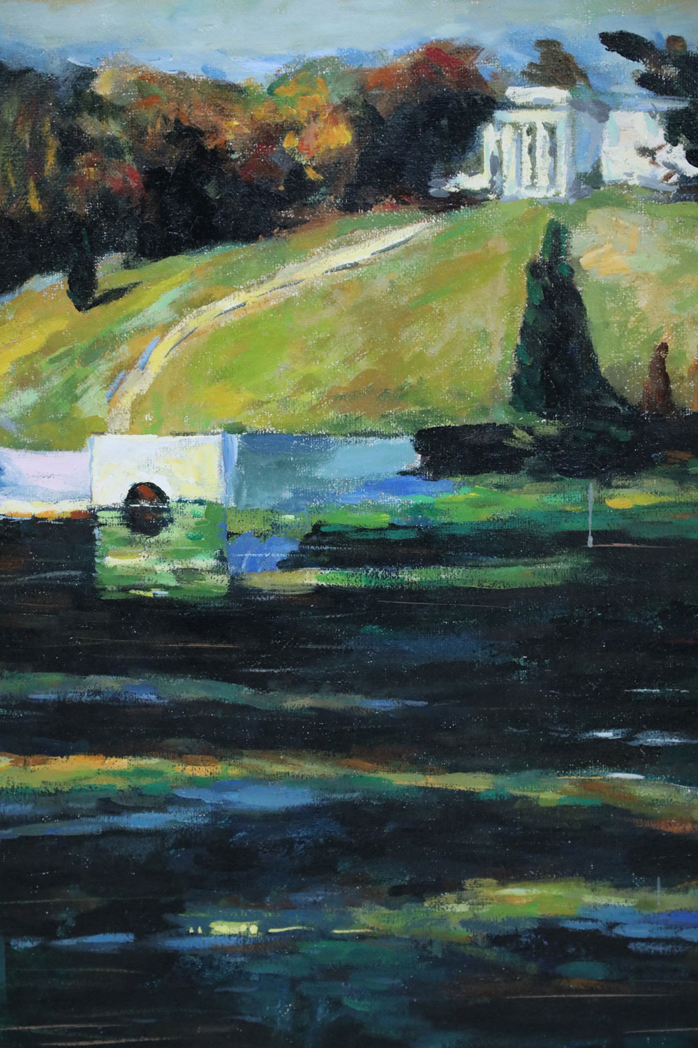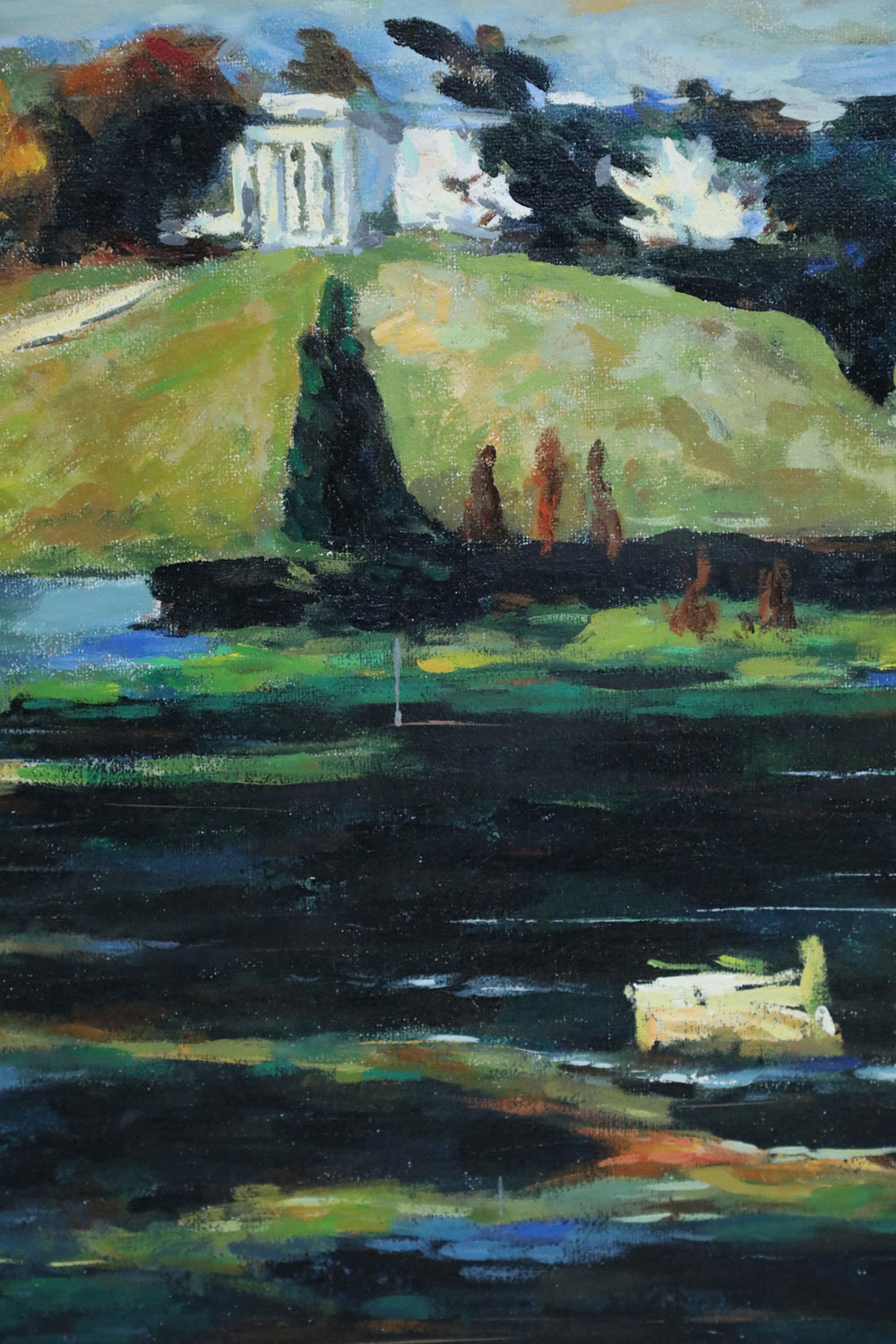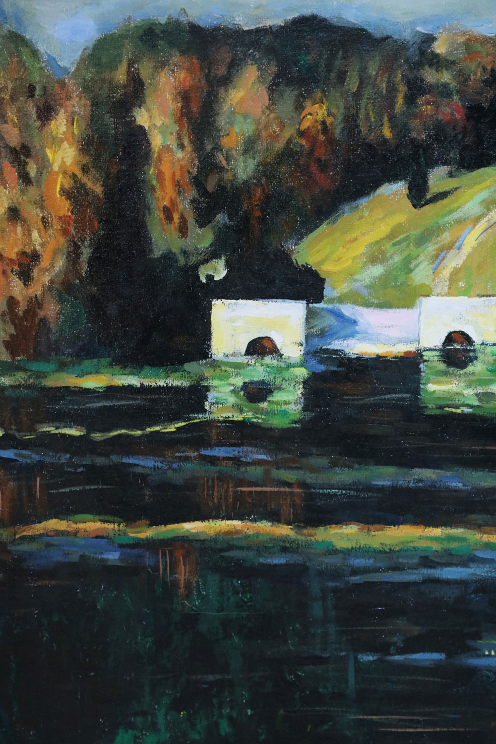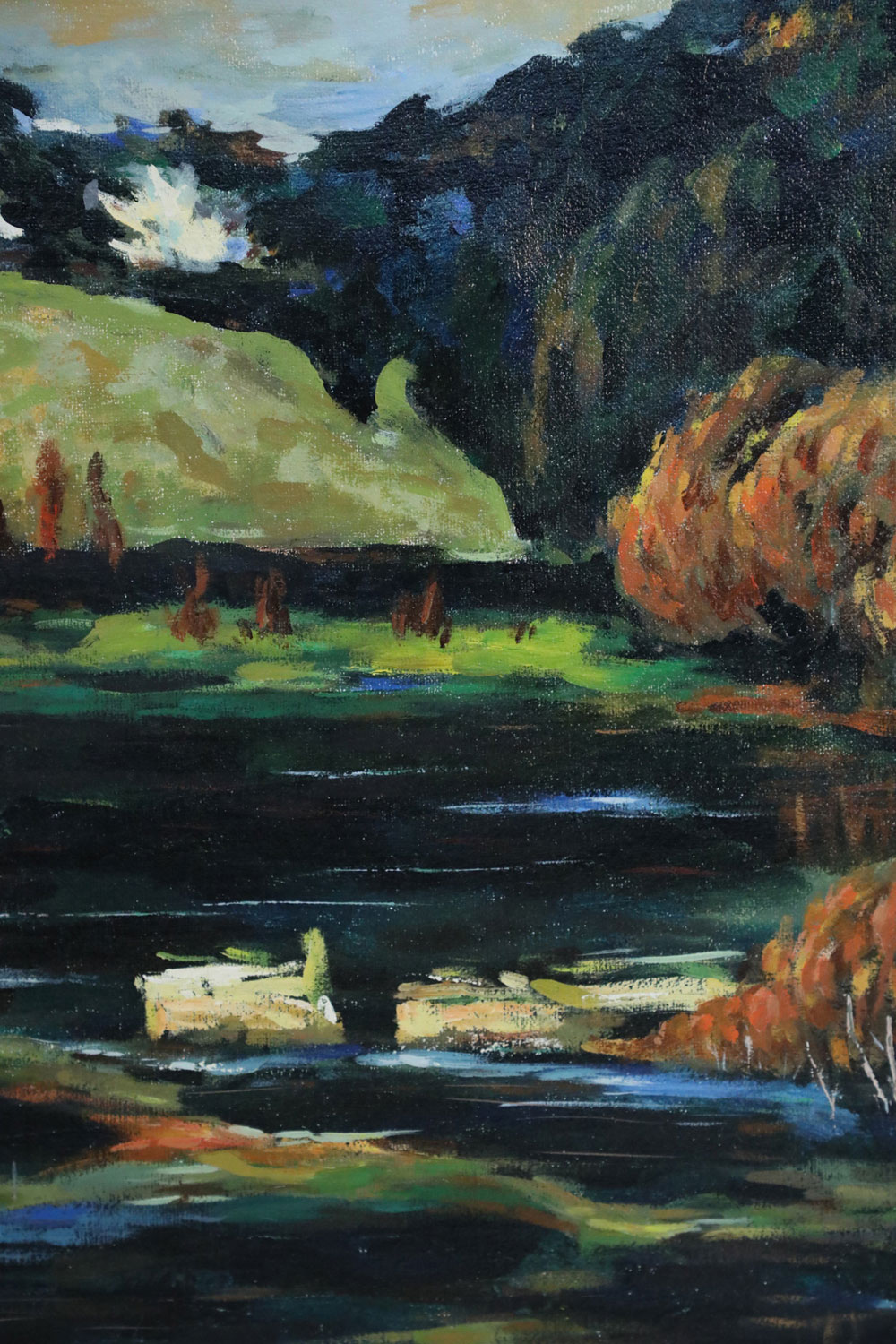Mid-Century acrylic landscape painting of a reflective lake in the foreground surrounded by white stone buildings with a hilltop in the background surrounded by autumn trees on canvas in a rectangular black painted wooden frame.