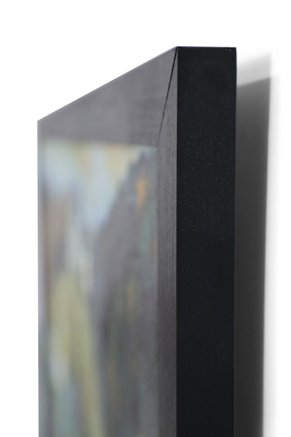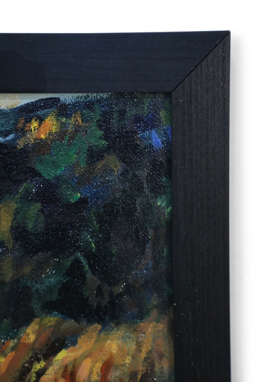 Mid-Century acrylic landscape painting of a reflective lake in the foreground surrounded by white stone buildings with a hilltop in the background surrounded by autumn trees on canvas in a rectangular black painted wooden frame..