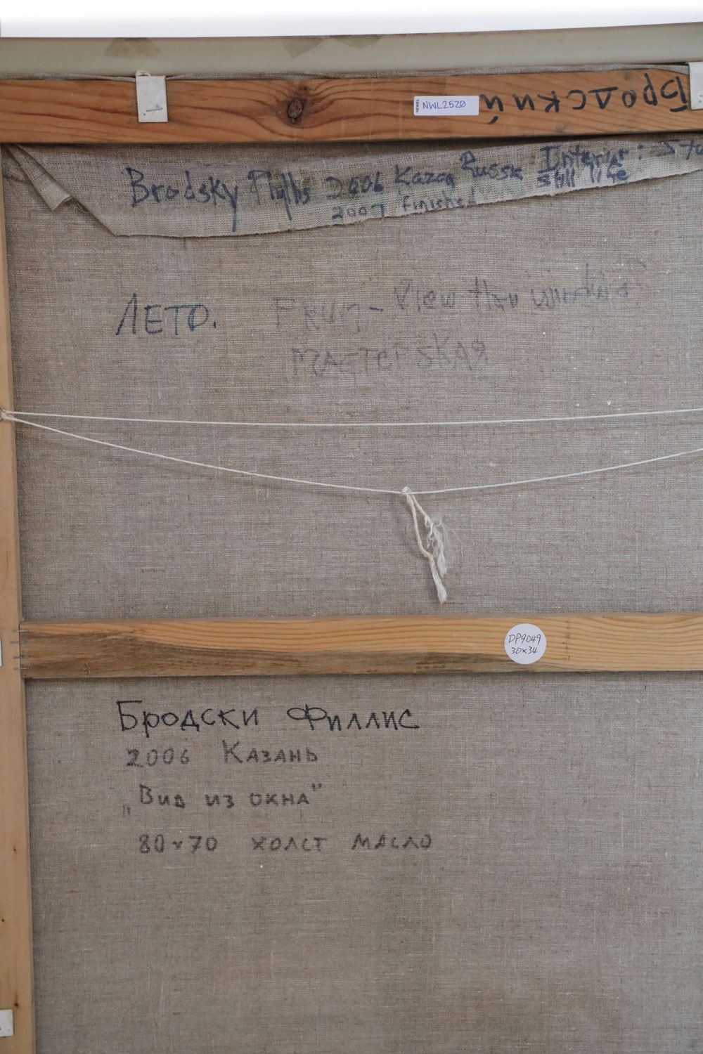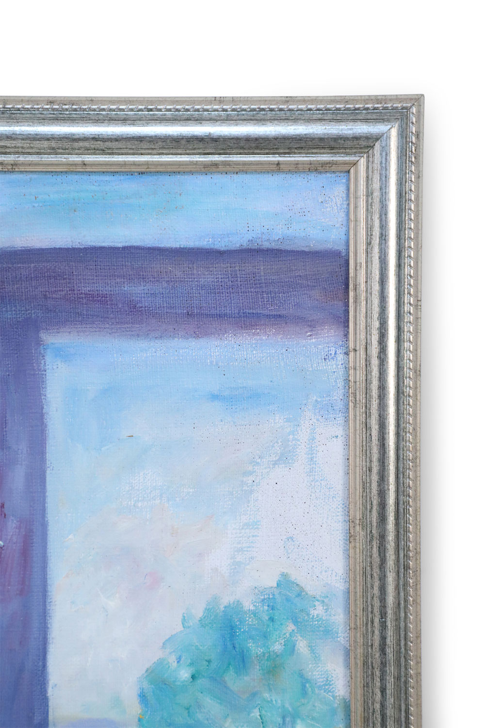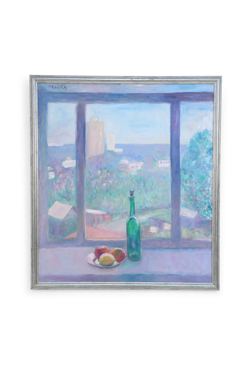 Mid-Century acrylic still life painting depicting a wine bottle and a plate of fruit on a windowsill in the foreground, overlooking a garden and village scene through the window beyond on rectangular canvas in an antiqued silver painted frame..