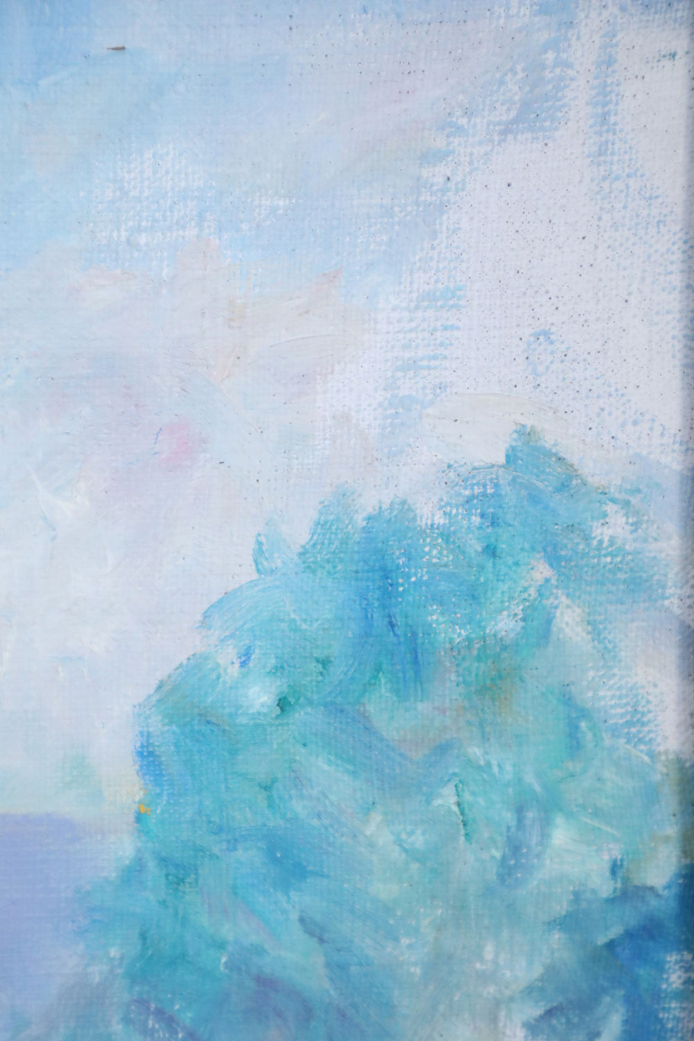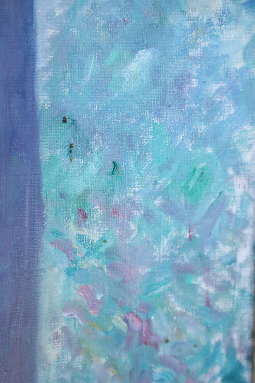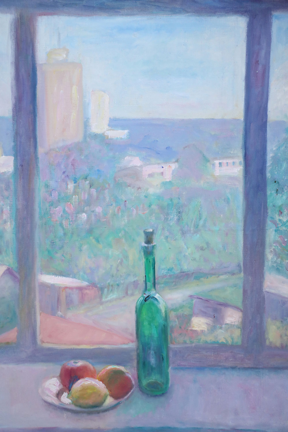 Framed Acrylic Still Life Painting of a Wine Bottle and Fruit on a Windowsill Overlooking a Garden