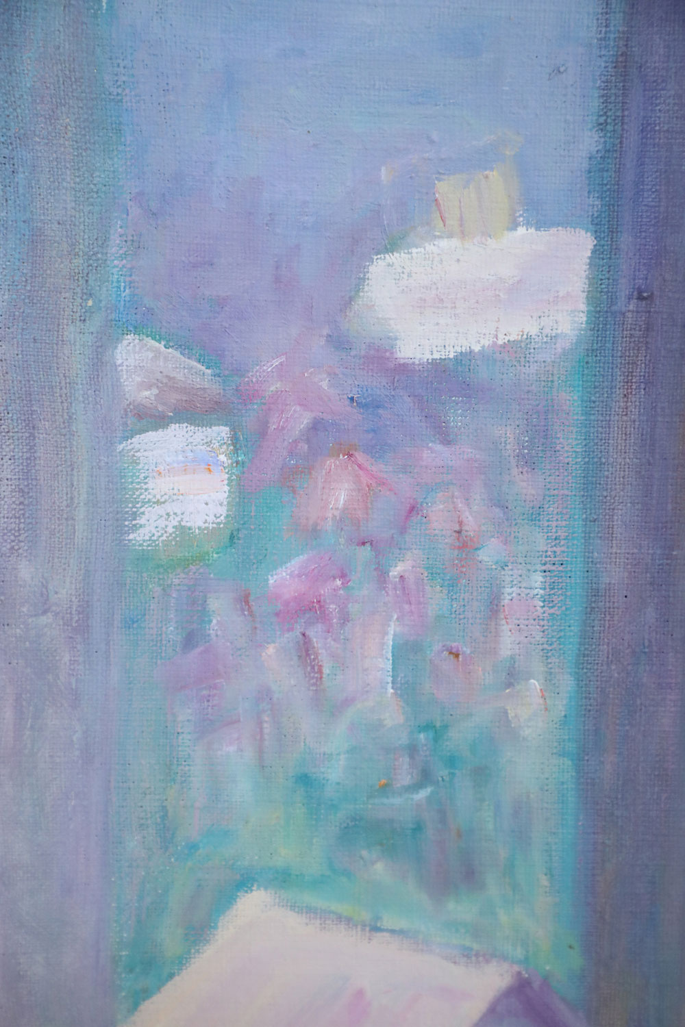 Mid-Century acrylic still life painting depicting a wine bottle and a plate of fruit on a windowsill in the foreground, overlooking a garden and village scene through the window beyond on rectangular canvas in an antiqued silver painted frame.