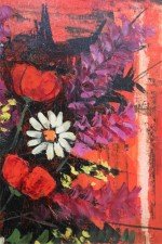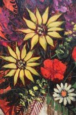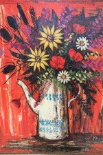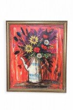 Framed Bold Still Life Oil Painting of a Teapot Filled with Wildflowers