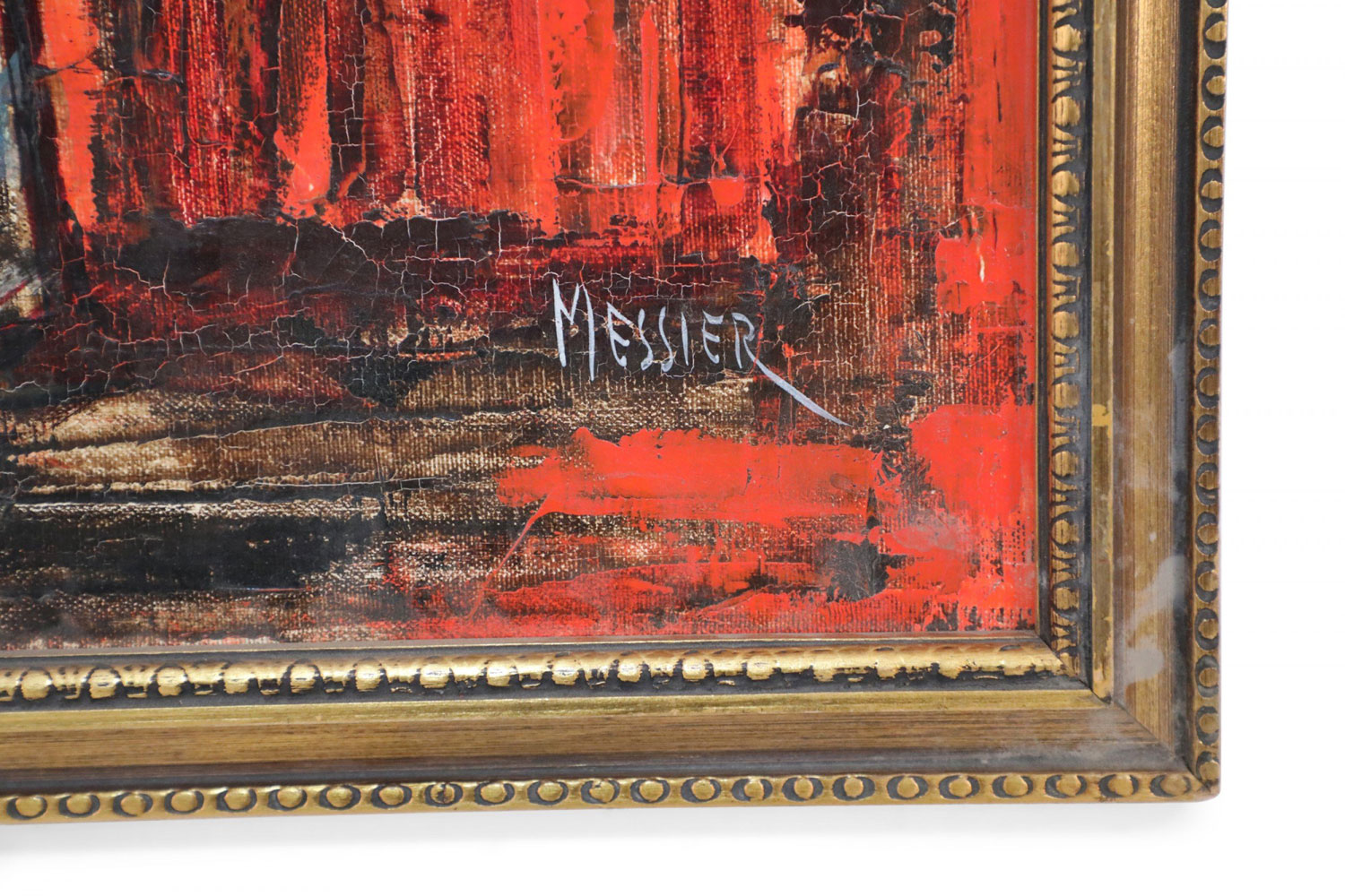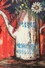 Contemporary still life oil painting of a bouquet of wildflowers and thistles inside a blue and white teapot against a bold graphic red and black background on canvas in a rectangular carved giltwood frame. (signed, MESSIER).