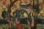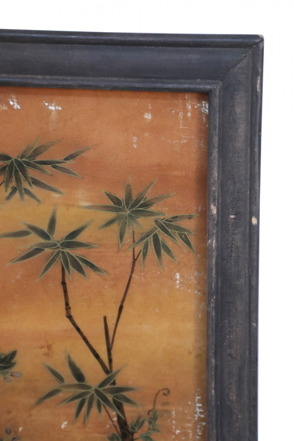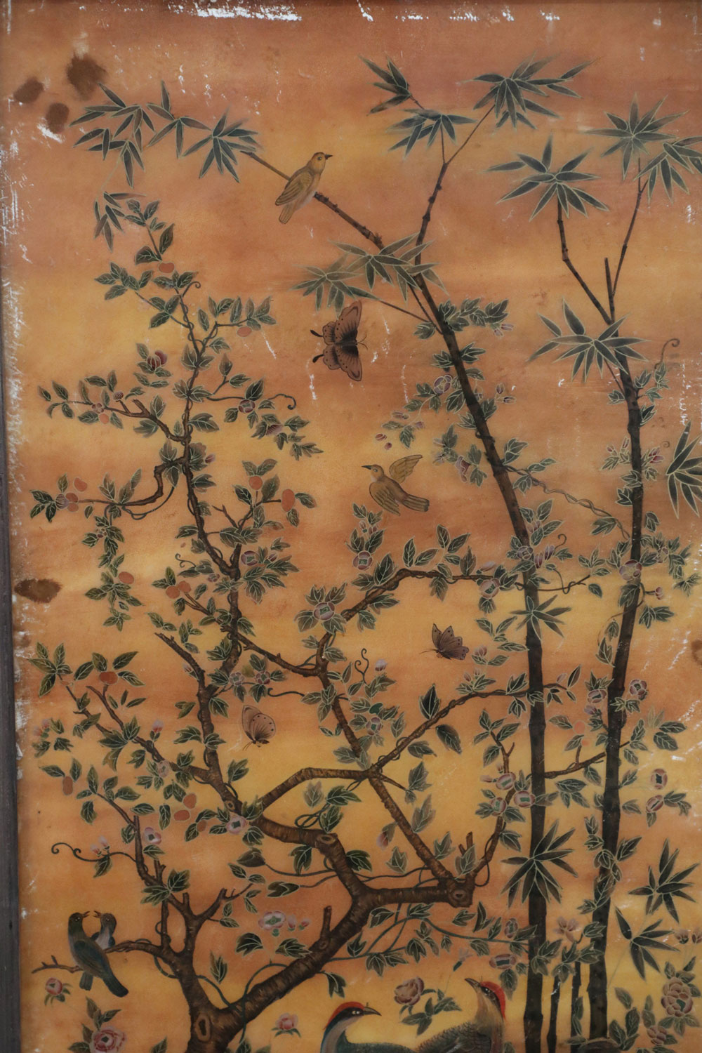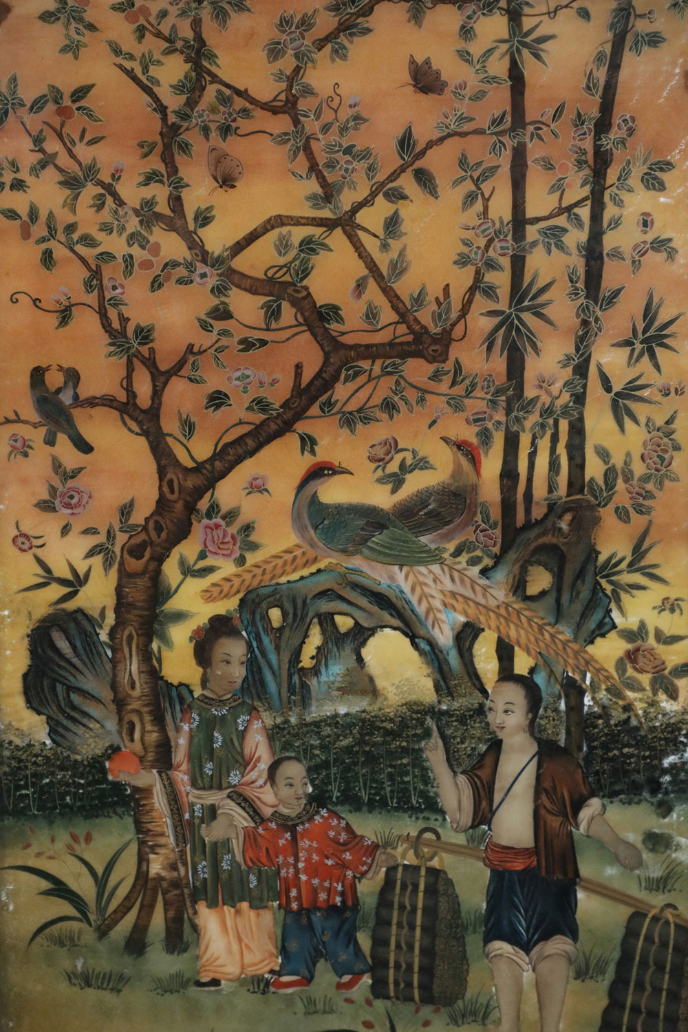 Chinese (18th/19th Century) framed glass back painting depicting a family gathering fruit beneath two trees surrounded by birds and butterflies in a wooden frame with decorative metal top hanging hook. (Companion piece: NWL2516)