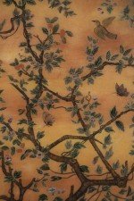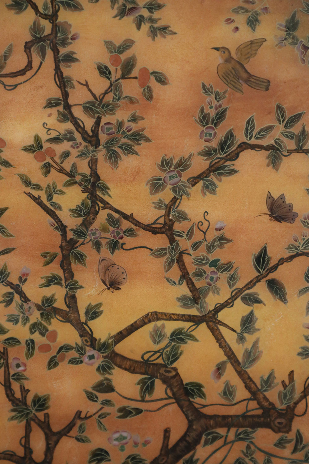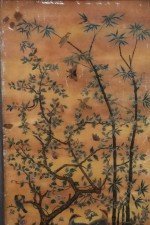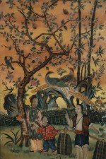 Chinese (18th/19th Century) framed glass back painting depicting a family gathering fruit beneath two trees surrounded by birds and butterflies in a wooden frame with decorative metal top hanging hook. (Companion piece: NWL2516).