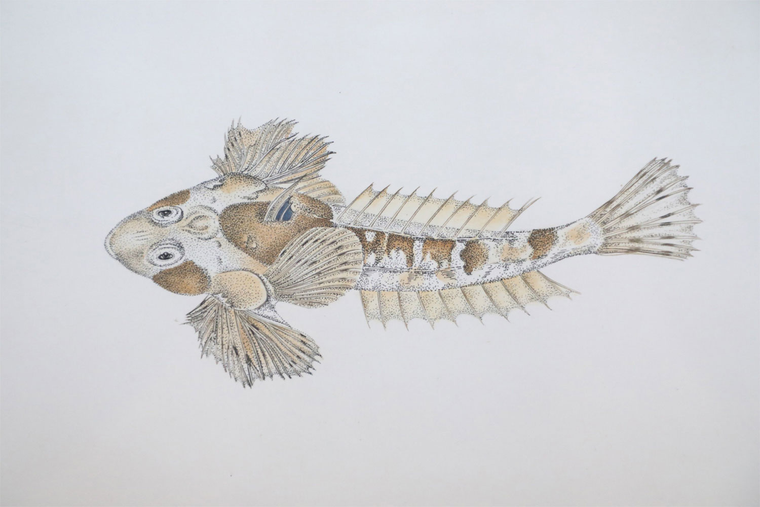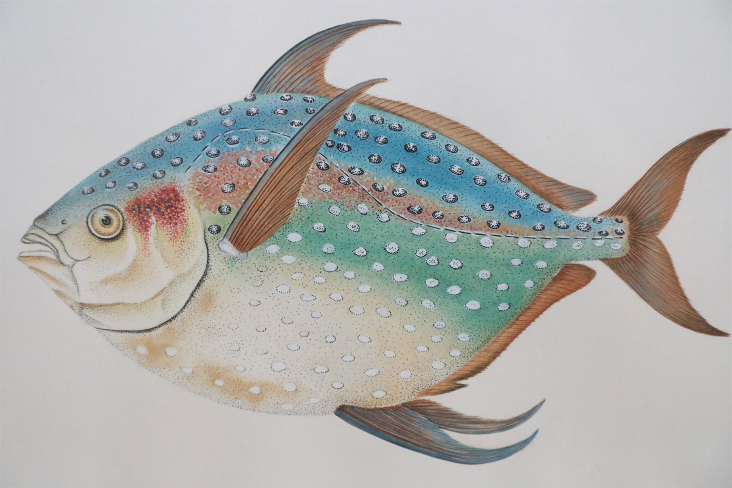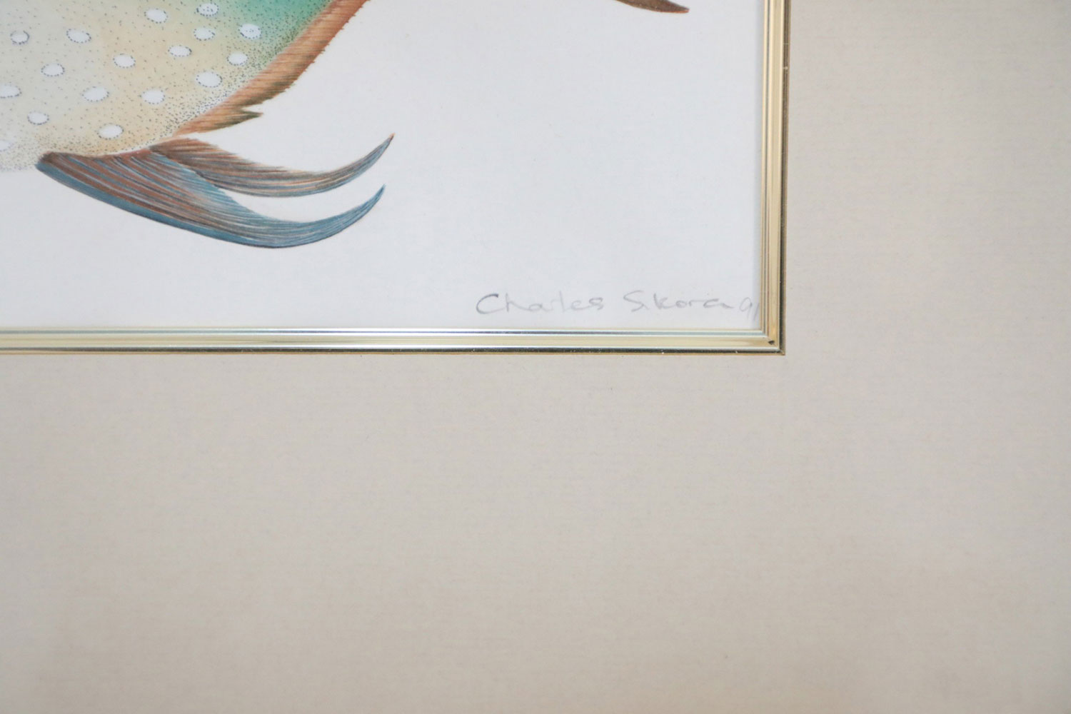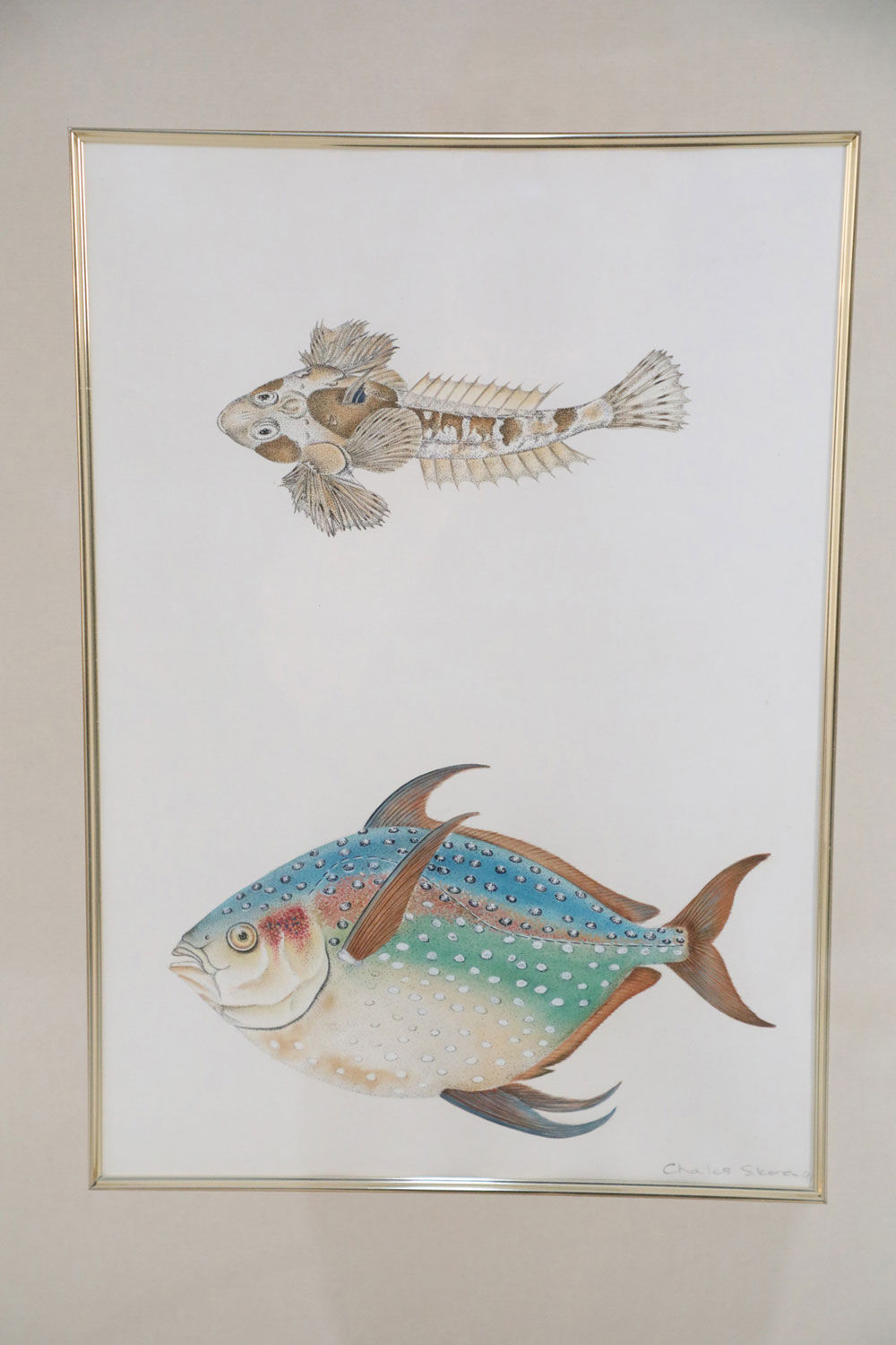English Victorian style lithograph of two tropical fish, one small and brown, one larger and multi-colored in a beige mat with gold bevel and a rectangular giltwood frame. (signed, Charles Skora, #9) (Companion piece: NWL2522)