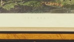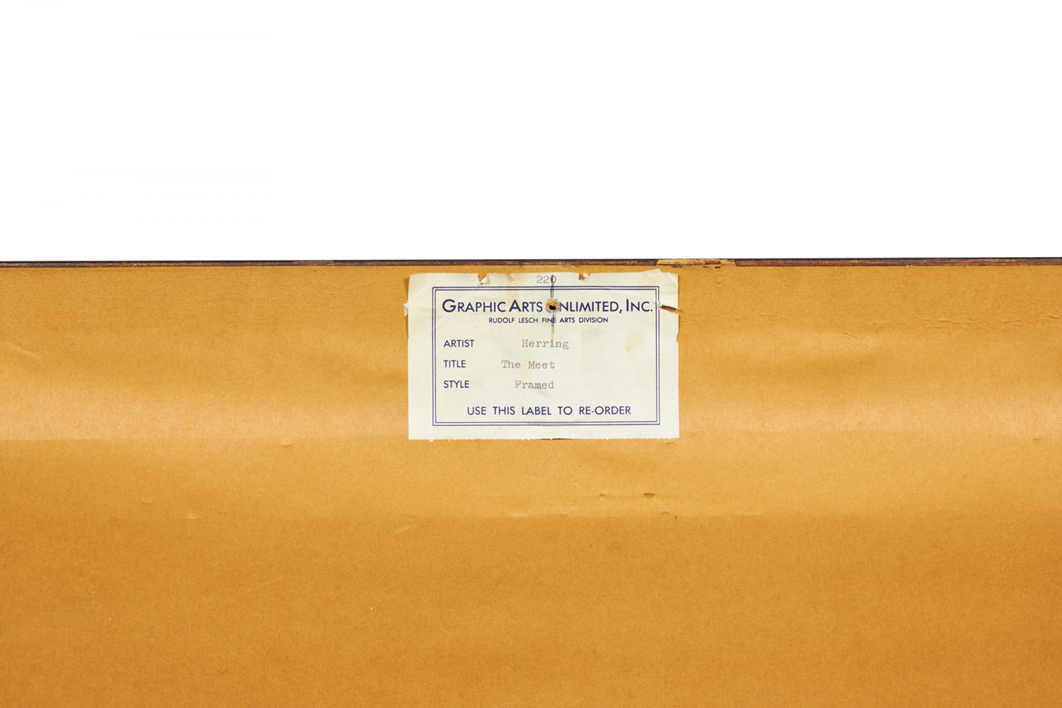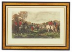 English Victorian-style lithograph print of men on horseback gathering in a field on either side of a small stream in preparation for a hunt in a rectangular wooden frame and beige mat. (similar items 062902-062921).