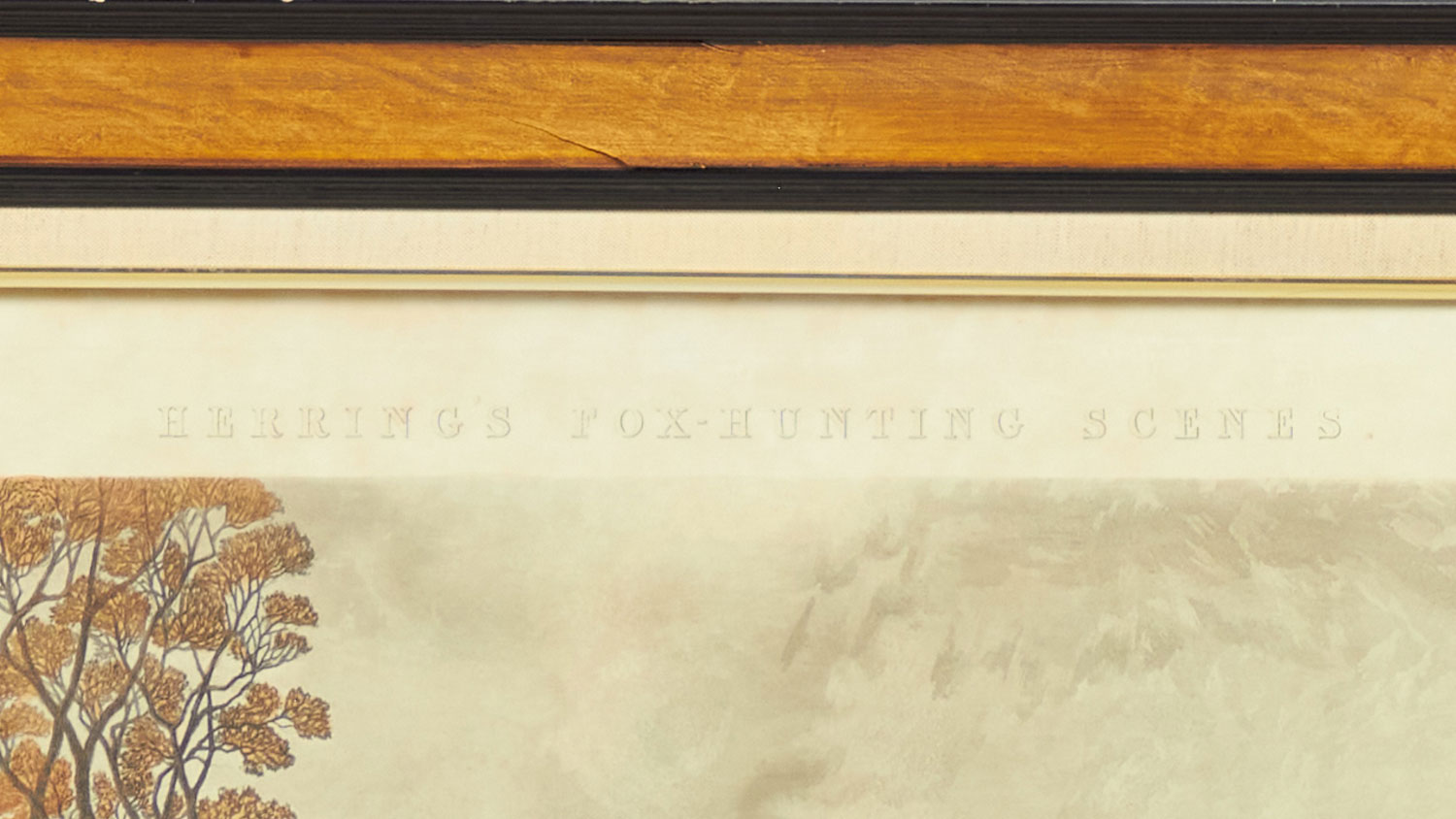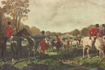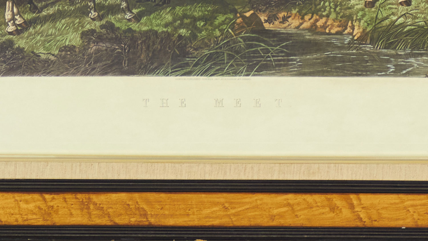 English Victorian-style lithograph print of men on horseback gathering in a field on either side of a small stream in preparation for a hunt in a rectangular wooden frame and beige mat. (similar items 062902-062921)
