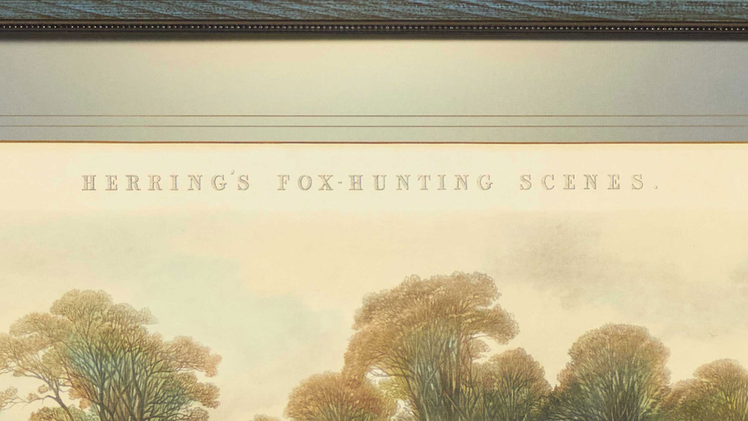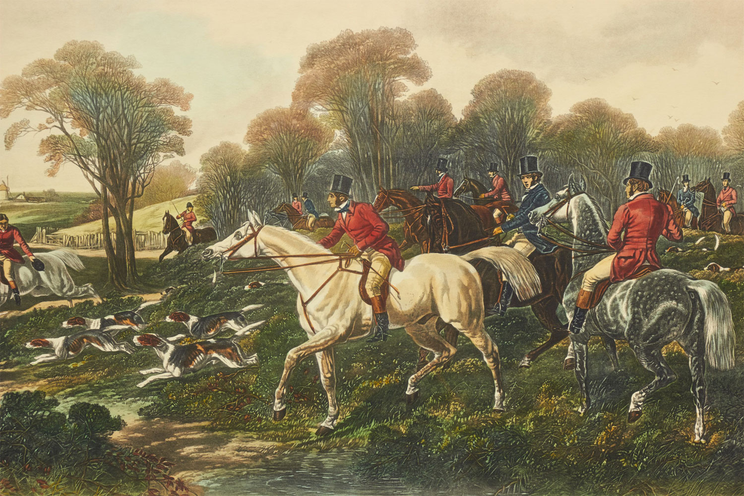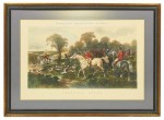 Framed English Victorian Lithograph of a Hunting Party of Men, Horses, and Dogs