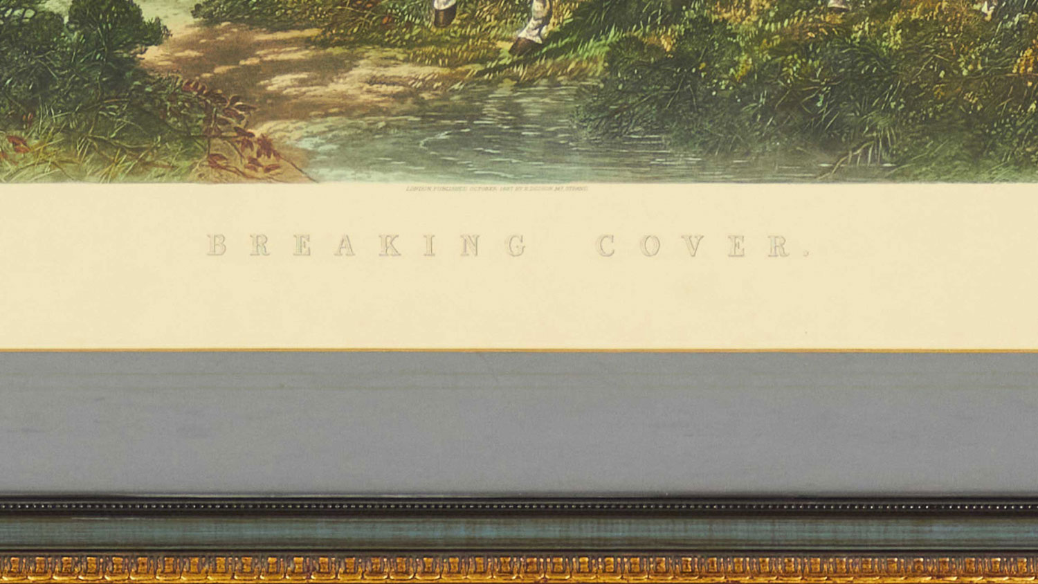 English Victorian-style lithograph print of a hunting scene of men on horseback flanked by hunting dogs rushing across the landscape after their quarry in a rectangular wooden frame and dark blue mat. (similar items 062902-062921)