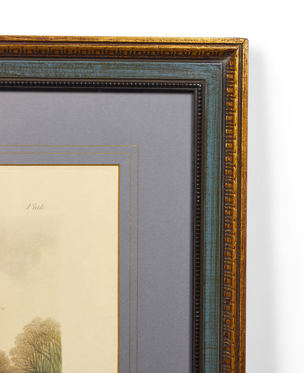 English Victorian-style lithograph print of a hunting scene of men on horseback flanked by hunting dogs rushing across the landscape after their quarry in a rectangular wooden frame and dark blue mat. (similar items 062902-062921).