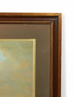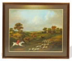 English Victorian-style print of a painting of hunters on horseback following dogs in the midst of a hunt through a pastoral landscape with a cottage in the background in a rectangular wooden frame and dark green mat. (similar items 062902-062921).