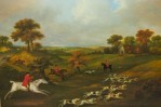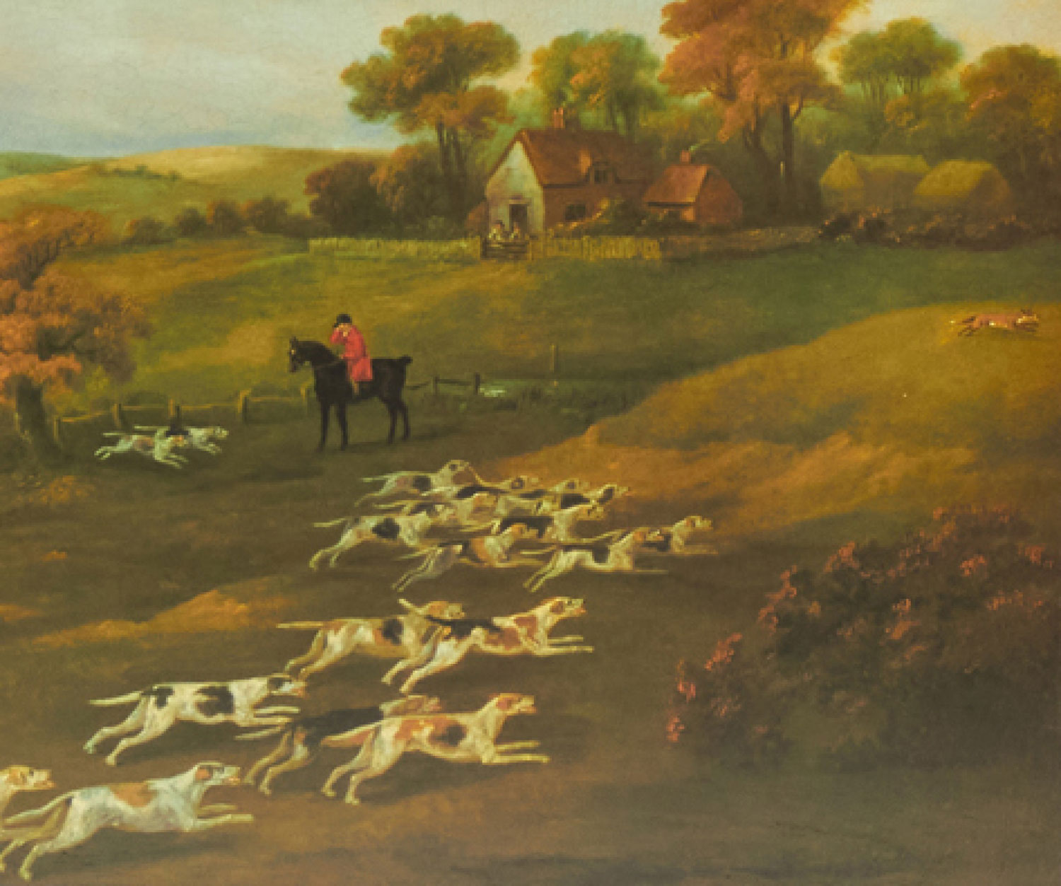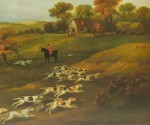 English Victorian-style print of a painting of hunters on horseback following dogs in the midst of a hunt through a pastoral landscape with a cottage in the background in a rectangular wooden frame and dark green mat. (similar items 062902-062921)