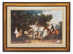 English Victorian-style print of a painting of a group of men in tricorn hats and a lady in a carriage with horses and a dog enjoying a journey through the woods in a rectangular wooden frame and beige mat. (similar items 062902-062921).