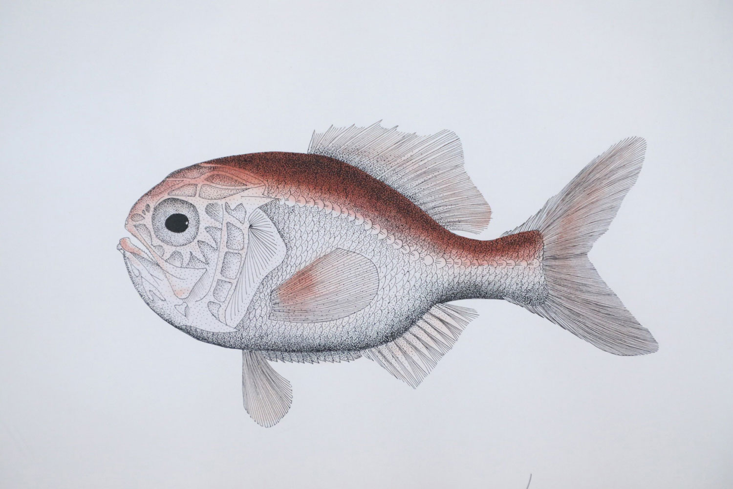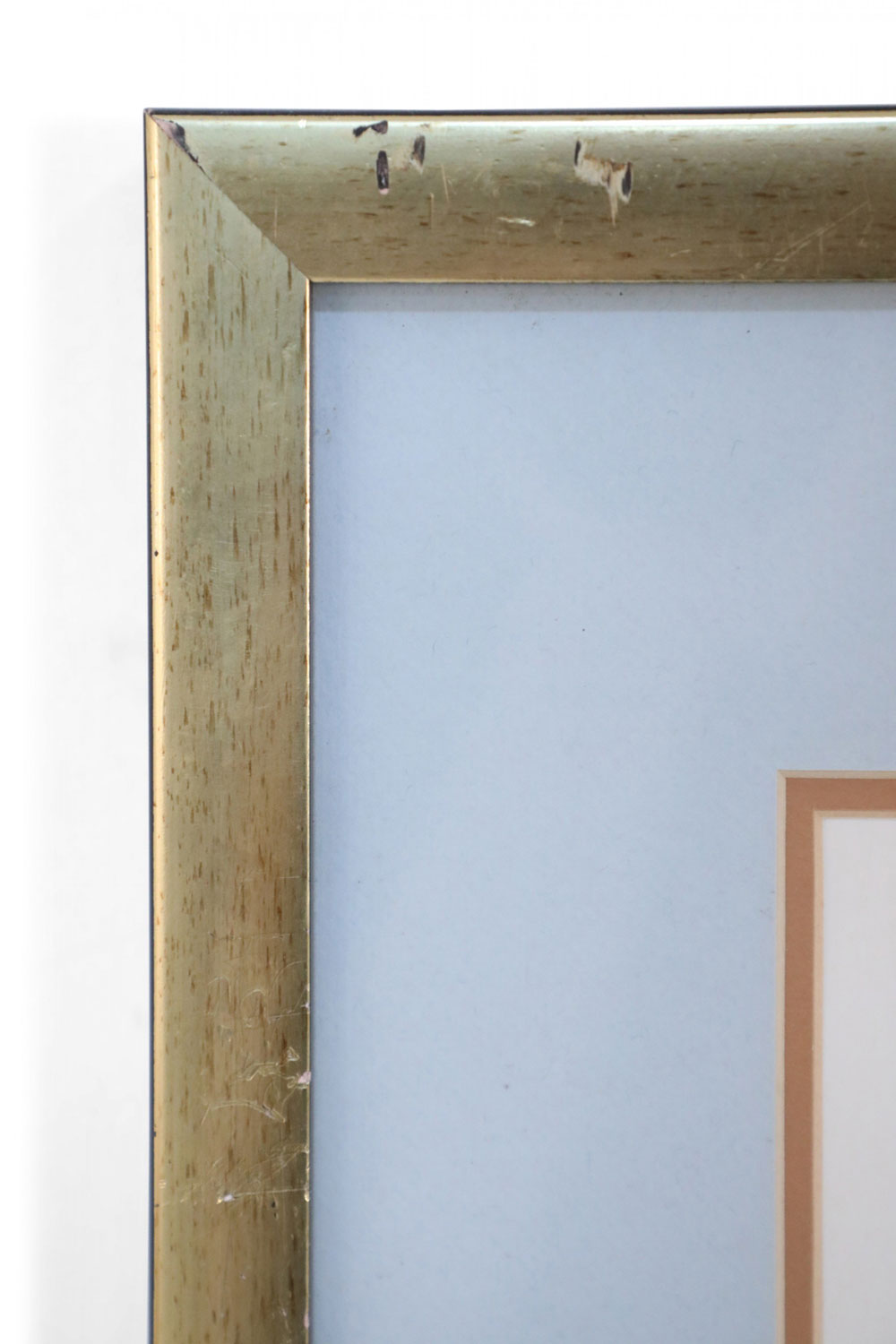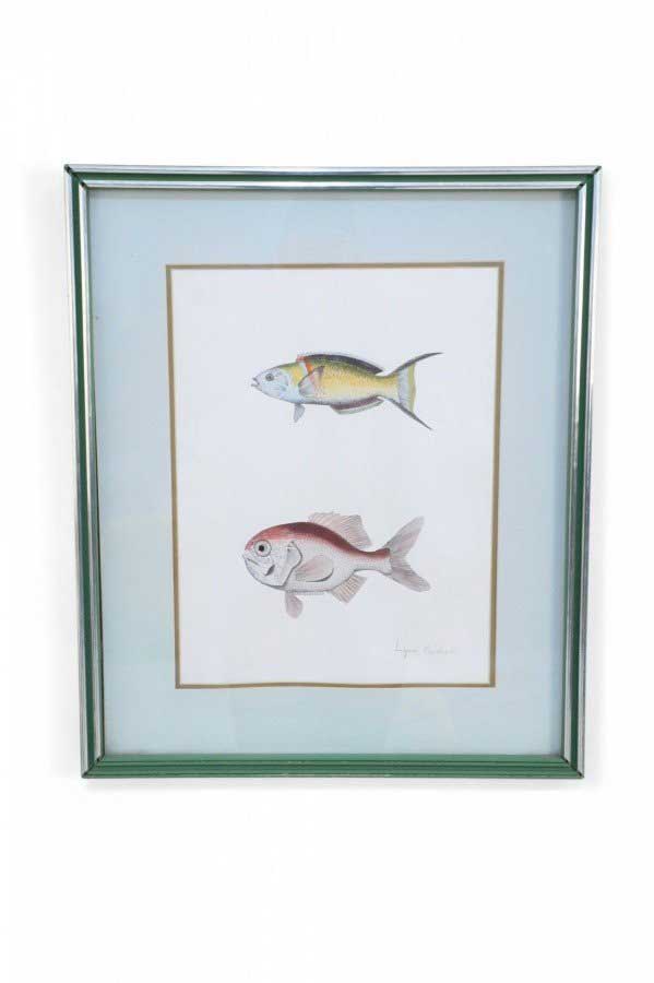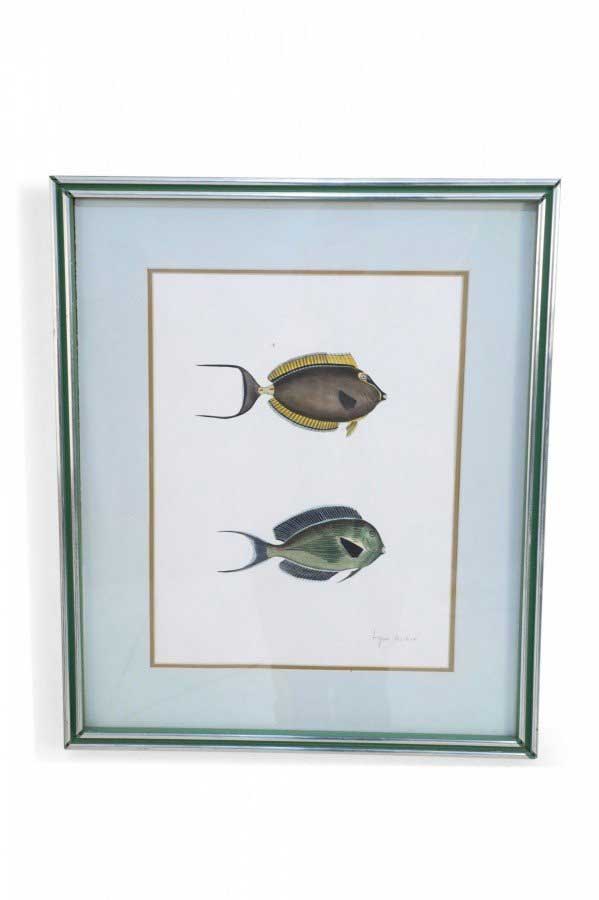 English Victorian style lithograph of two multi-colored tropical fish in profile in a taupe and light blue double mat and a rectangular silver and green frame. (signed, LYNN BAKER) (Available in green/silver frame: NWL2508)