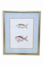 English Victorian style lithograph of two multi-colored tropical fish in profile in a taupe and light blue double mat and a rectangular silver and green frame. (signed, LYNN BAKER) (Available in green/silver frame: NWL2508).