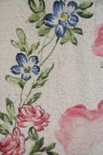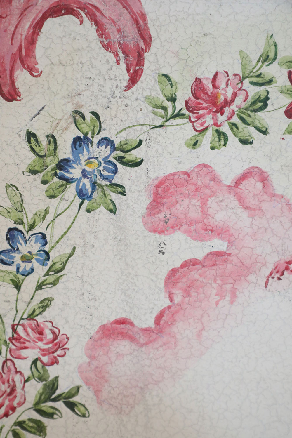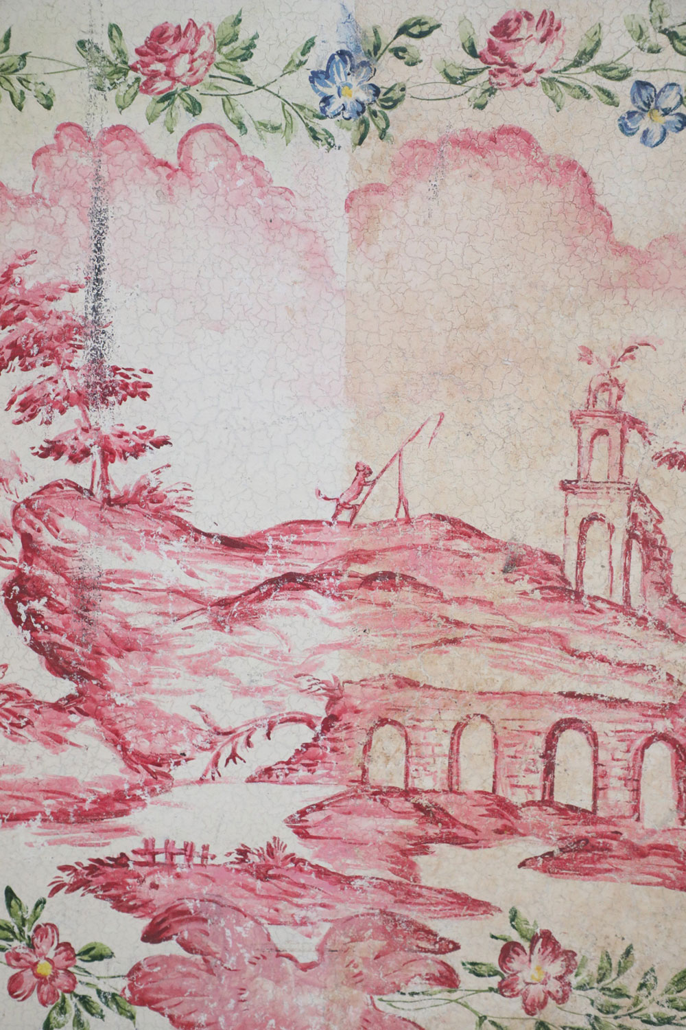 Chinese partially distressed painted panel in green and pink against a crackle beige background depicting a landscape with trees and architecture inside a floral border.