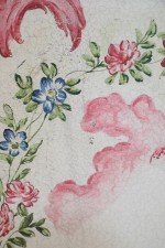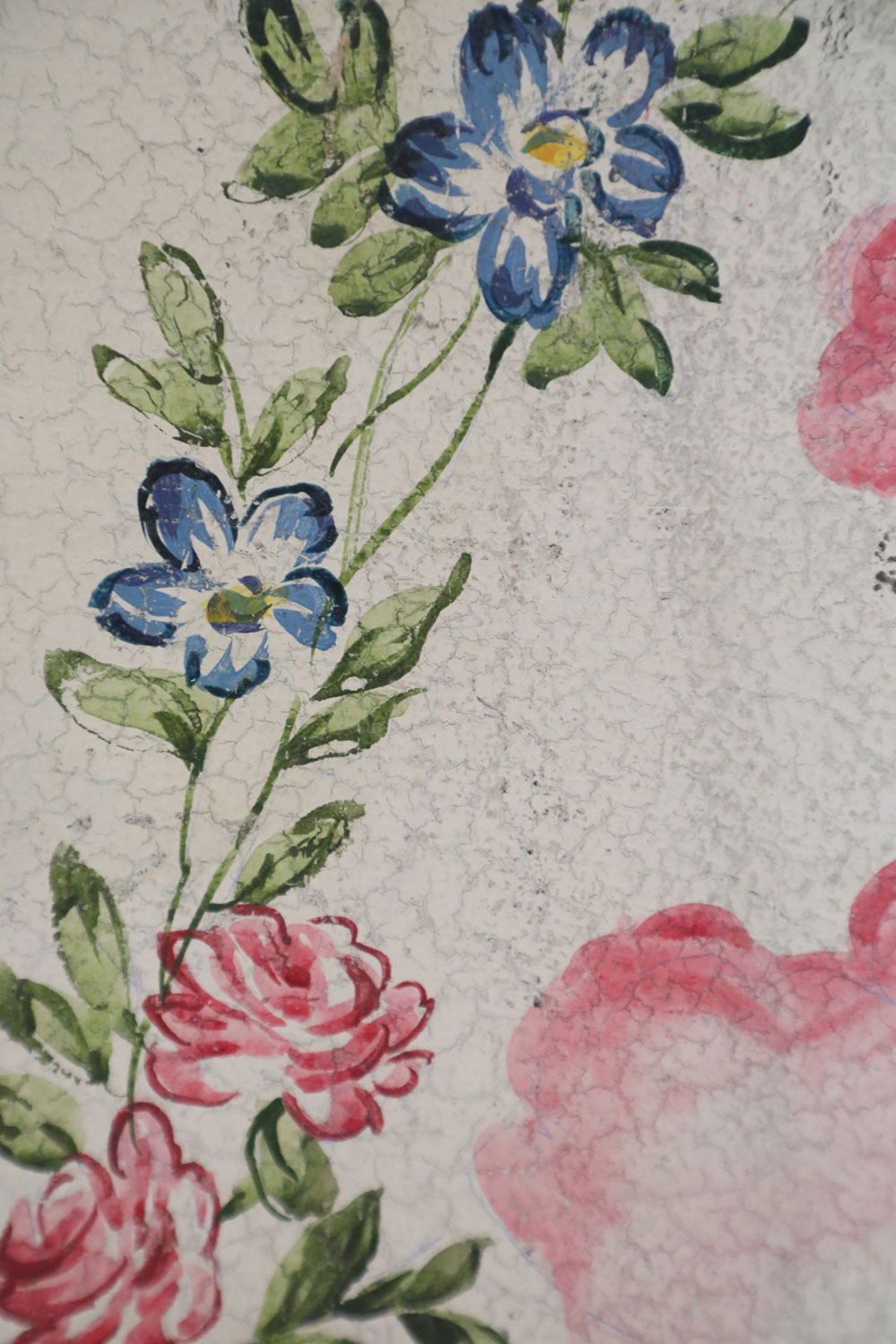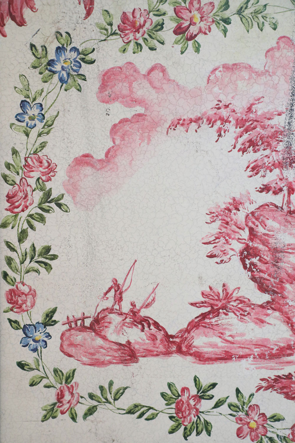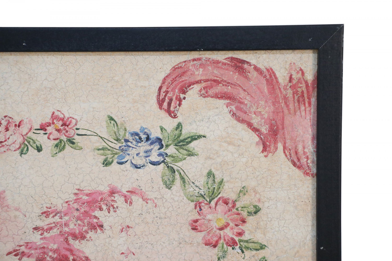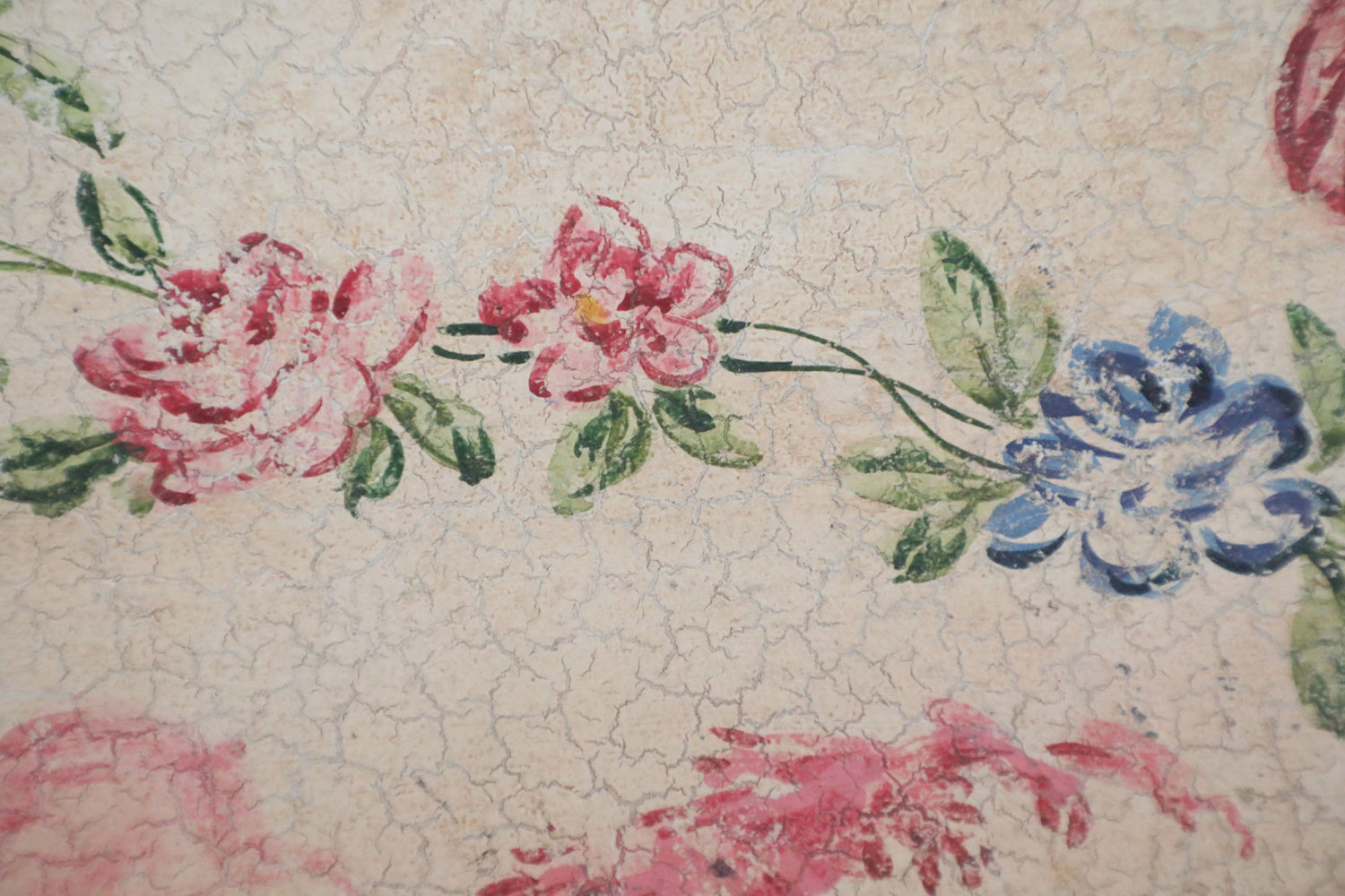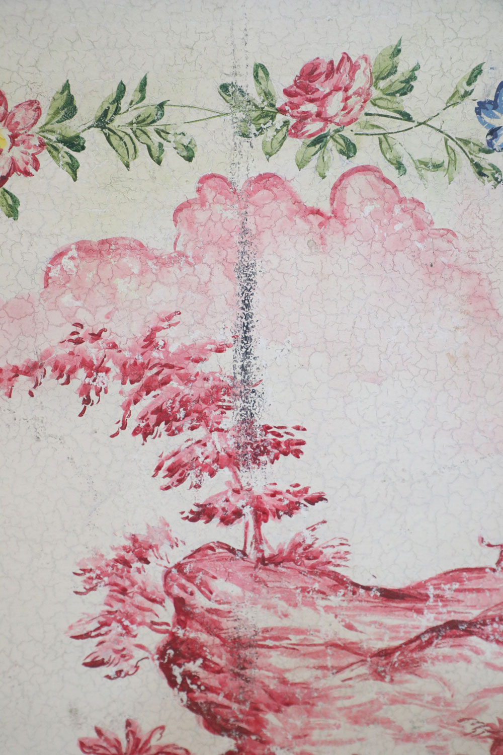 Chinese partially distressed painted panel in green and pink against a crackle beige background depicting a landscape with trees and architecture inside a floral border..