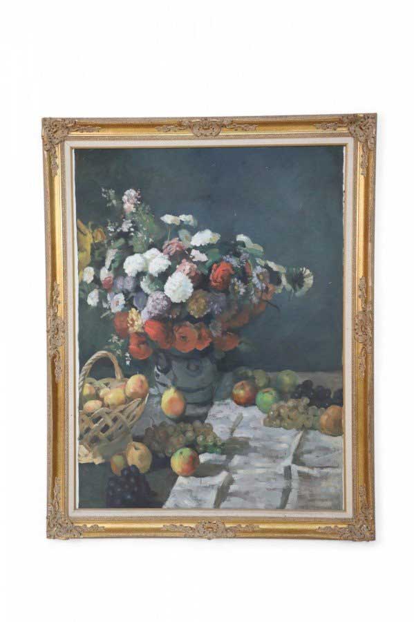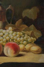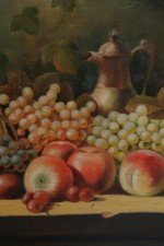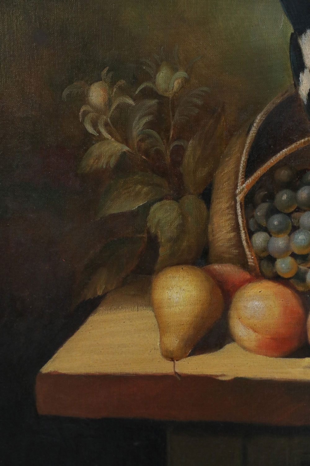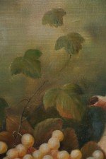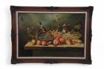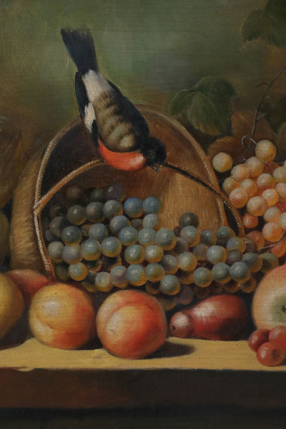 Framed Still Life Oil Painting of a Bounty of Grapes and Fruit with a Perching Robin
