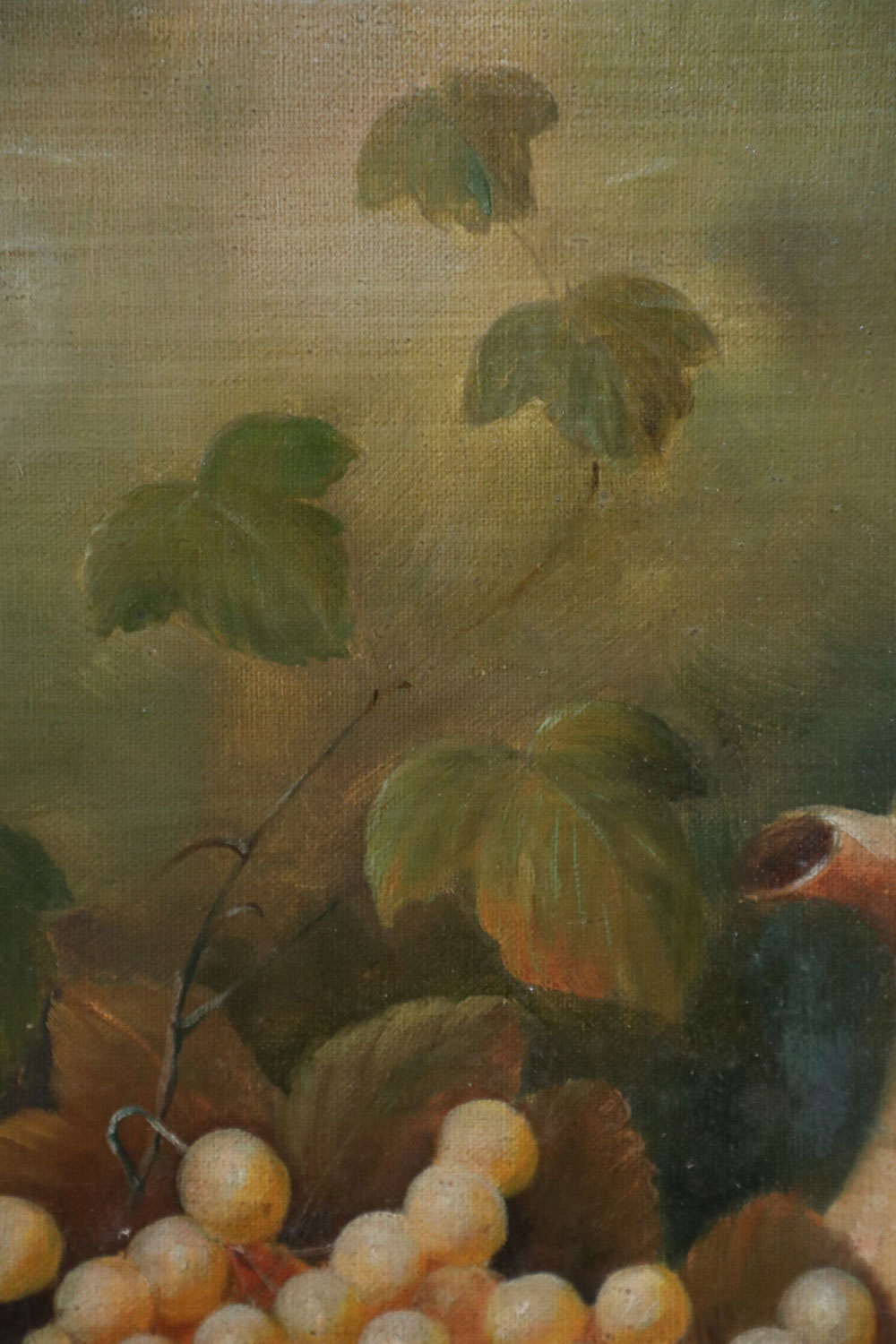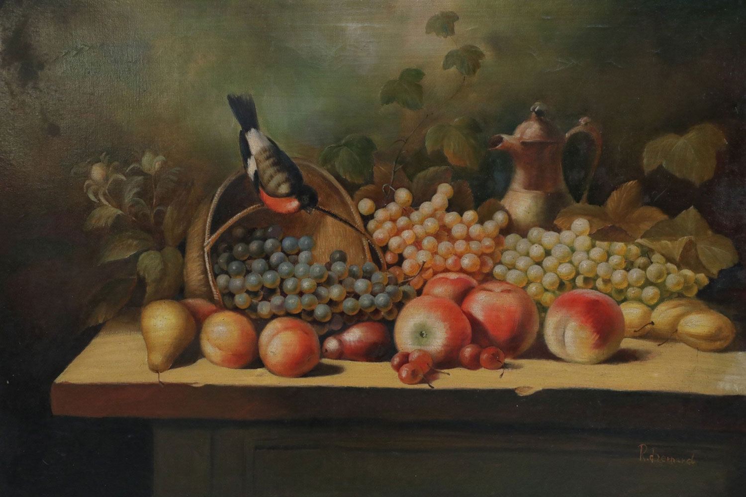 Italian Neo-classic style (20th Century) still life oil painting depicting a wooden table laden with a variety of grapes and fruit backed by a pitcher and ivy and a robin perching on an upturned basket on rectangular canvas in a carved and stained wooden frame..