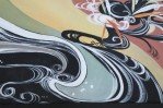 Contemporary acrylic on canvas abstract painting of black and warm toned multi-colored swirls and waves interspersed with florals, leaves, and fans in a rectangular black painted wooden frame. (Companion piece: NWL2533).