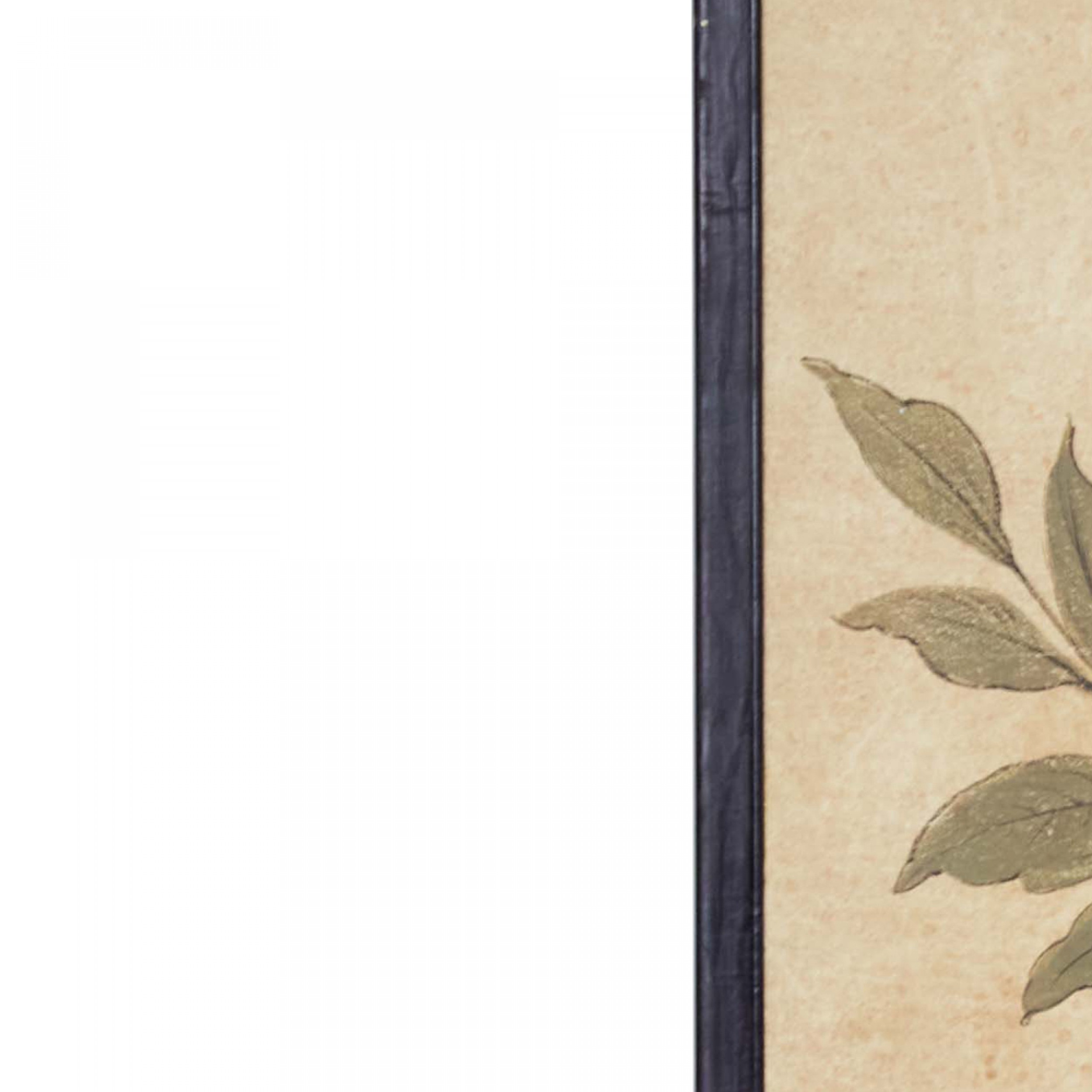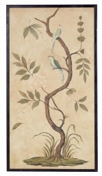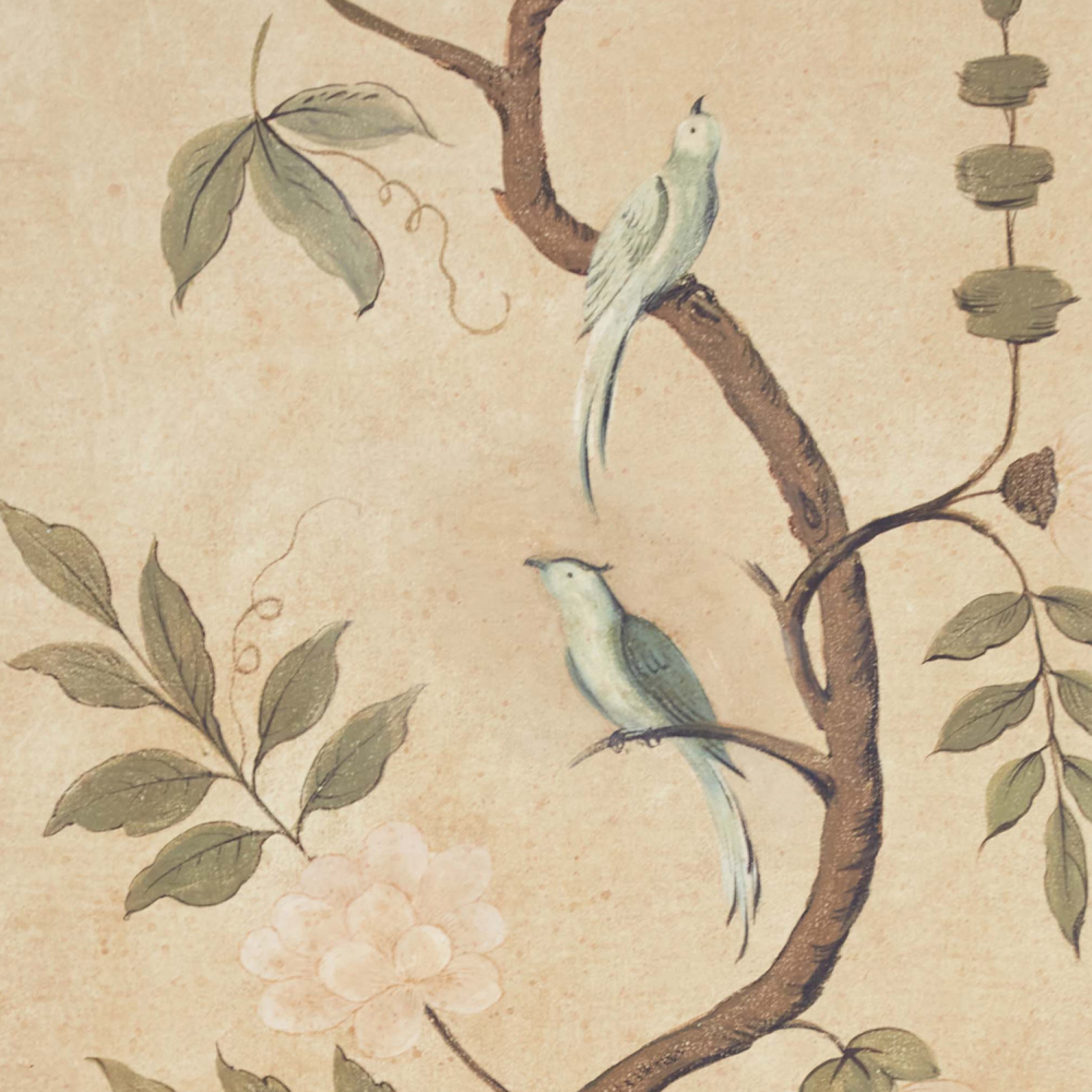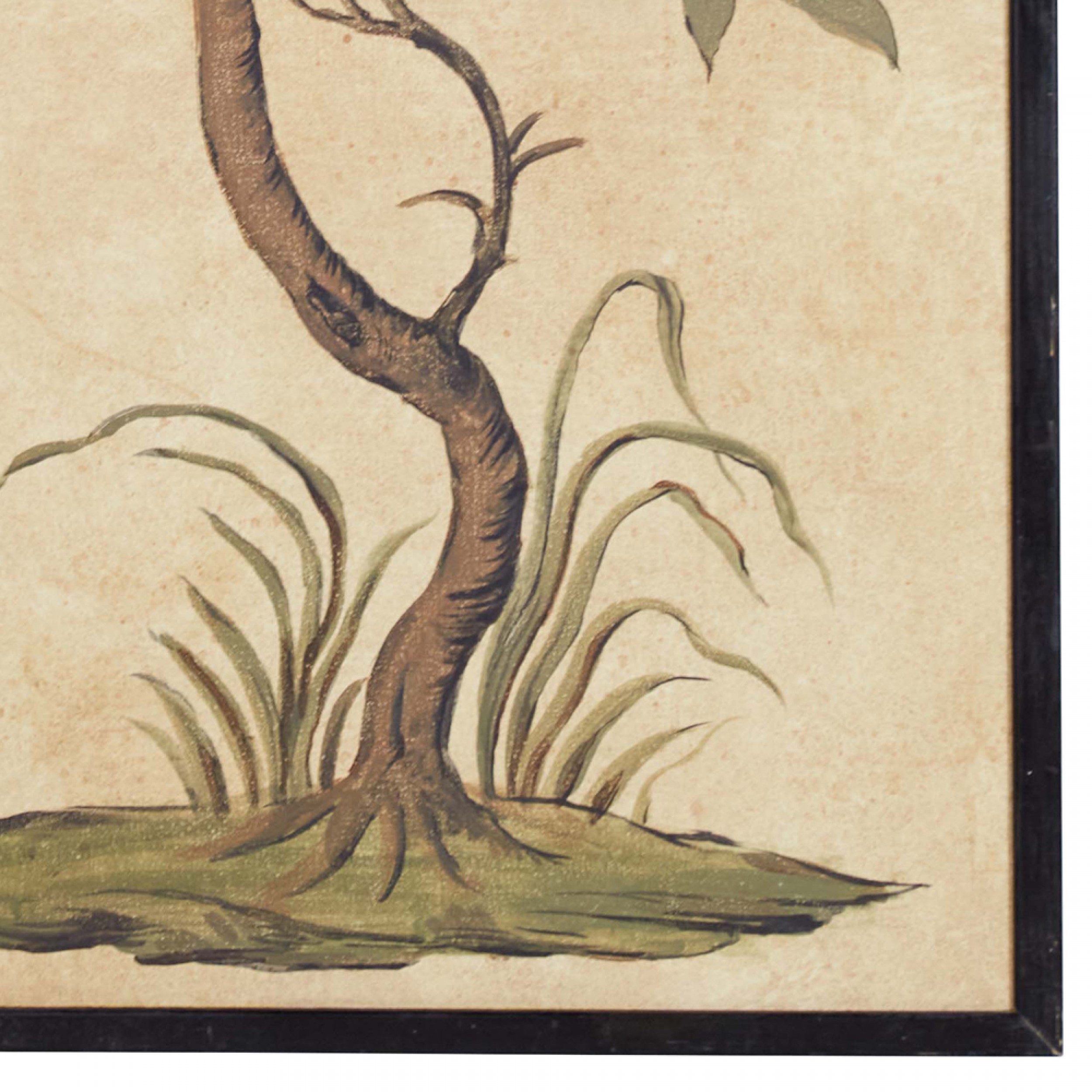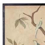 Italian Renaissance style (20th Century) acrylic painting of two birds perched on a flowering tree on a beige background, painted on wood in a rectangular, black wooden frame..