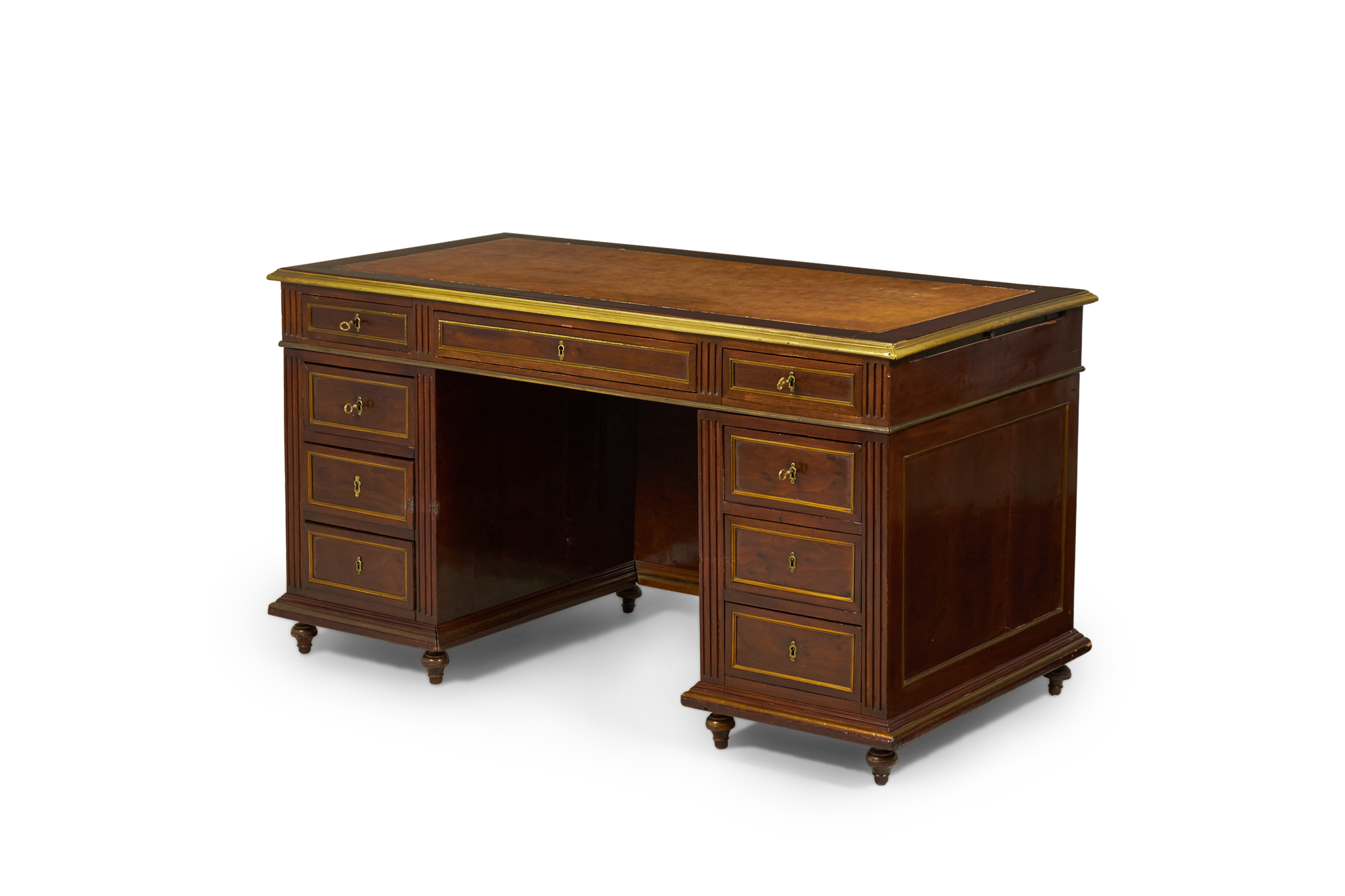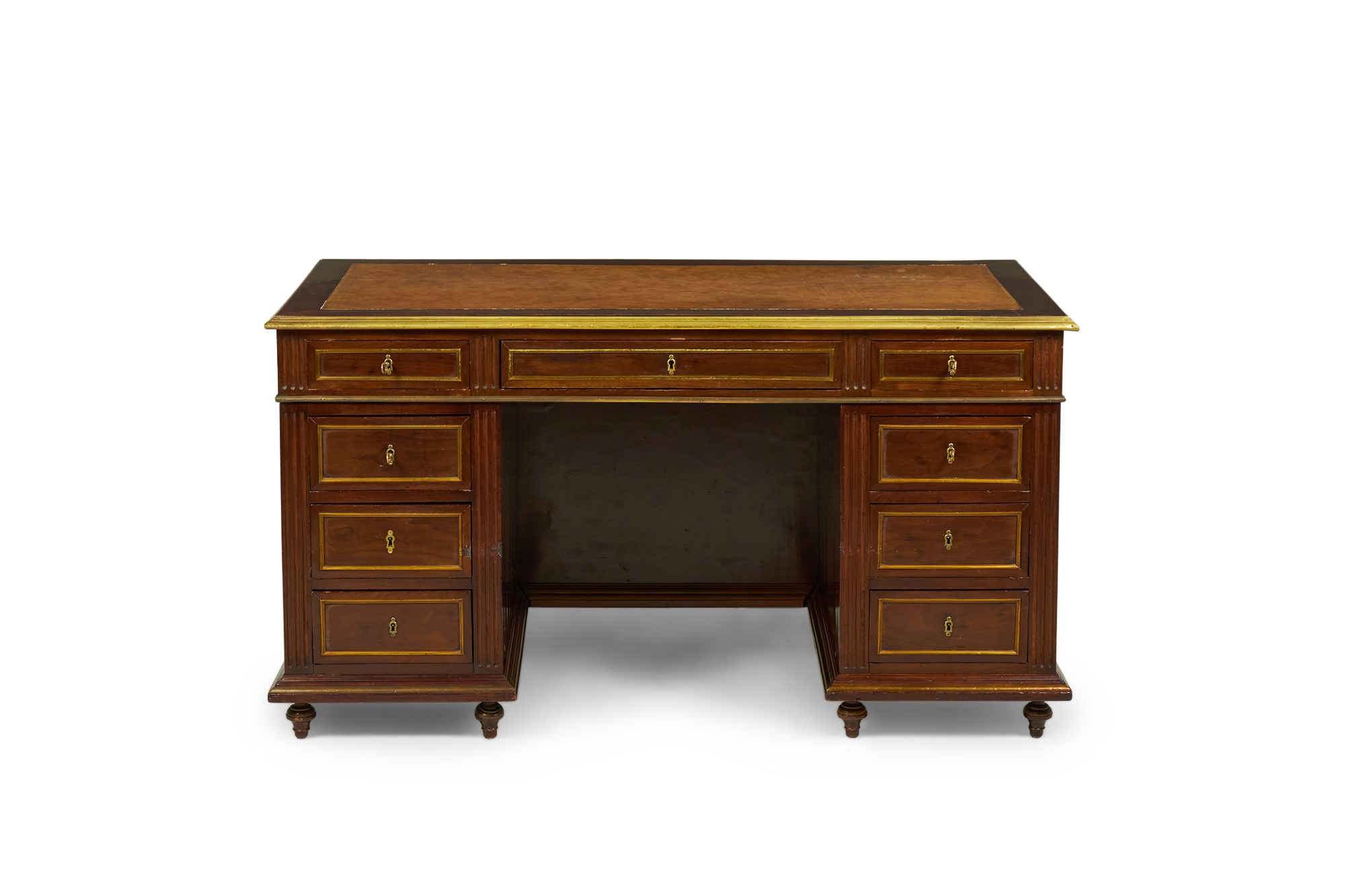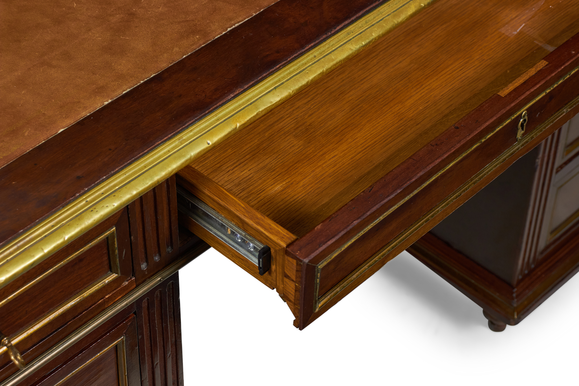 French Louis XVI Style Mahogany and Brass Kneehole Desk