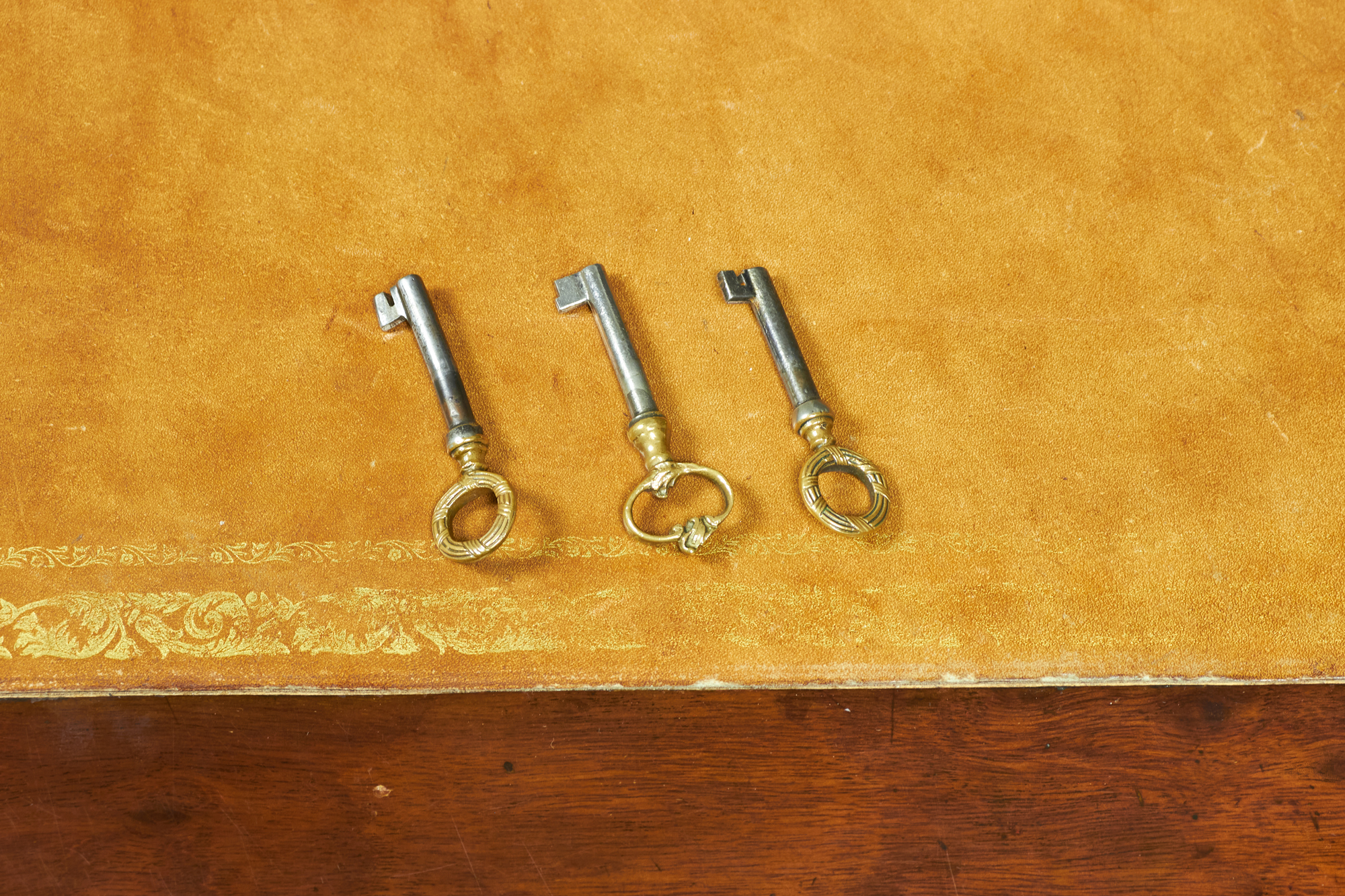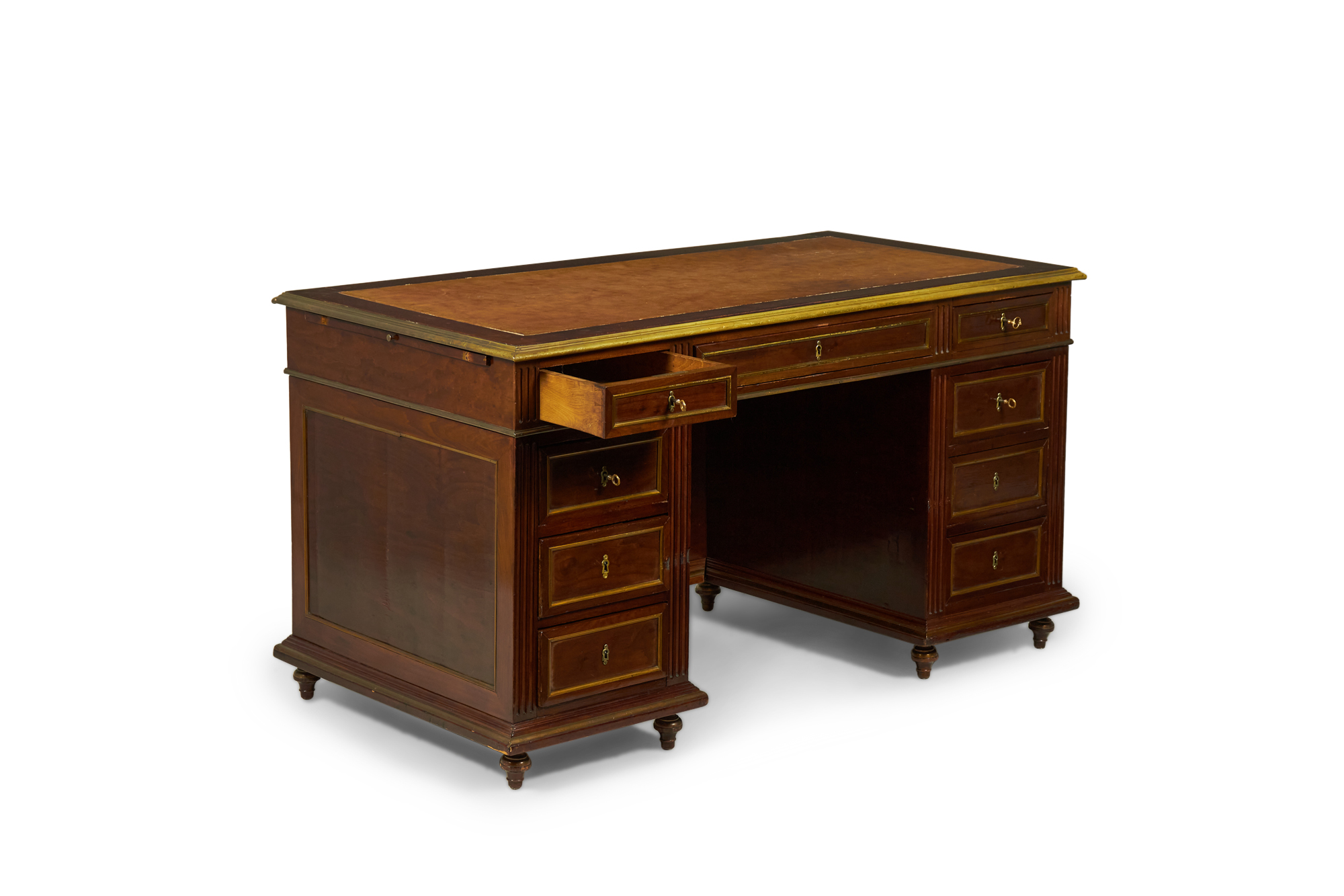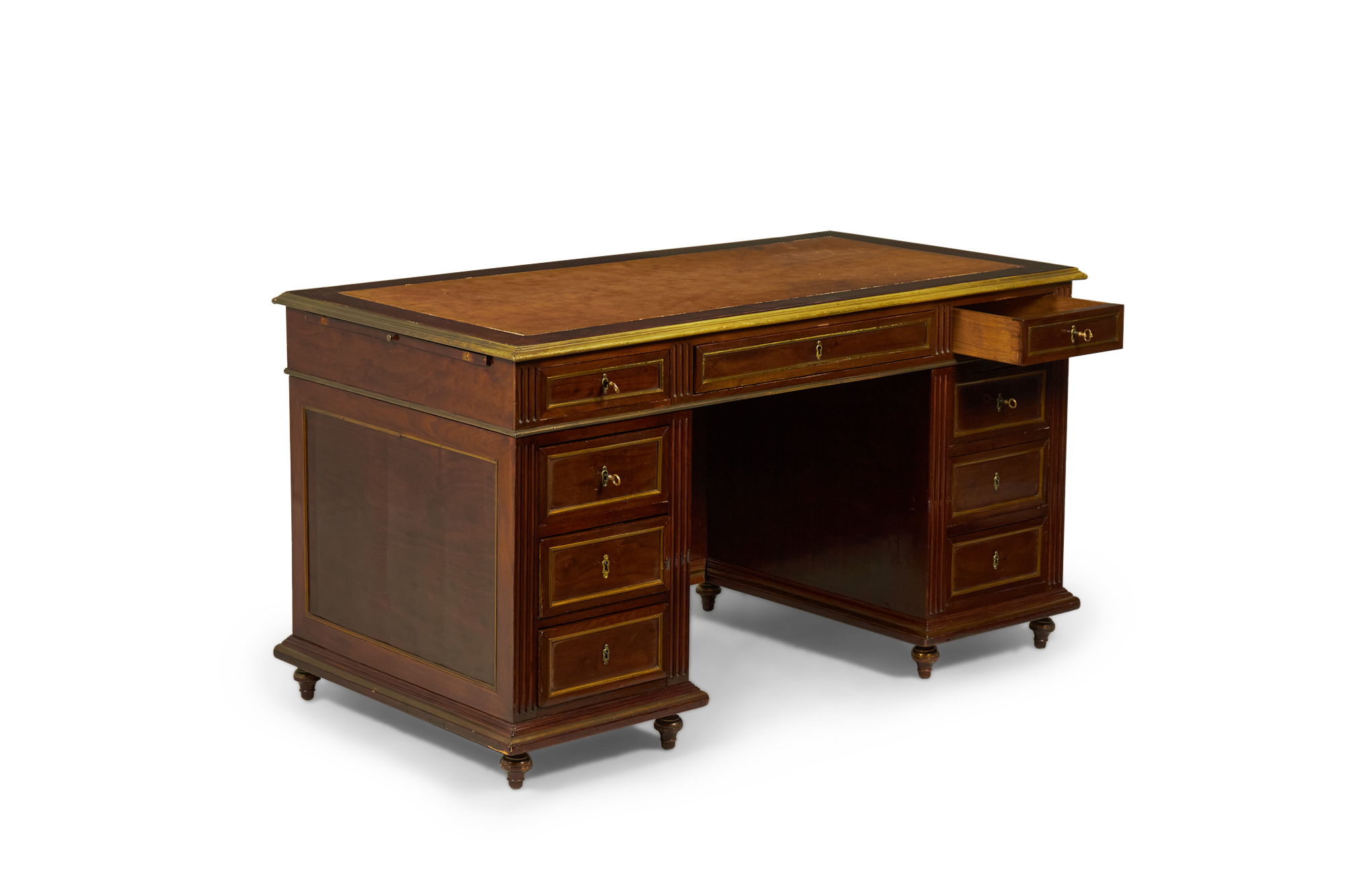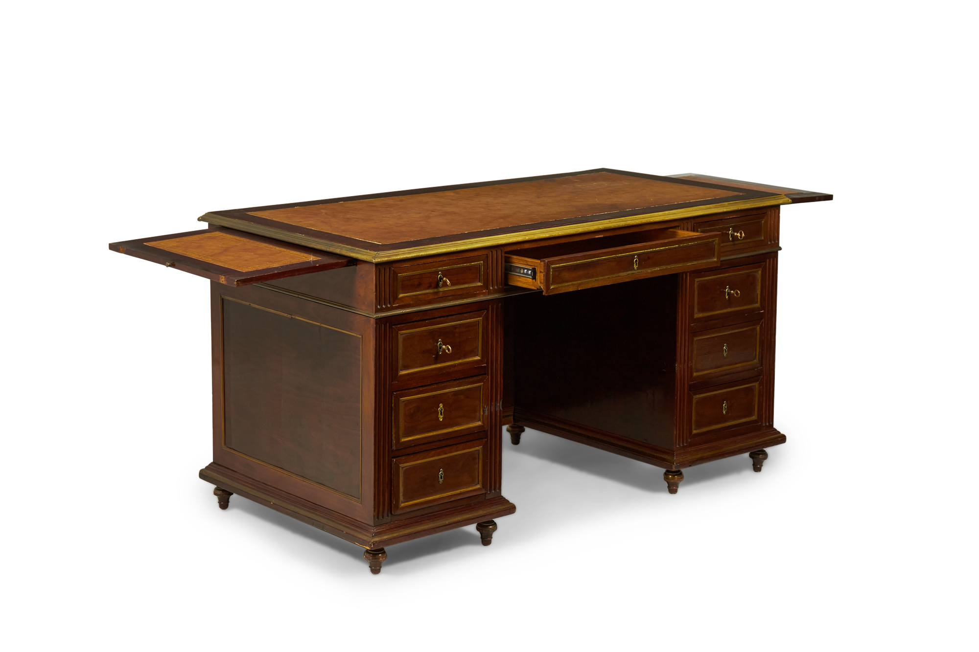 French Louis XVI-style (19/20th Century) mahogany kneehole desk having a vanity panel front and two pedestal sides with fluted trim containing several lockable drawers under a brown leather inset desktop trimmed in brass with extendable writing surfaces on either side. (Has keys)