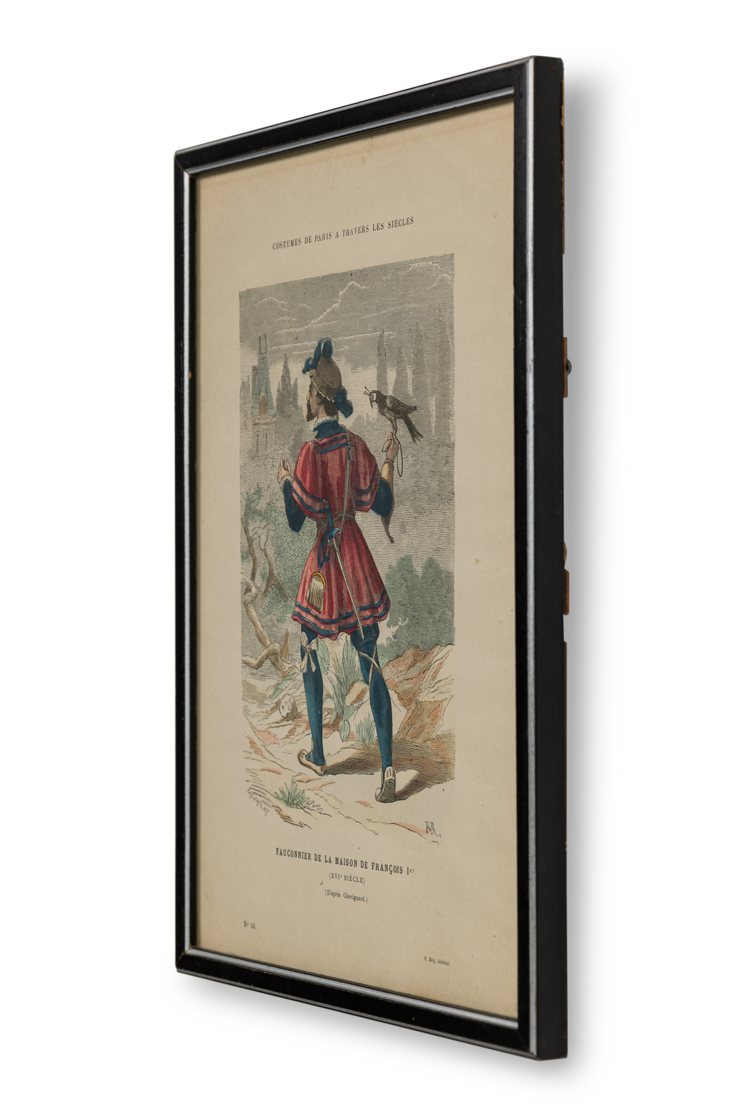 French 19th-century framed lithograph of a falconer of the house of François I in Renaissance attire traversing in a wooden black and silver frame (Similar group of prints NWL6152A-J)