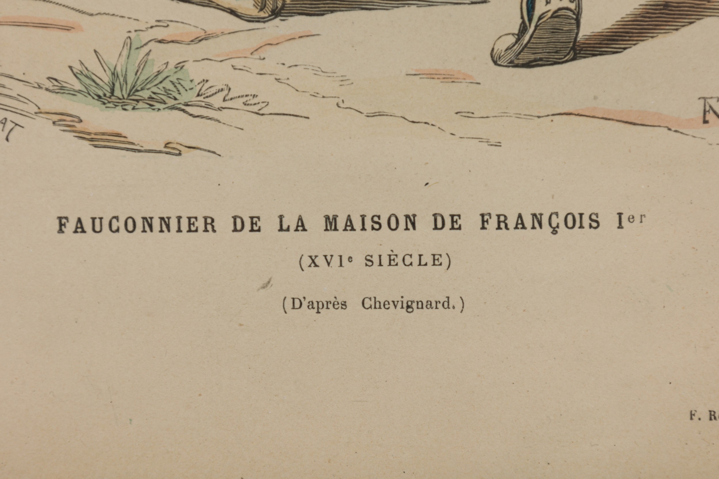 French 19th-century framed lithograph of a falconer of the house of François I in Renaissance attire traversing in a wooden black and silver frame (Similar group of prints NWL6152A-J).