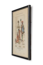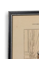 French 19th-century framed lithograph of a Parisian noble lady in Renaissance attire going to Mass in a wooden black and silver frame (Similar group of prints NWL6152A-J).