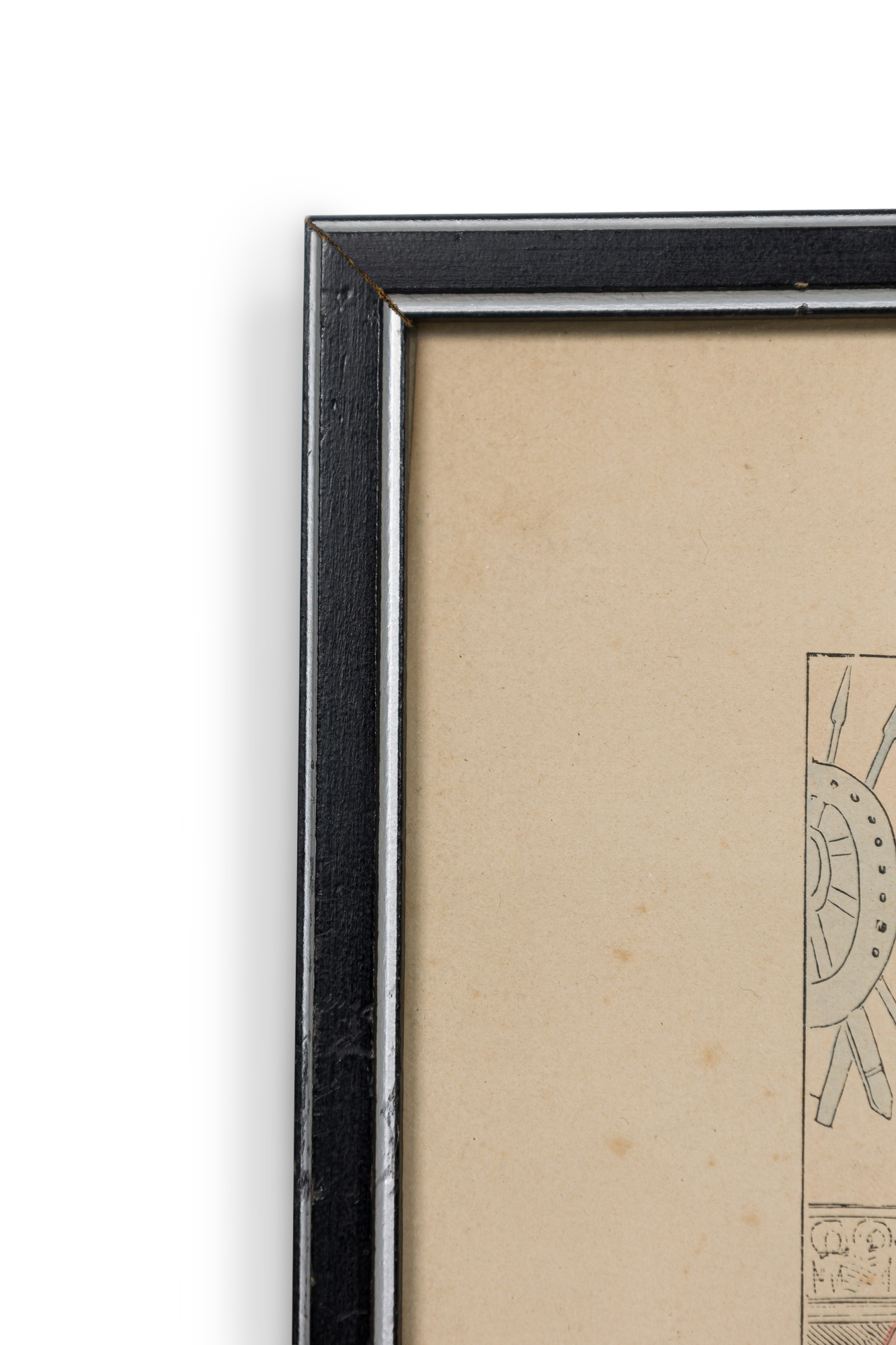 French 19th-century framed lithograph of a Parisian noble family and their architect in Byzantine attire discussing architectural ground plans in a wooden black and silver frame (Similar group of prints NWL6152A-J)