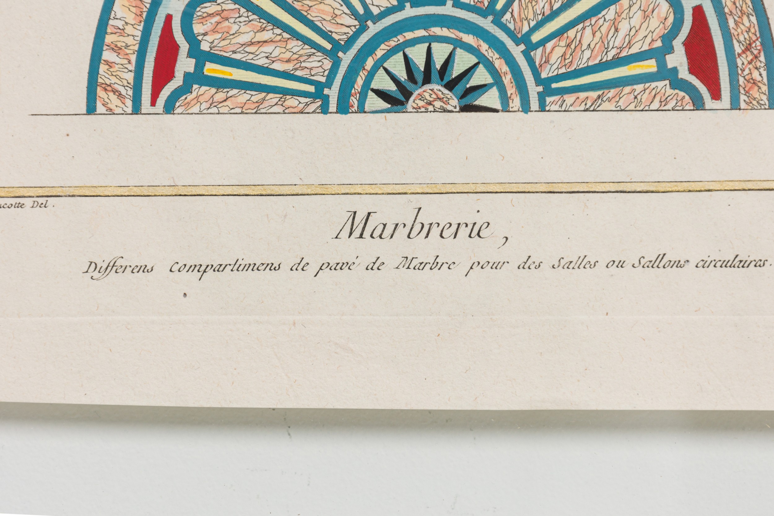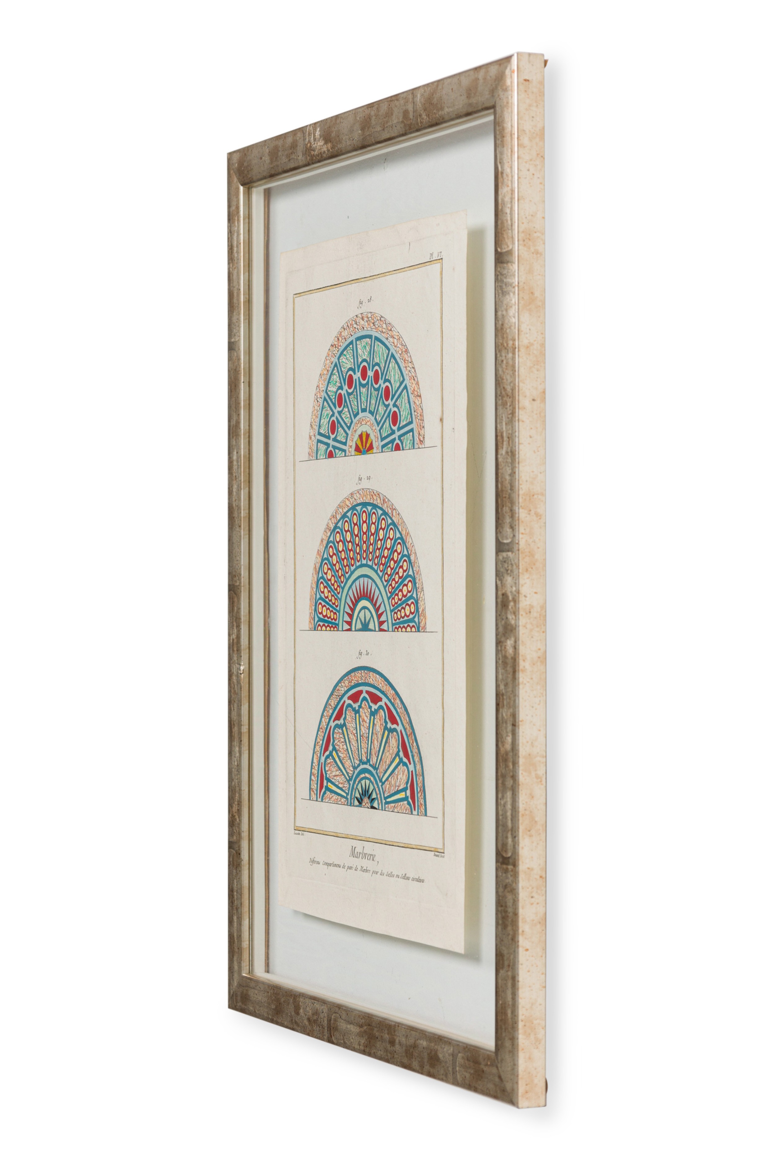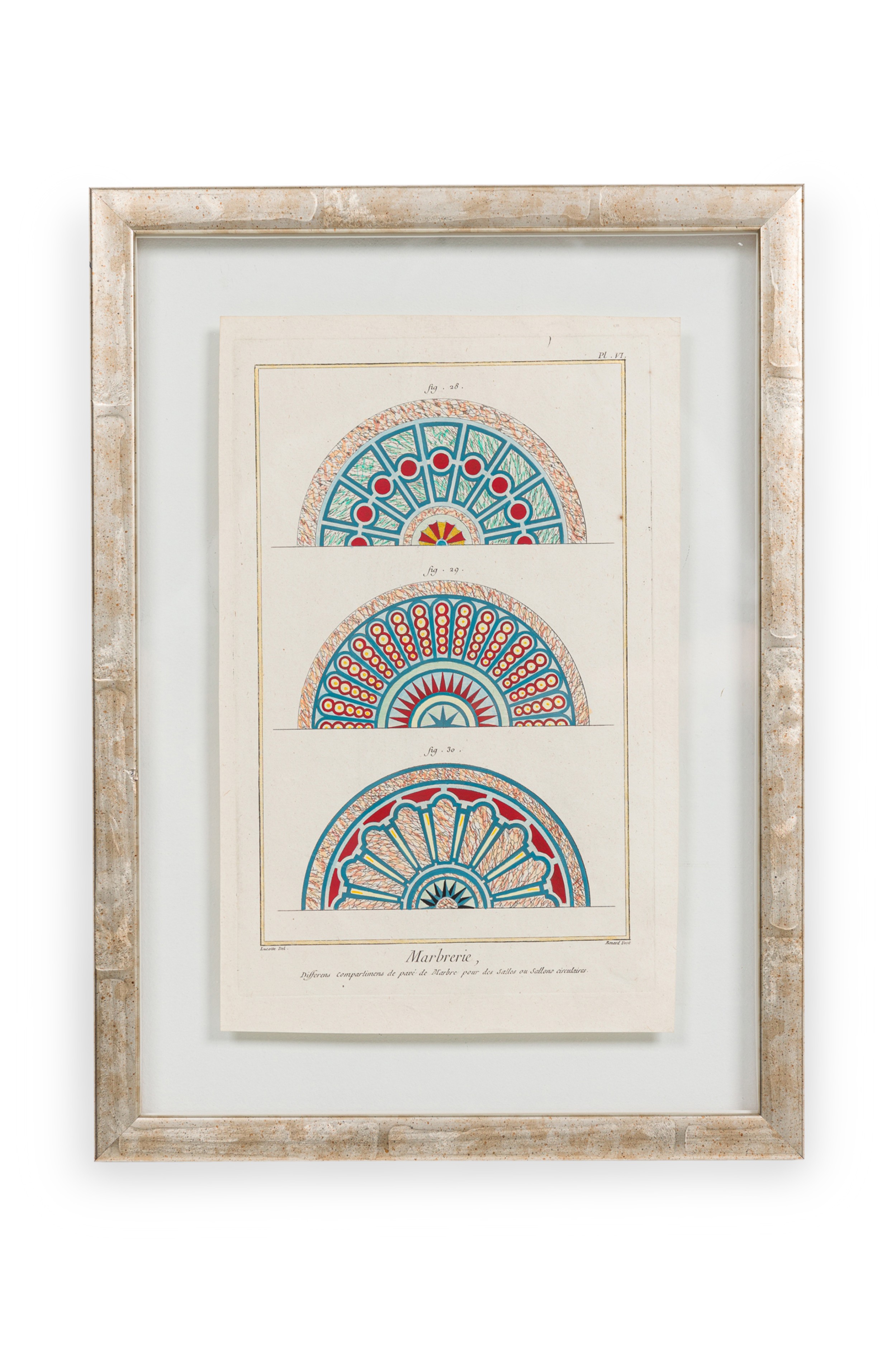 French Baroque style hand painted multicolored print of three semicircular figures of varying designs for marble pavings of circular rooms or lounges in a silver frame (Matching prints available NWL6148A-F).