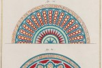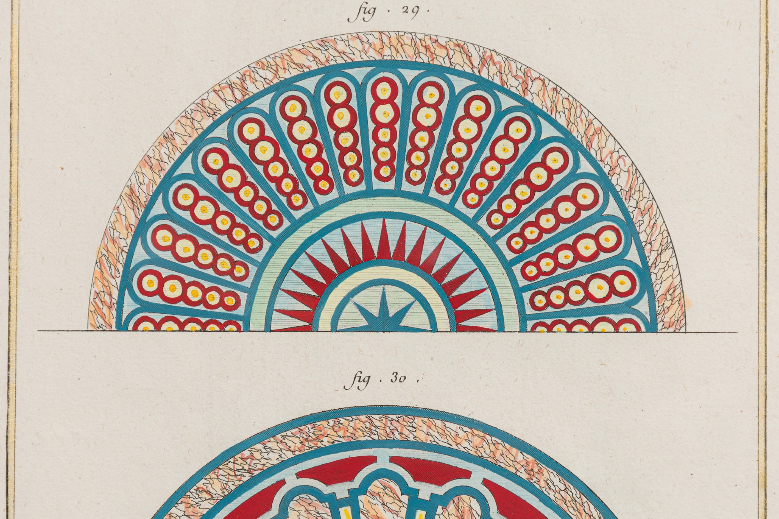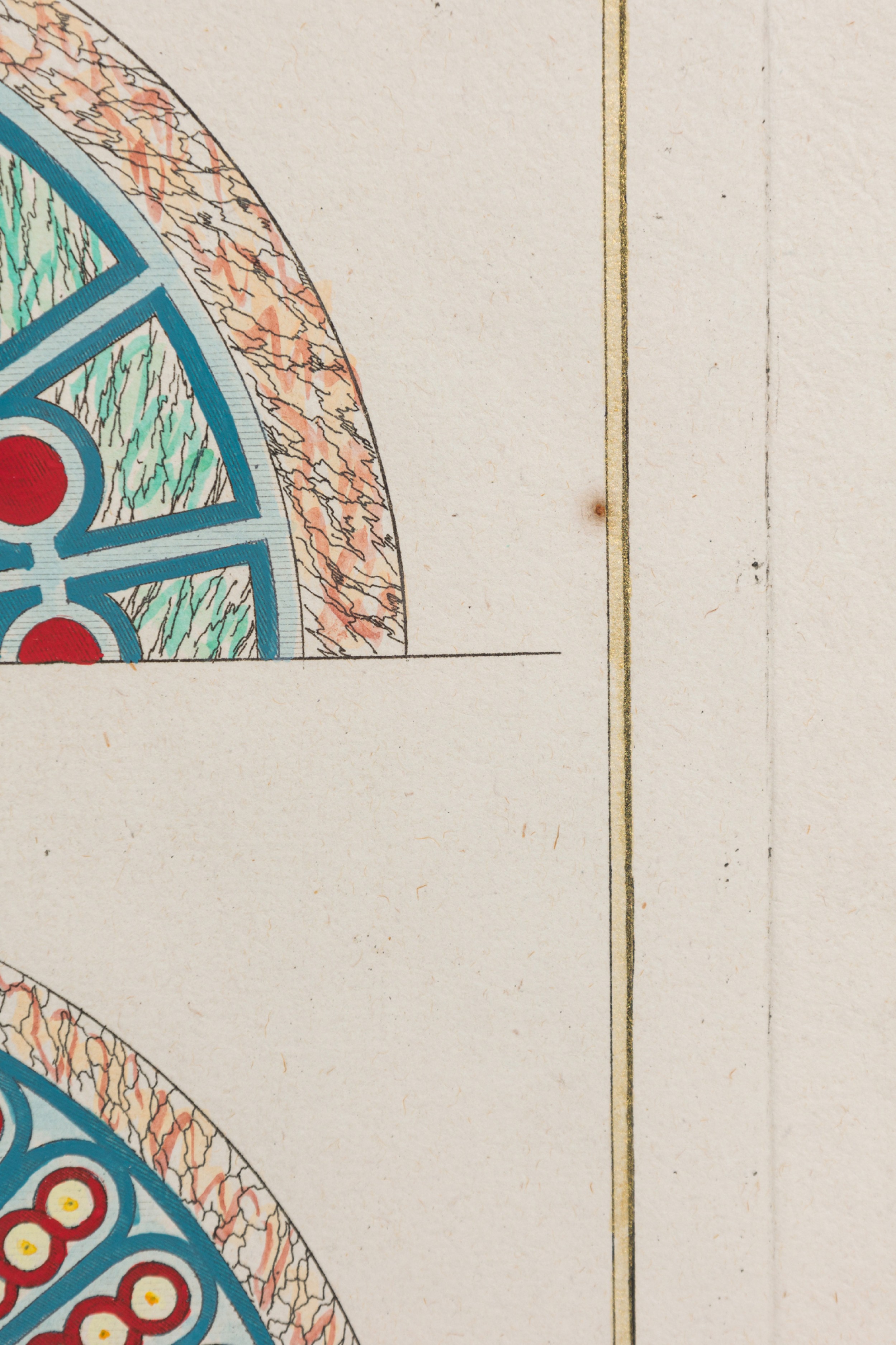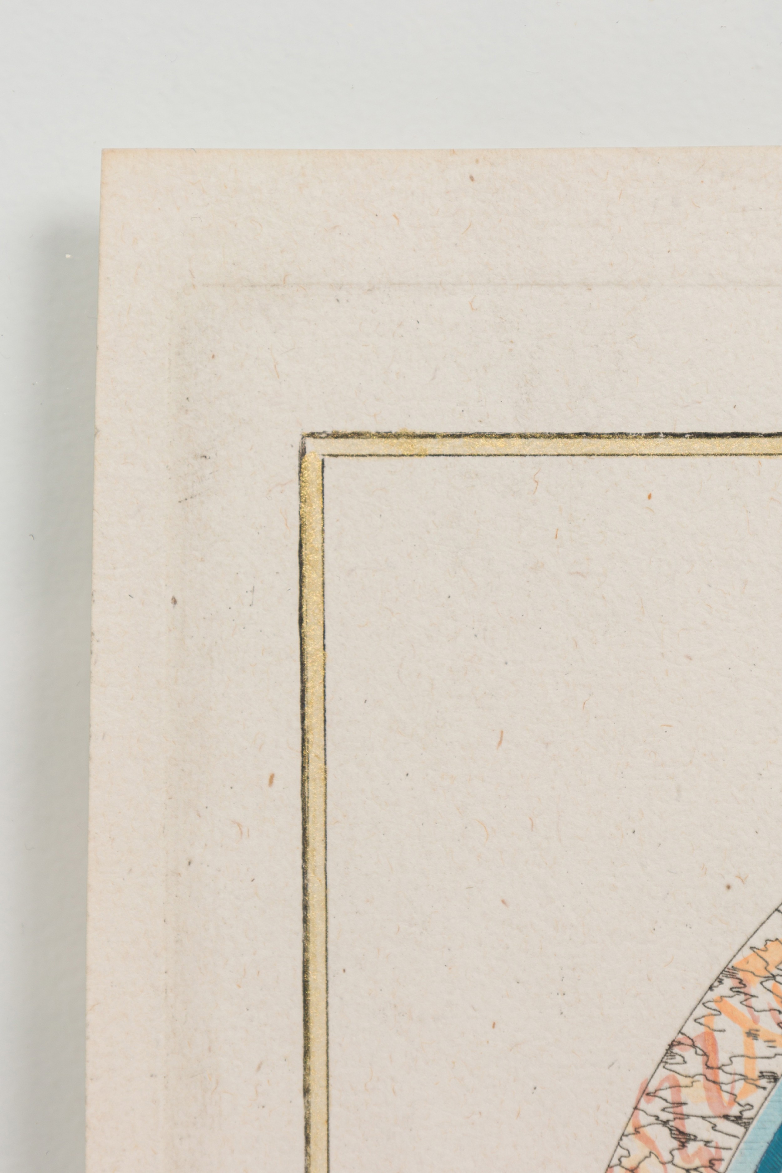 French Baroque style hand painted multicolored print of three semicircular figures of varying designs for marble pavings of circular rooms or lounges in a silver frame (Matching prints available NWL6148A-F)