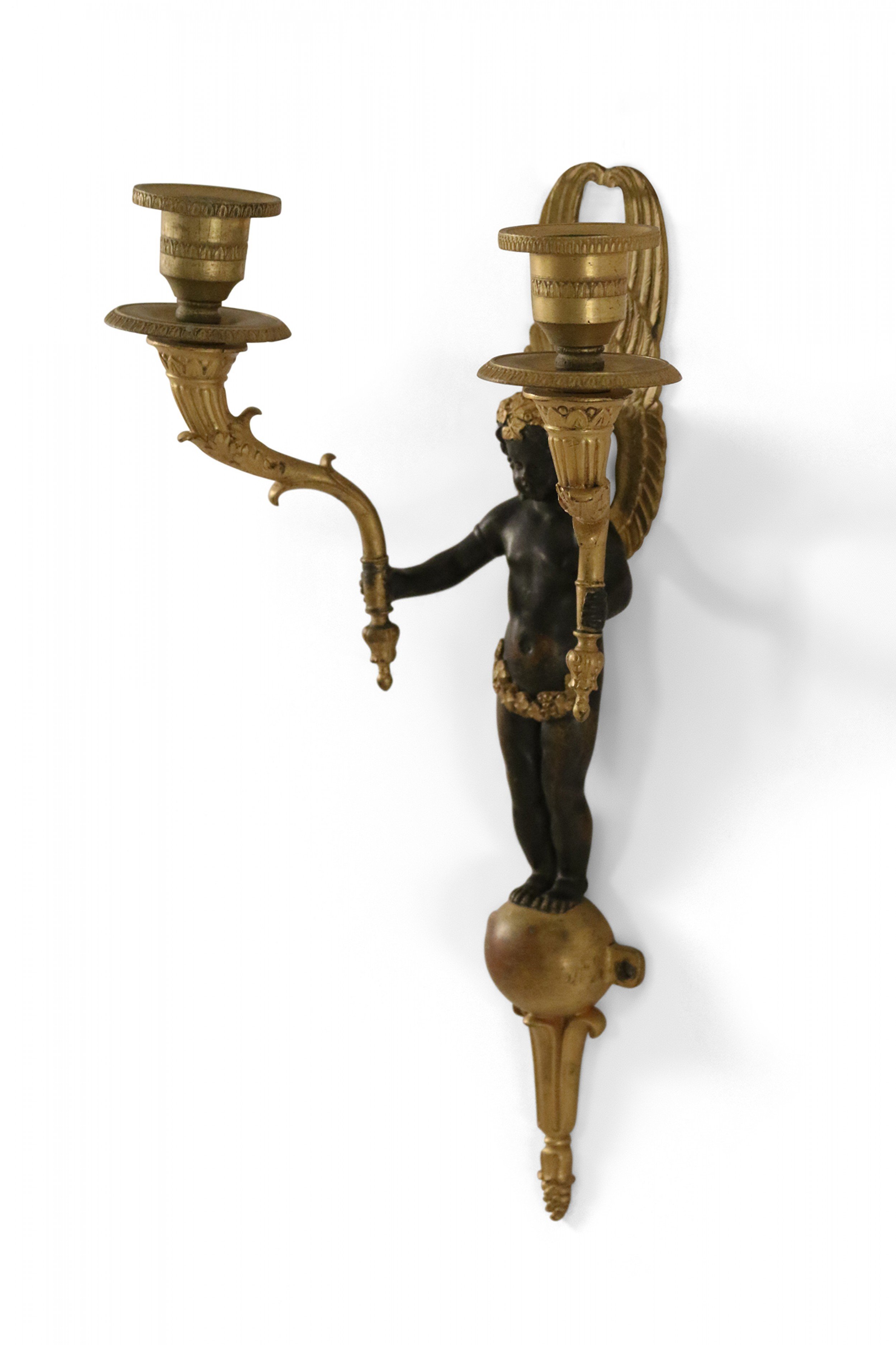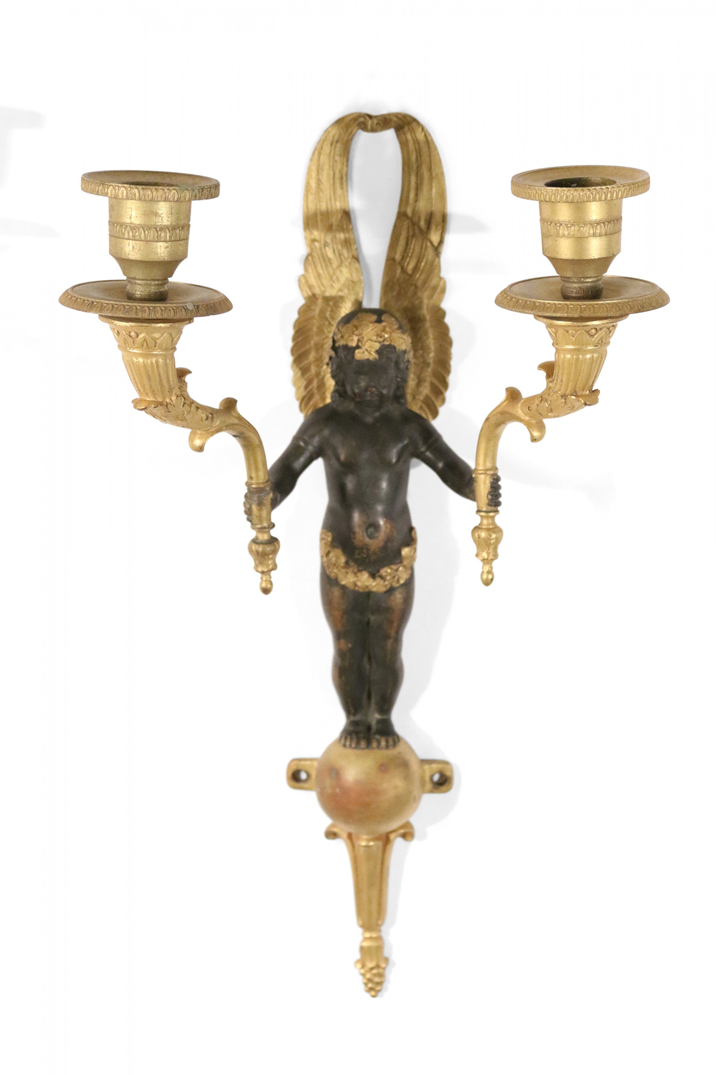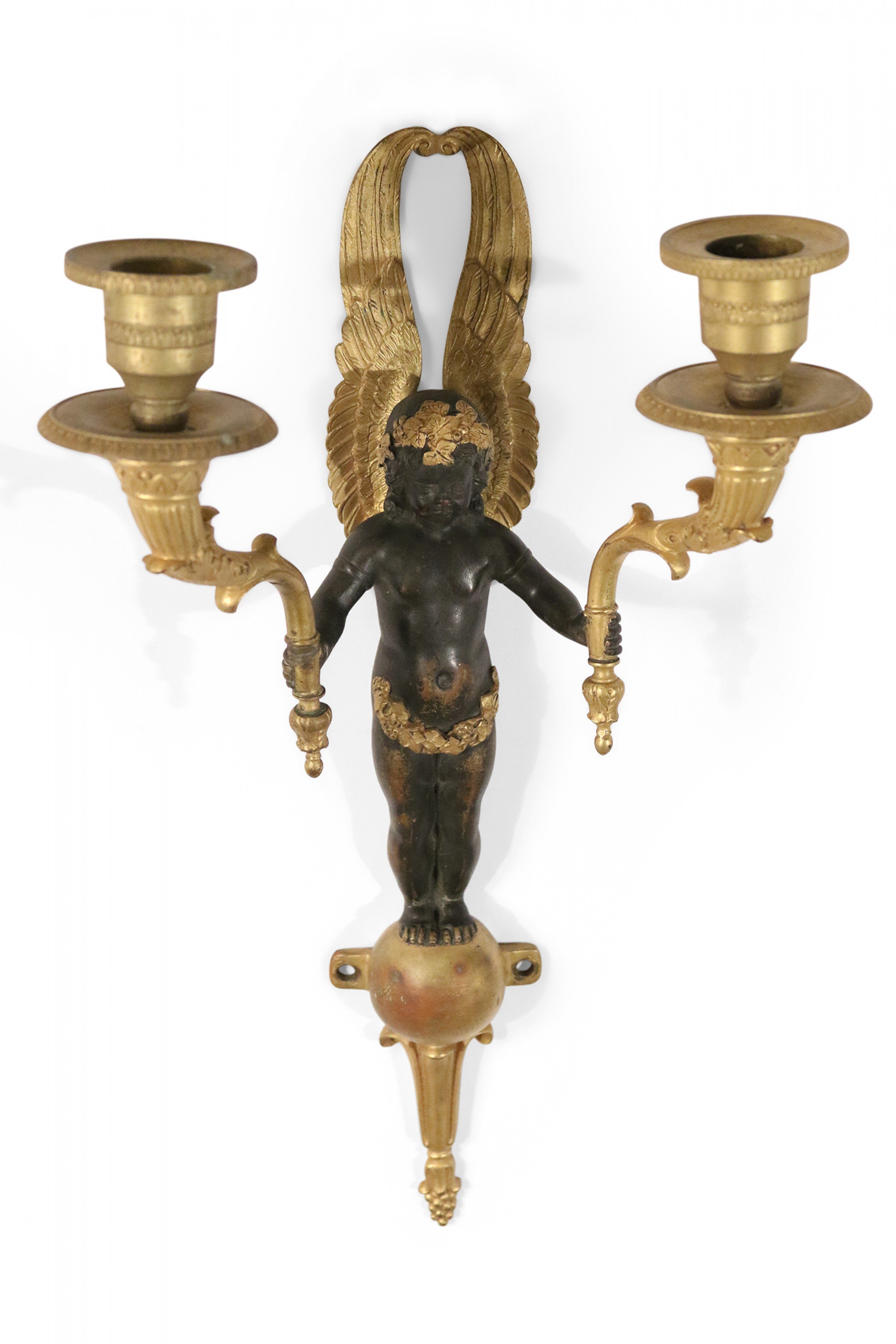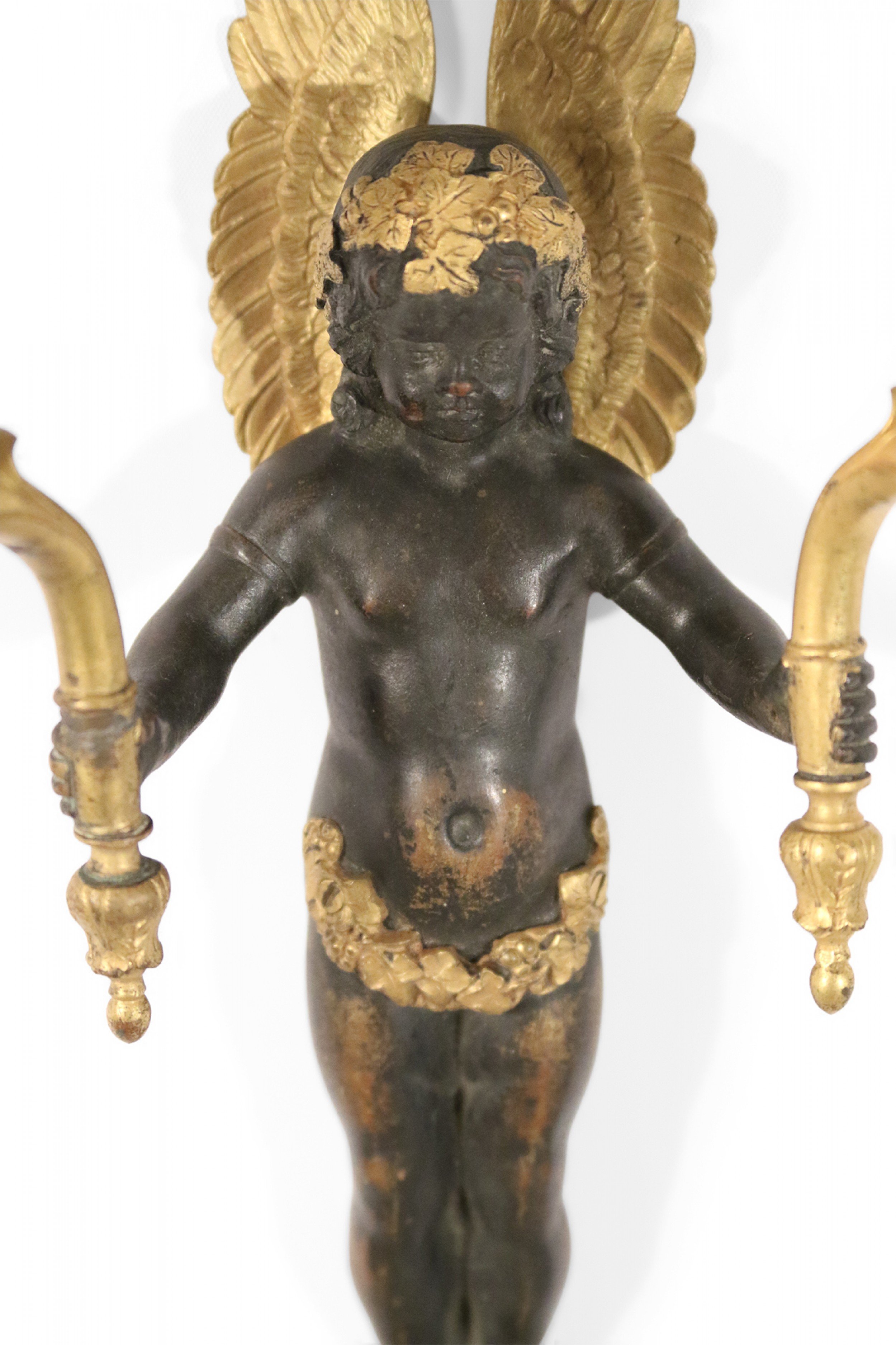 French Empire-style (19th Century) ebonized bronze and gilt trim caryatid wall sconce with a central winged figure holding two candleholders..