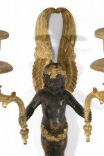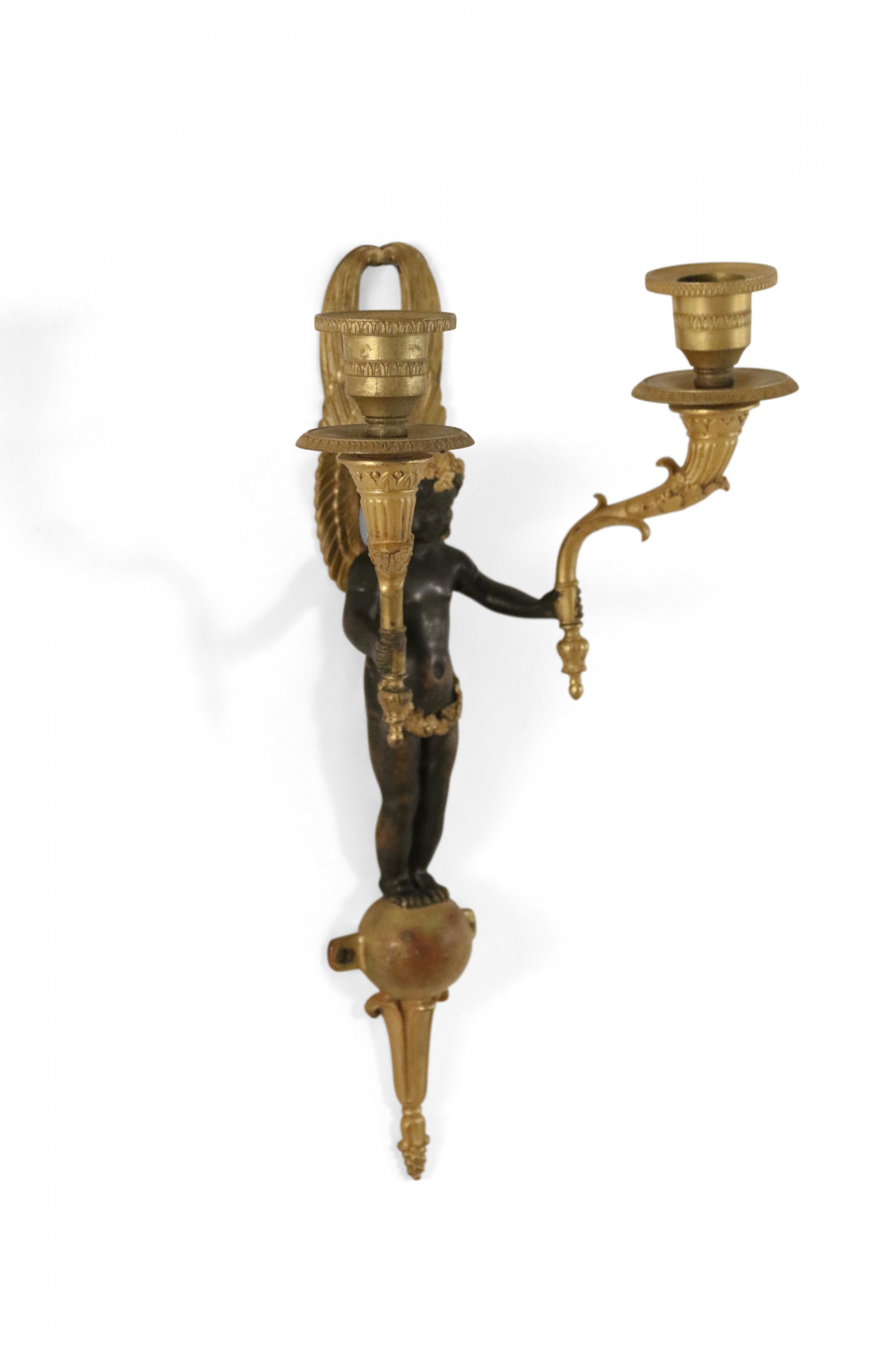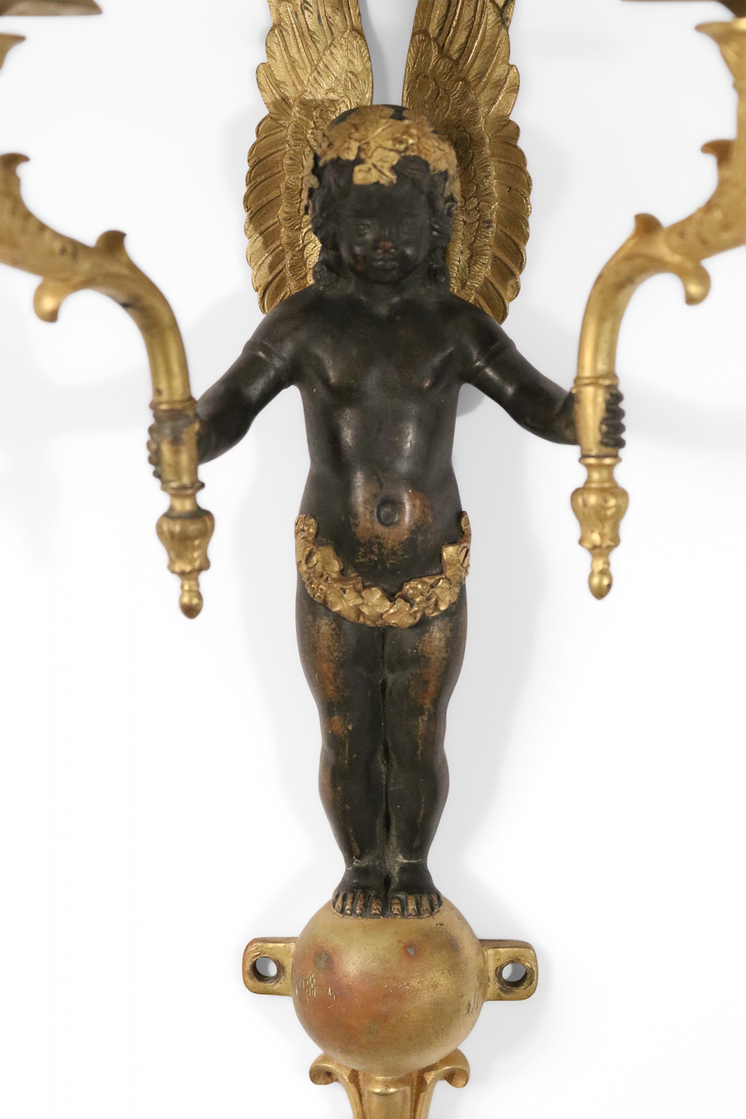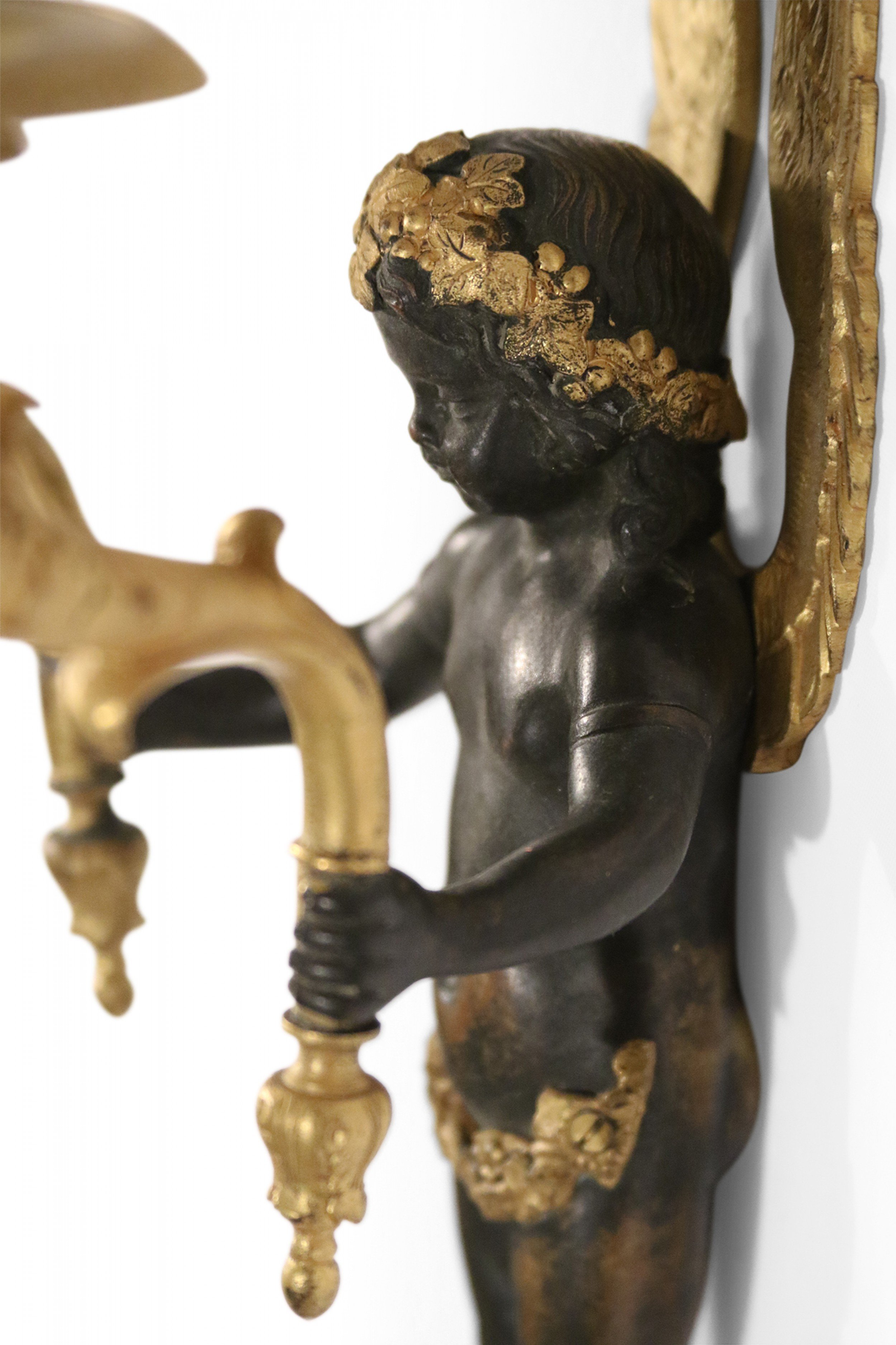 French Empire-style (19th Century) ebonized bronze and gilt trim caryatid wall sconce with a central winged figure holding two candleholders..