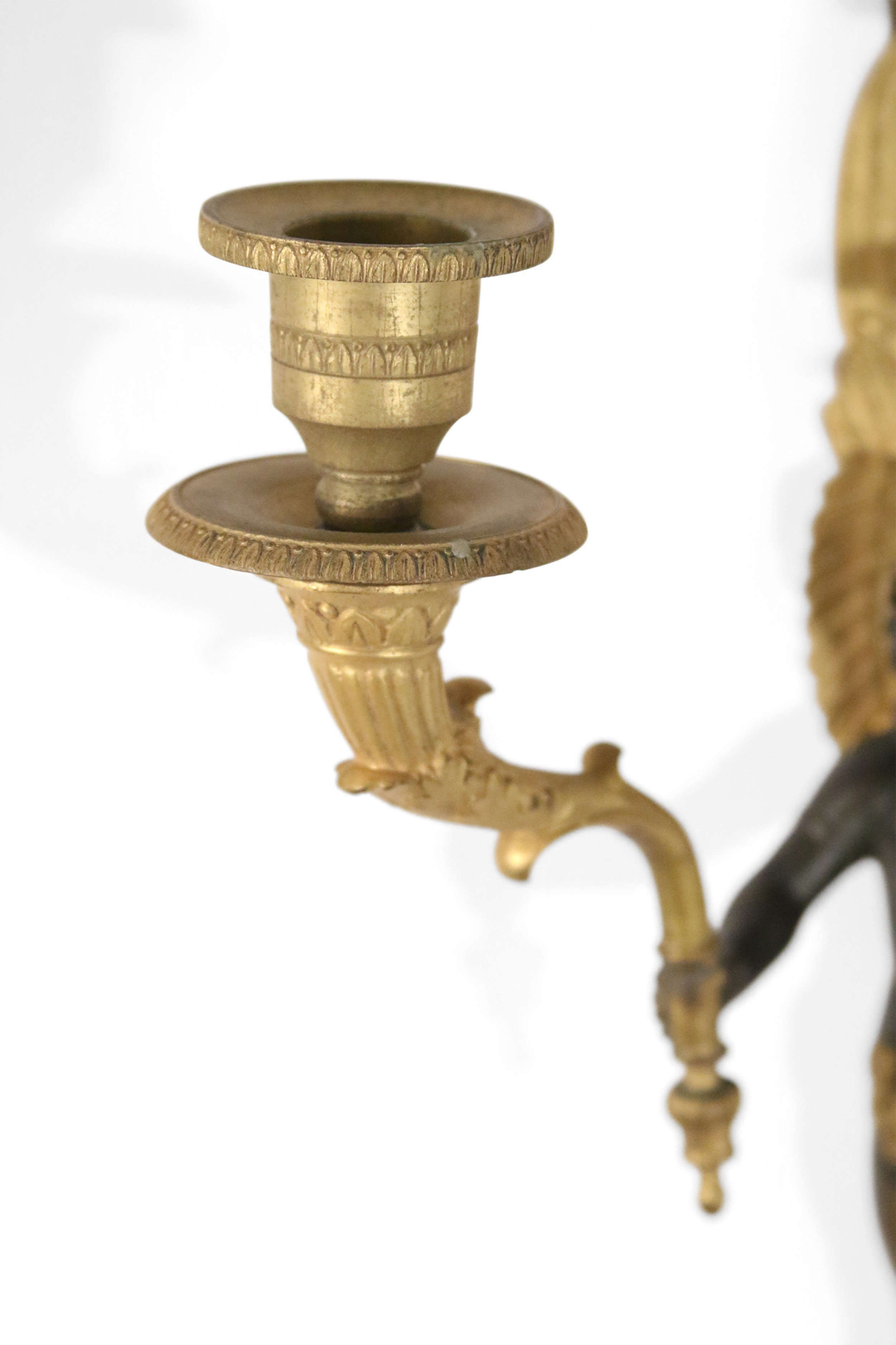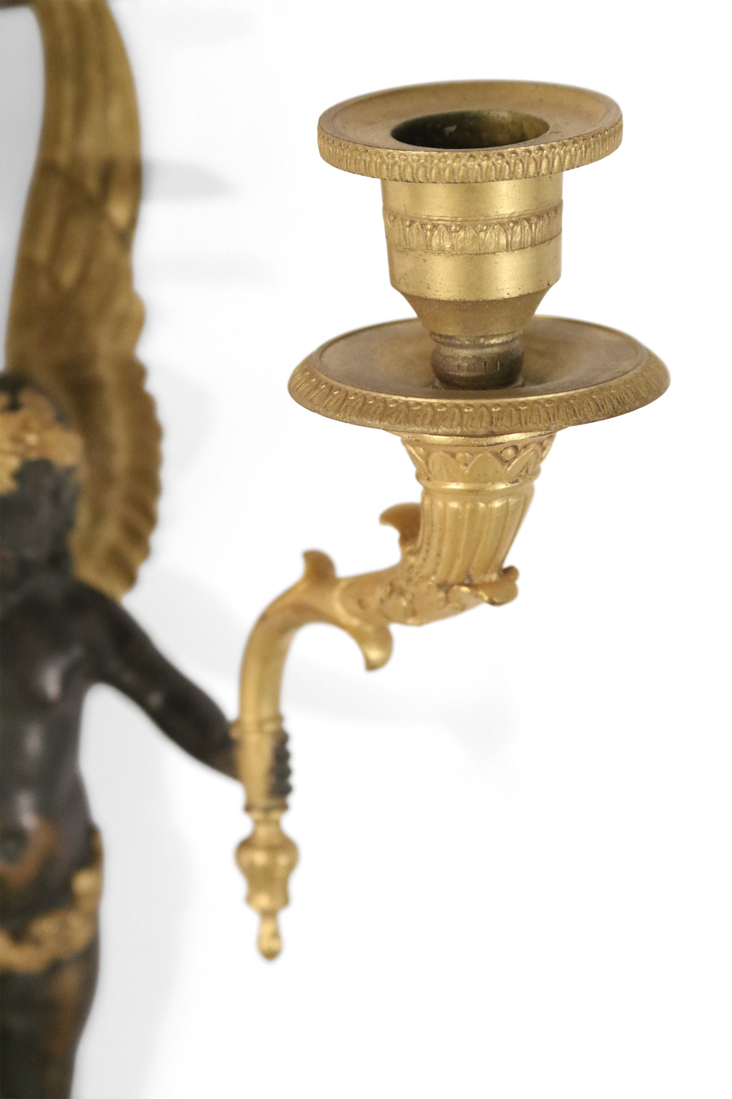 French Empire-style (19th Century) ebonized bronze and gilt trim caryatid wall sconce with a central winged figure holding two candleholders.