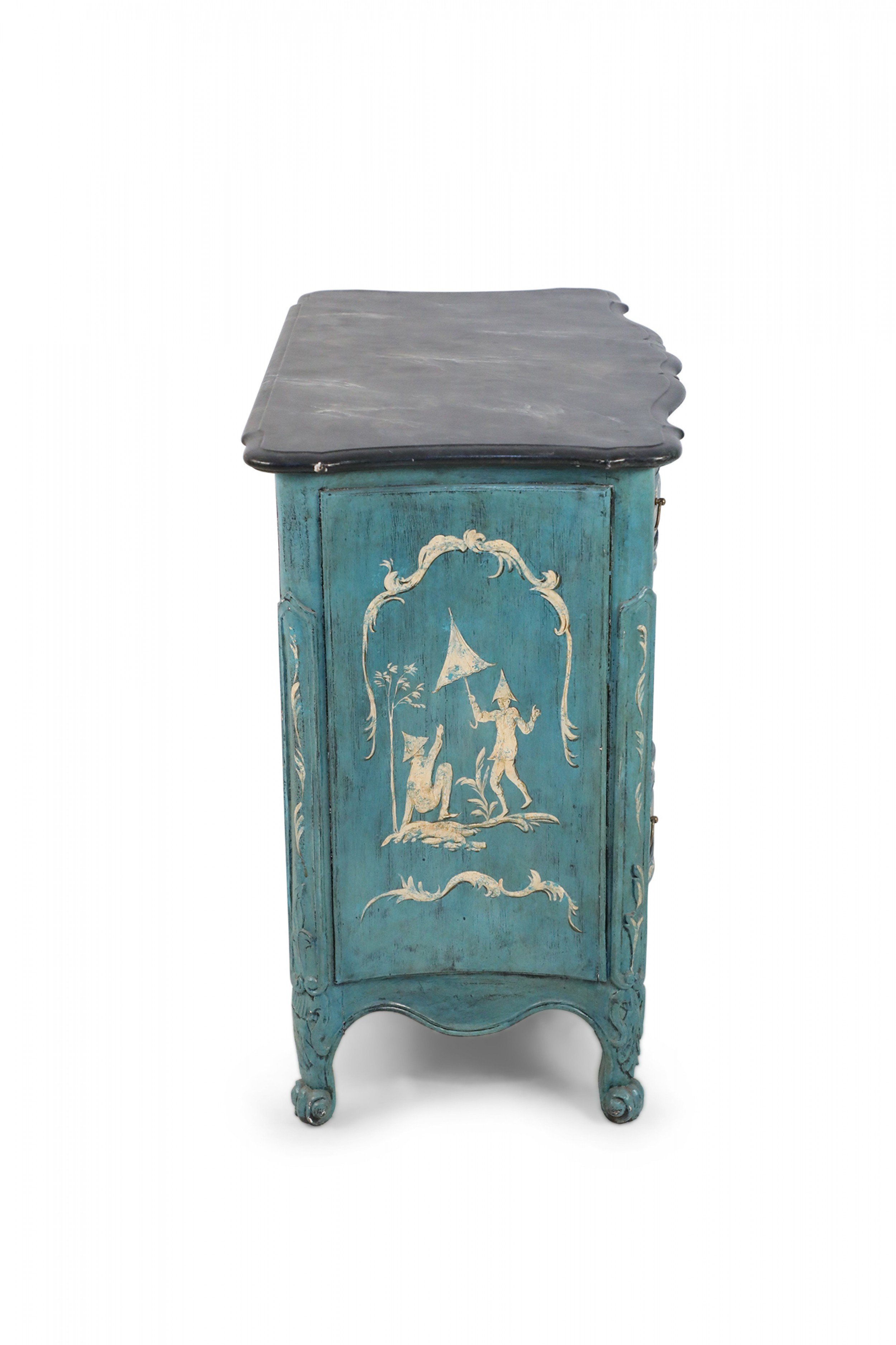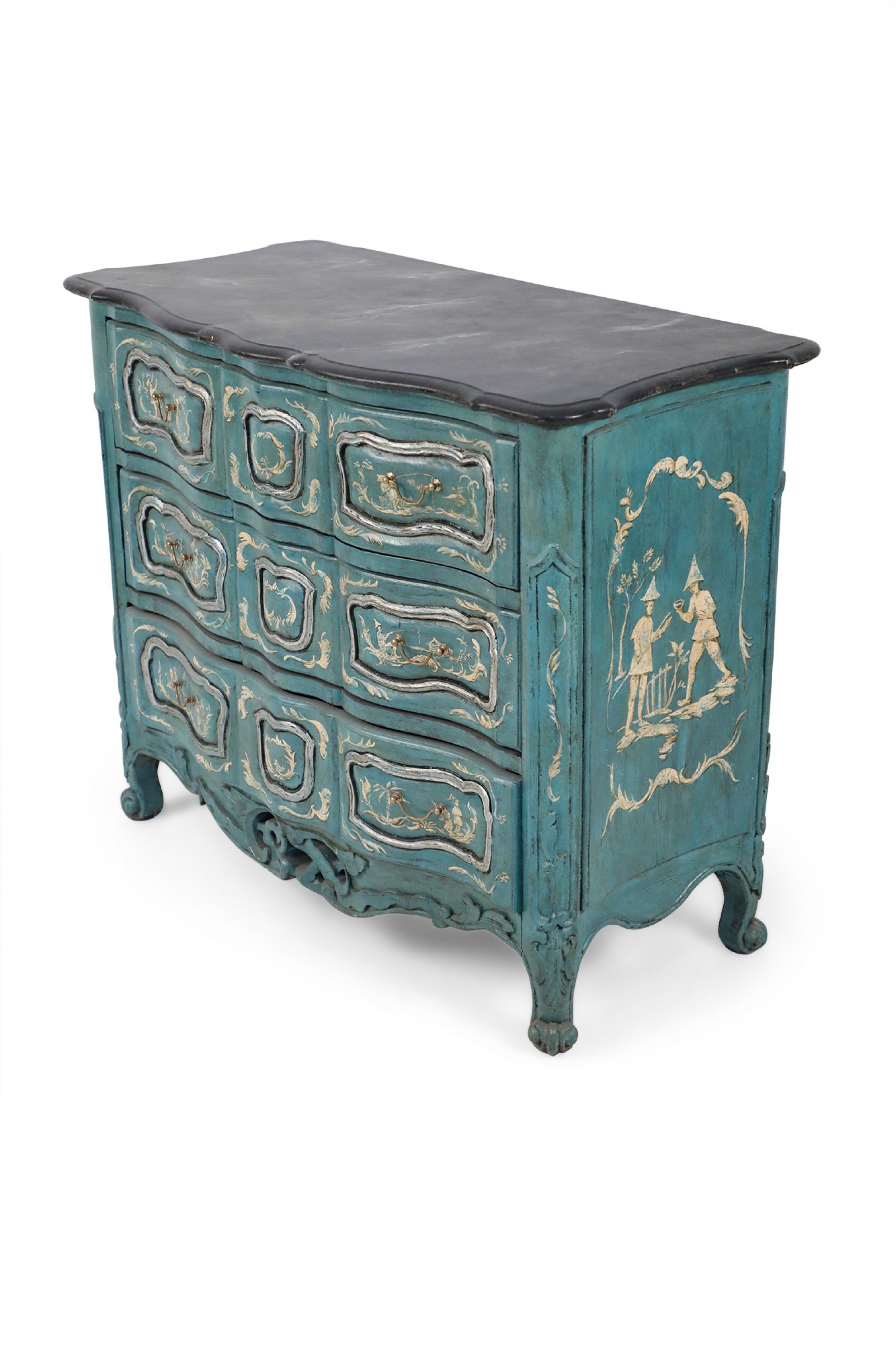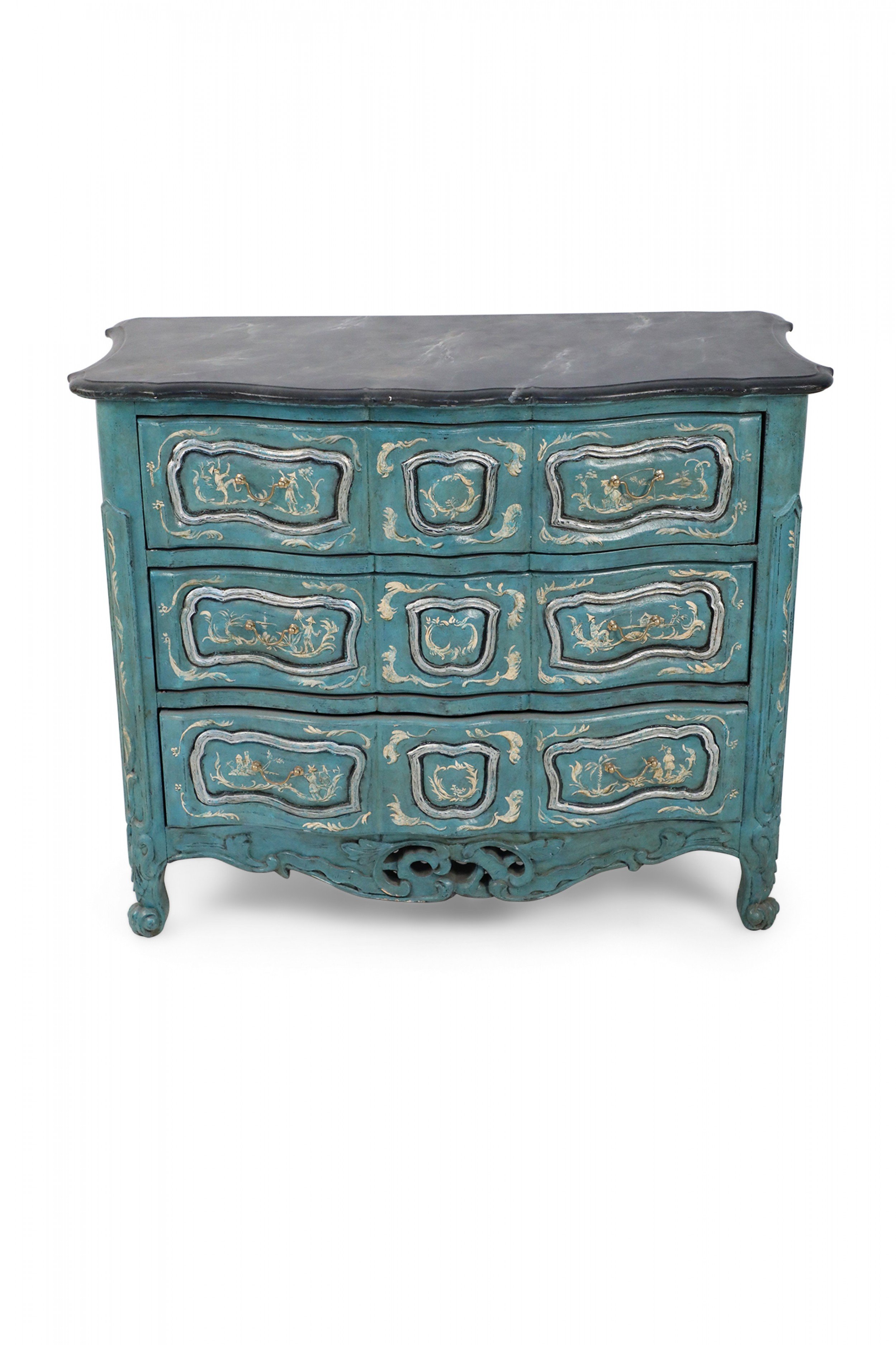 French Louis XV-style serpentine commode that contrasts a smooth, scalloped gray painted faux marble top with a wooden, teal-painted body of undulated drawers with gold pulls and petite, carved cabriole legs with ball feet connected by a carved, pierced apron. The commode is decorated with intricately-captured ribbon and leaf motifs along with figurative scenes of men holding umbrellas or fishing on the front and sides, rendered in yellow and cream. (Similar to NWL2320)..