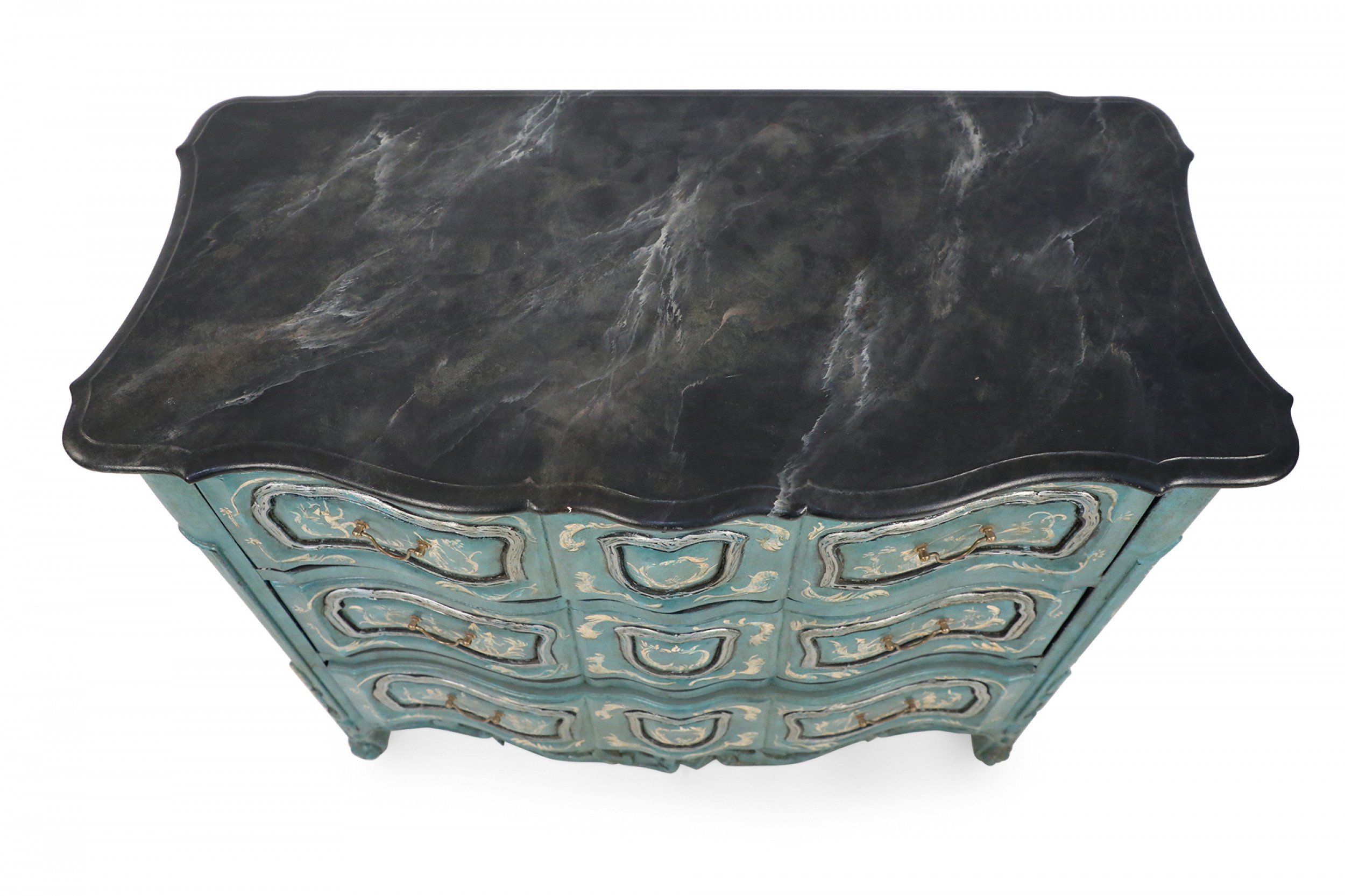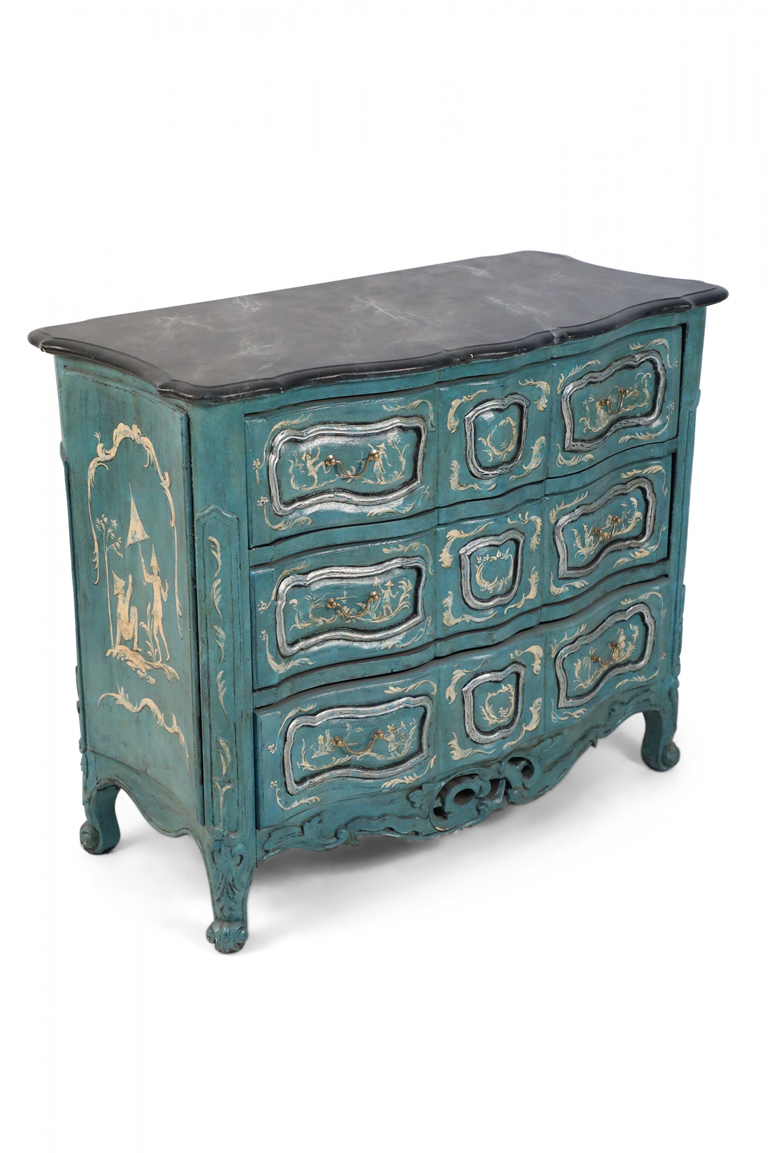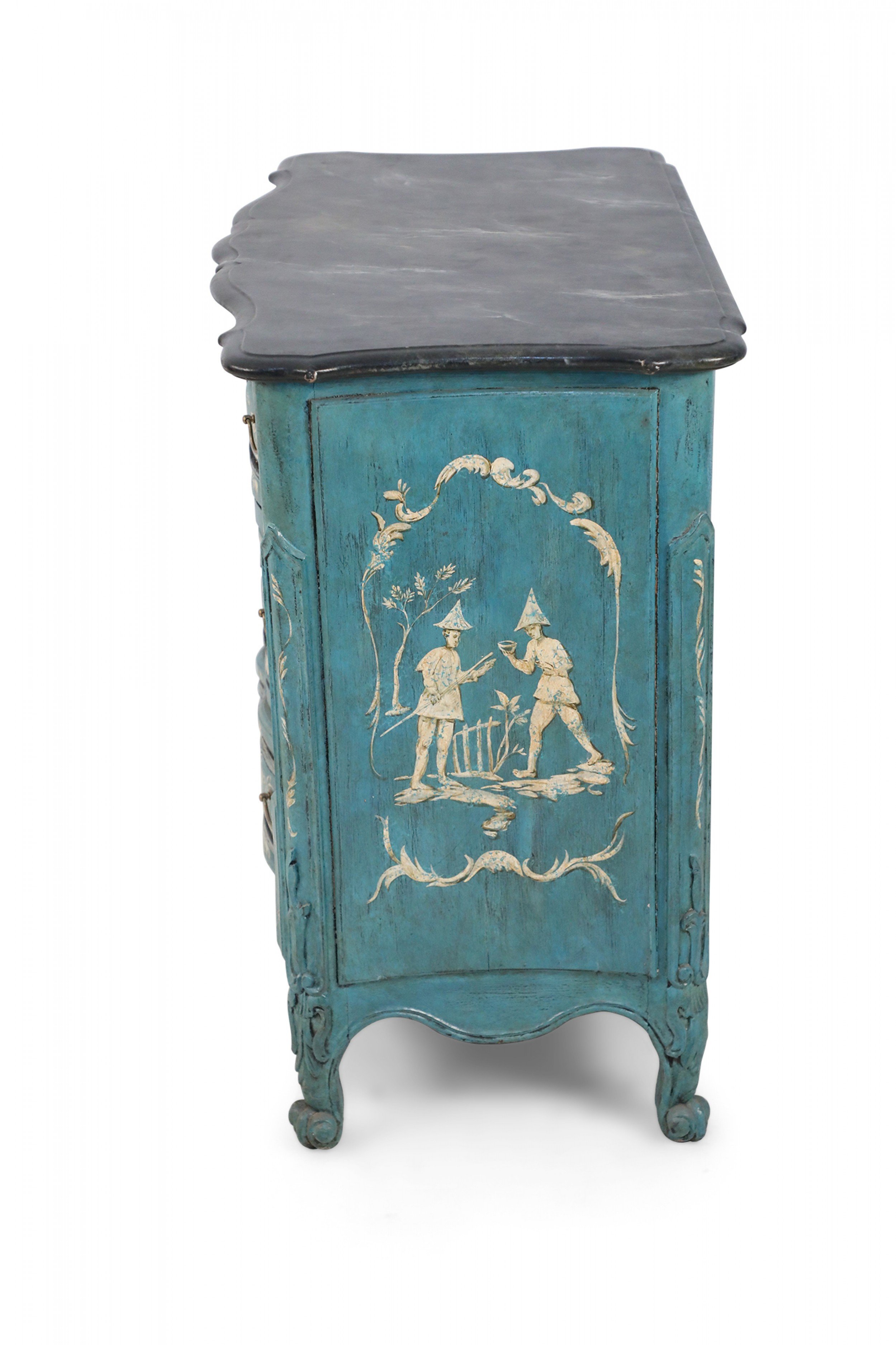 French Louis XV-style serpentine commode that contrasts a smooth, scalloped gray painted faux marble top with a wooden, teal-painted body of undulated drawers with gold pulls and petite, carved cabriole legs with ball feet connected by a carved, pierced apron. The commode is decorated with intricately-captured ribbon and leaf motifs along with figurative scenes of men holding umbrellas or fishing on the front and sides, rendered in yellow and cream. (Similar to NWL2320)..