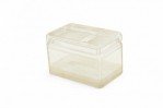 French Art Deco frosted rectangular glass box with rounded edges and an incised top with geometric designs and a hallmark at base.
