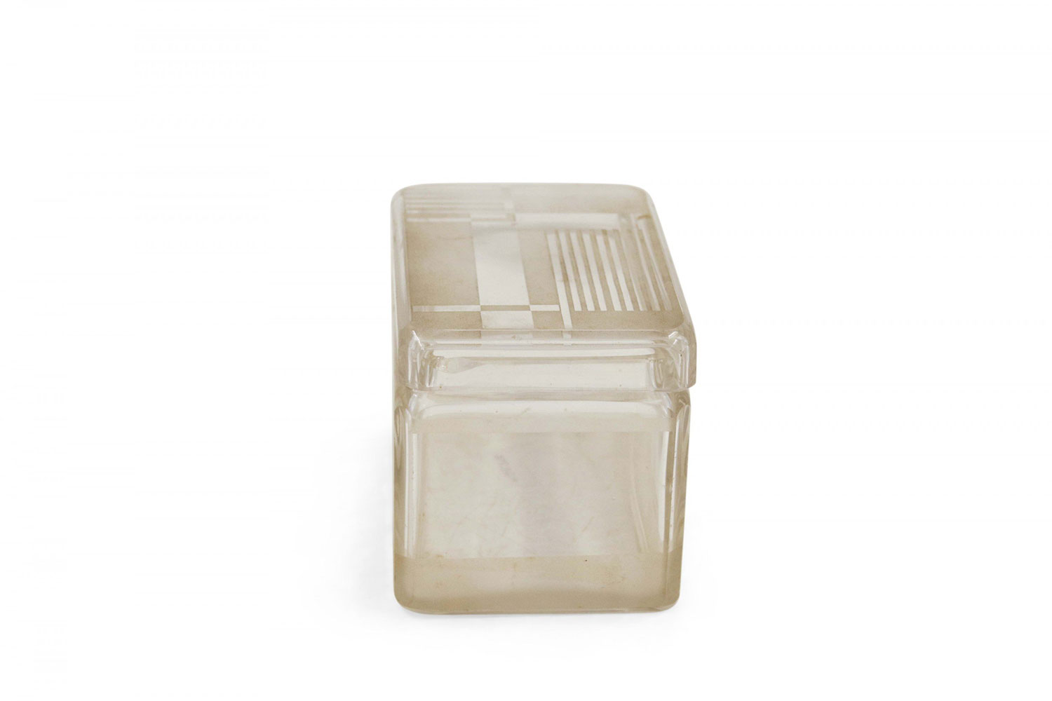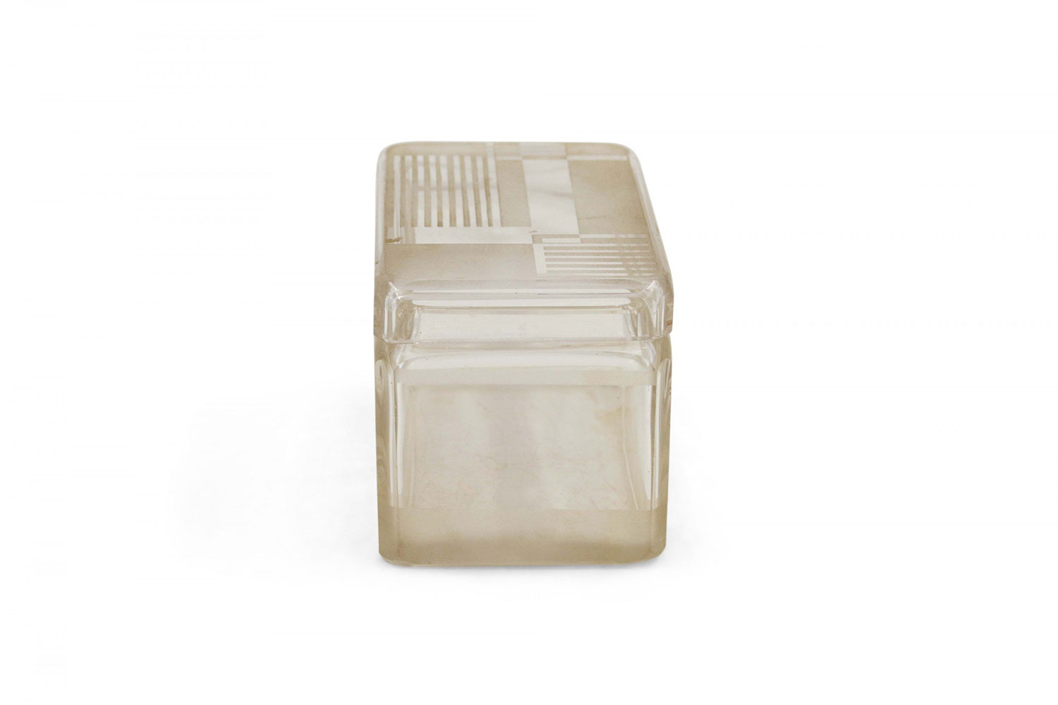 French Art Deco frosted rectangular glass box with rounded edges and an incised top with geometric designs and a hallmark at base..