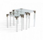 SET of 3 French Mid-Century (Circa 1970) Lucite nesting tables with accented metal hardware and glass shelves. (Manner of MAISON JANSEN) (Related Items: NWL090).