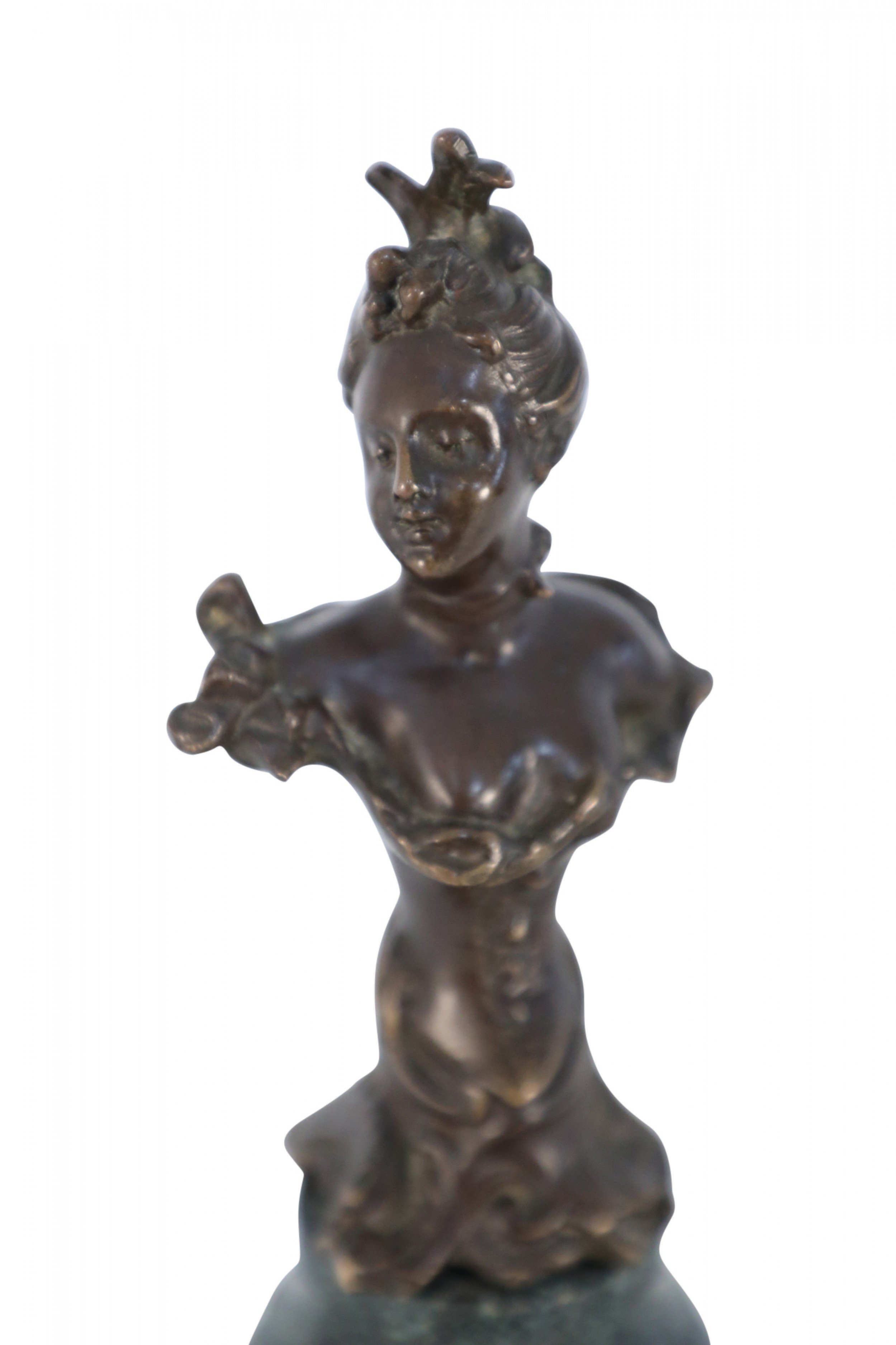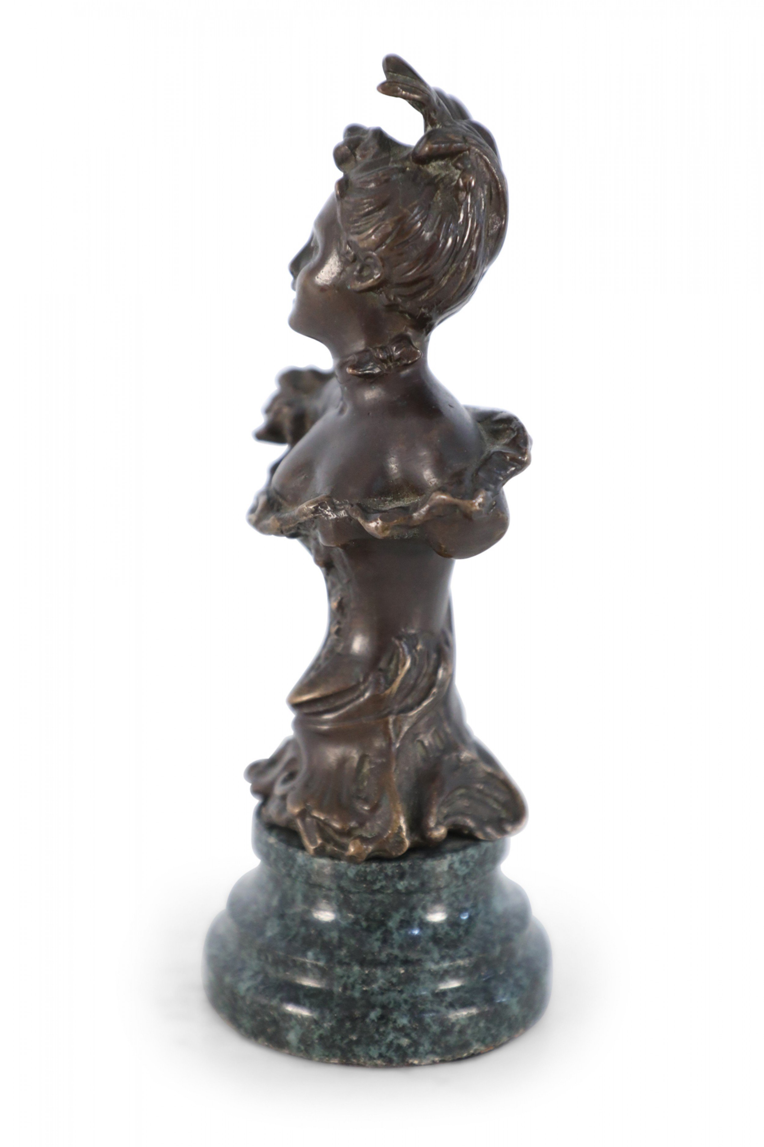 French Victorian small bronze bust form (paperweight) depicting a lady in high dress on a circular green marble pedestal base.