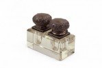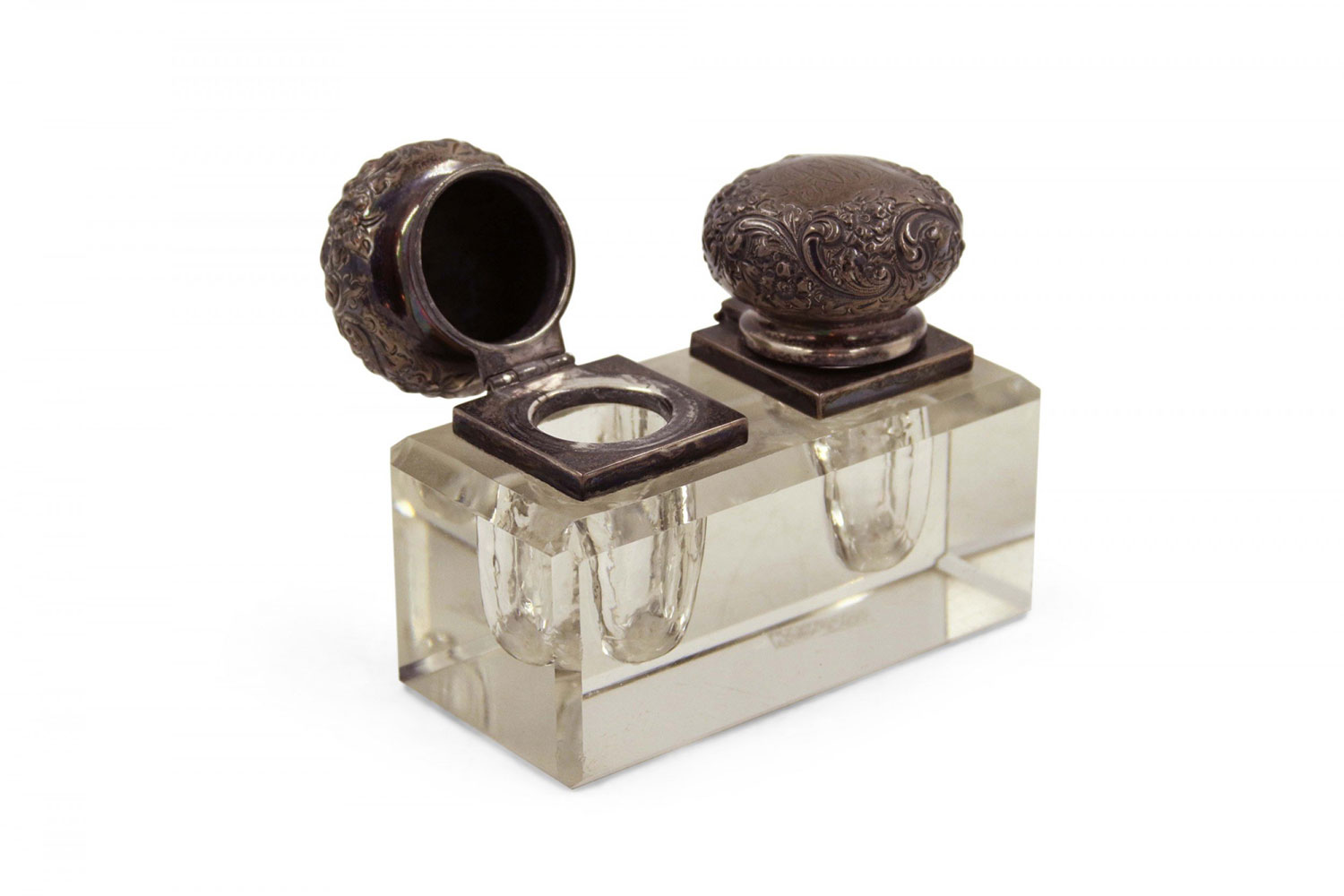 French Victorian rectangular double glass inkwell with incised monogrammed sterling silver hinged lids. (Hallmarked)