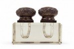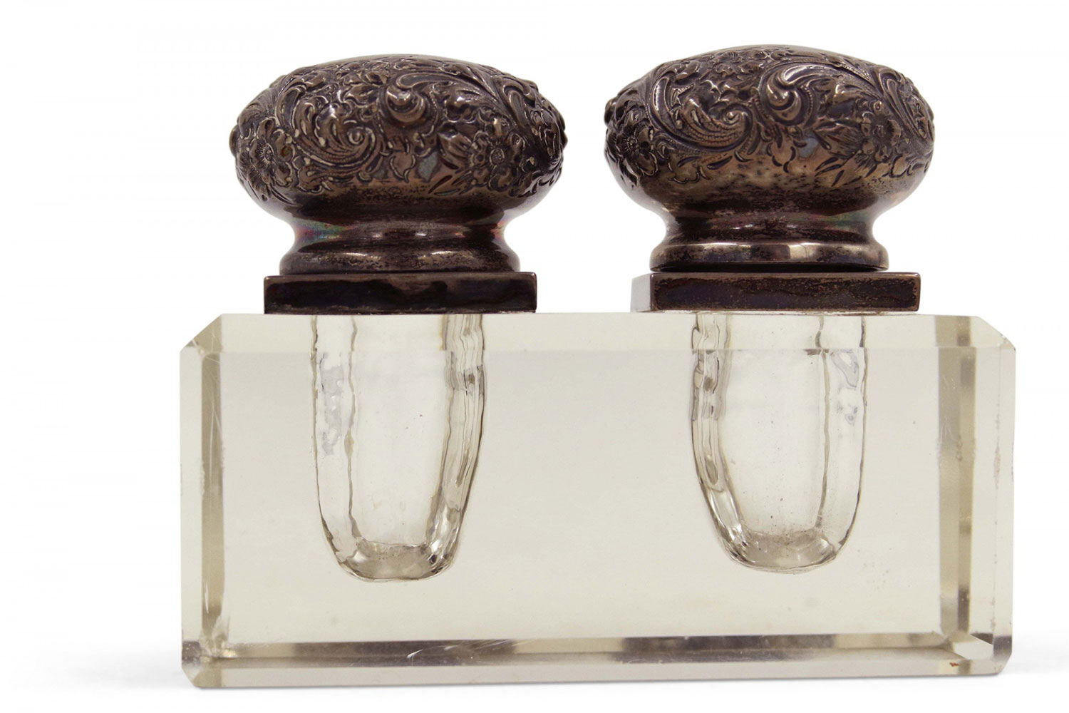 French Victorian rectangular double glass inkwell with incised monogrammed sterling silver hinged lids. (Hallmarked).