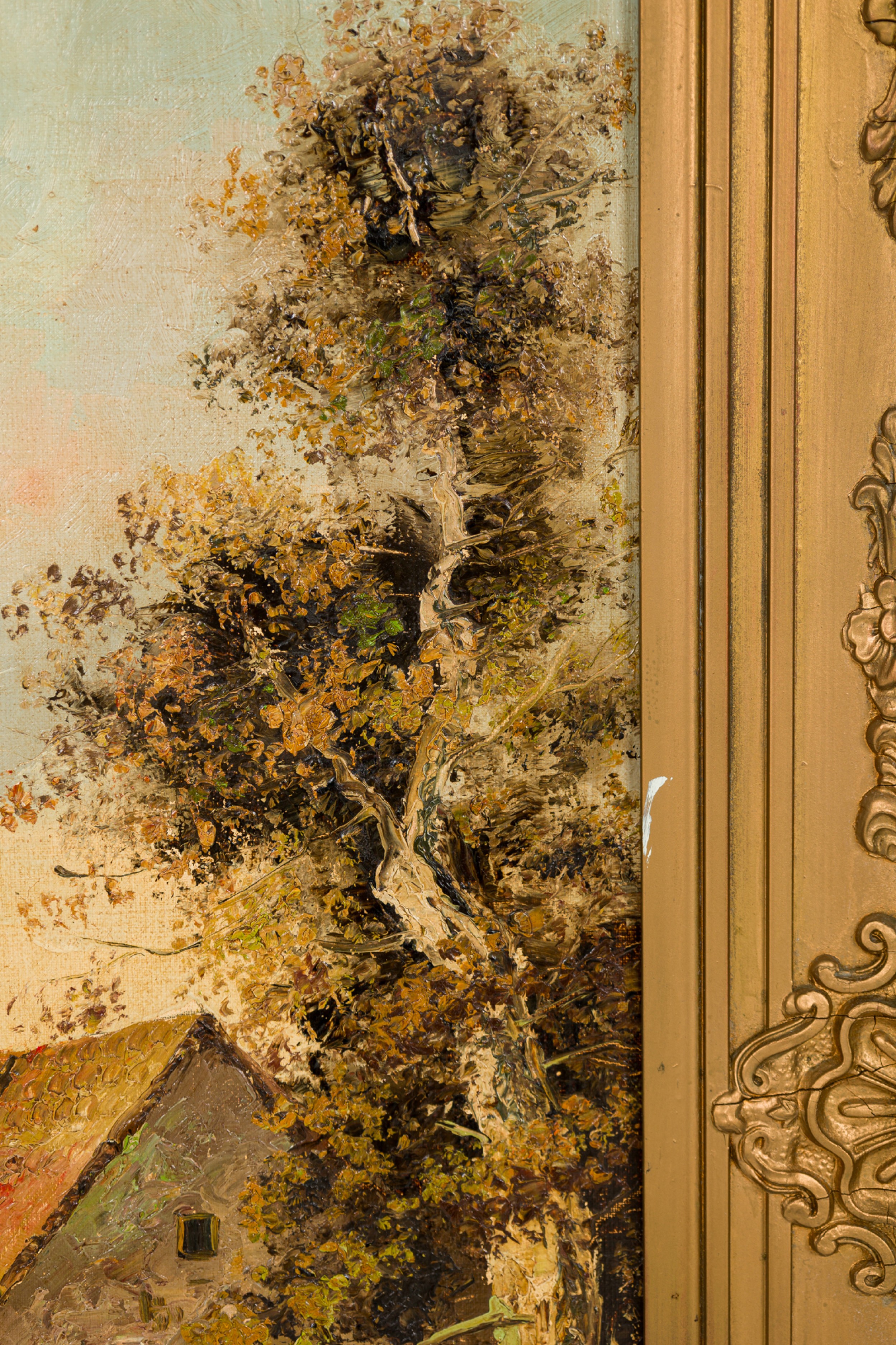 French Impressinist style landscape painting of homes near a pond in a carved gold frame (signed ?)