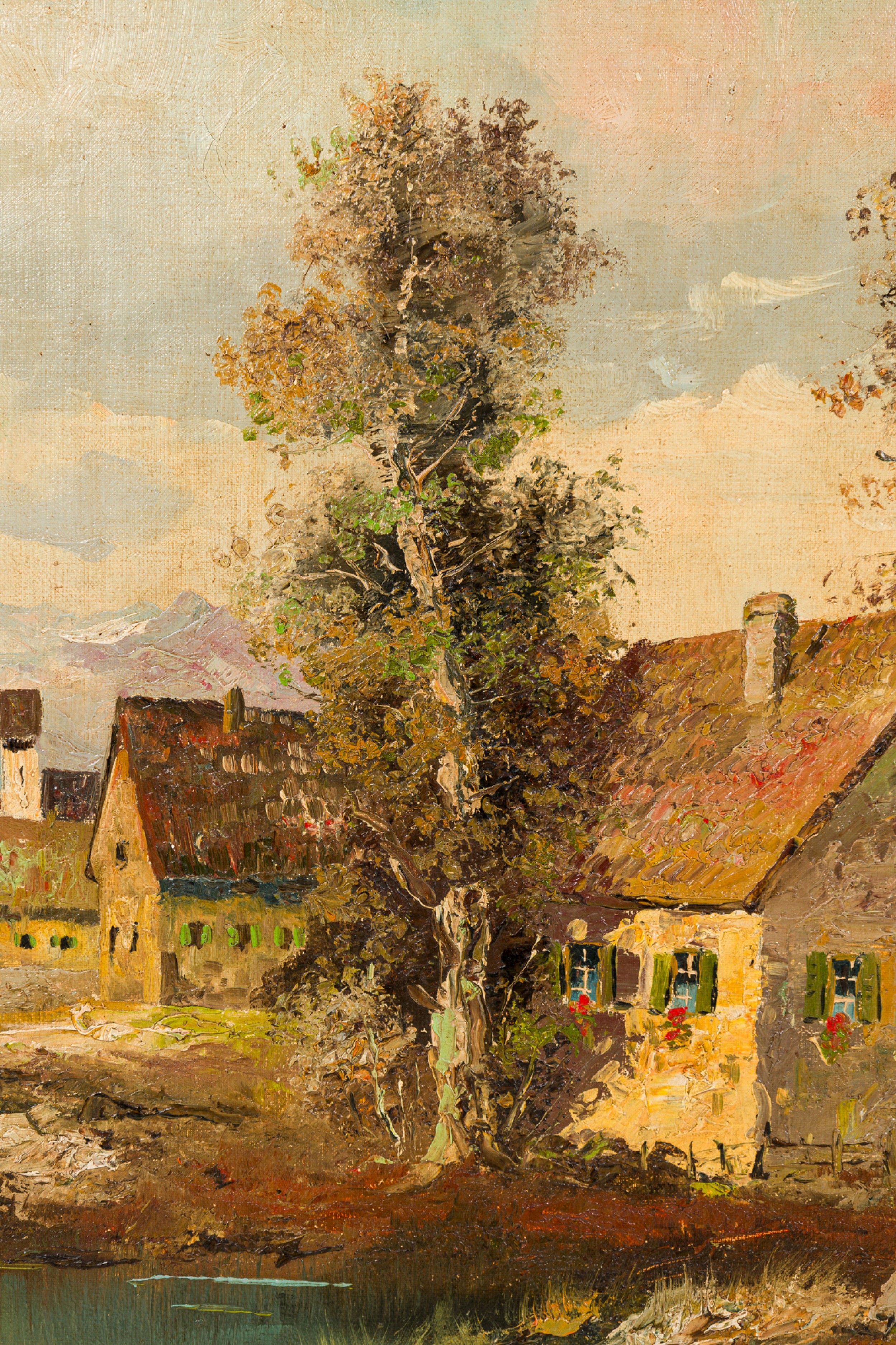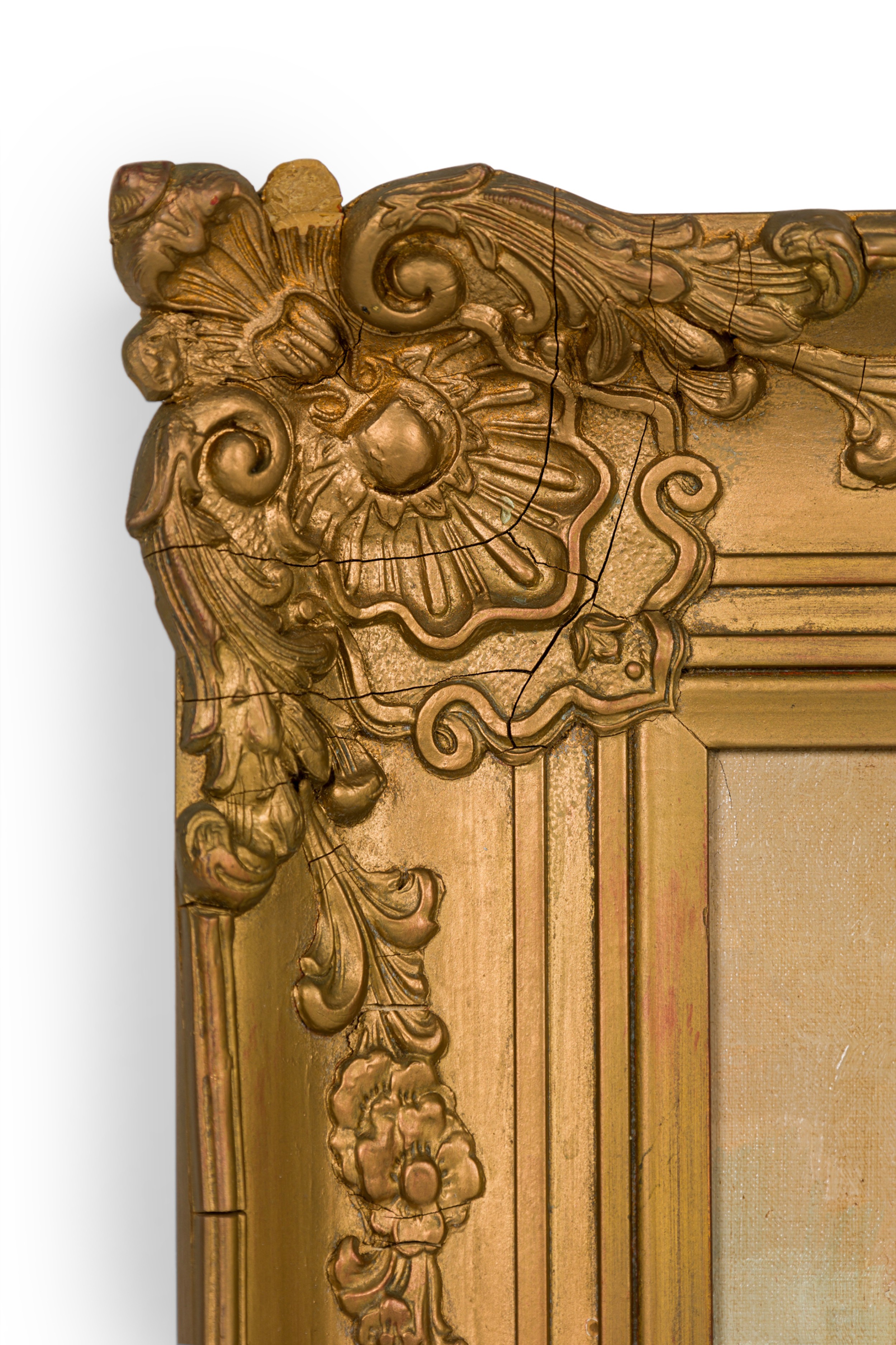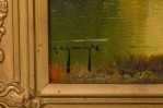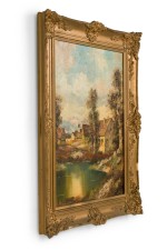 French Impressinist style landscape painting of homes near a pond in a carved gold frame (signed ?).