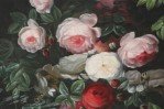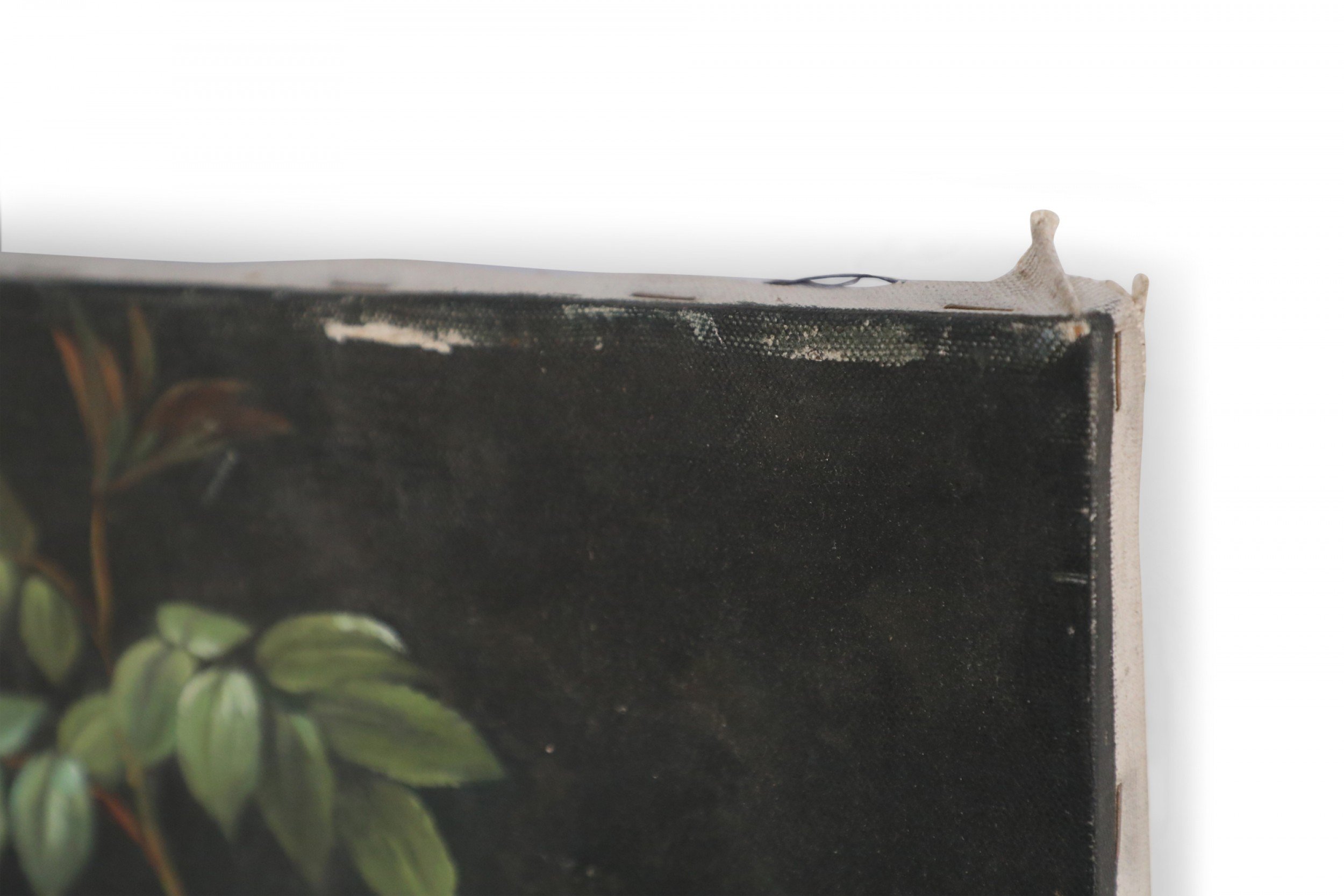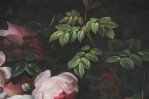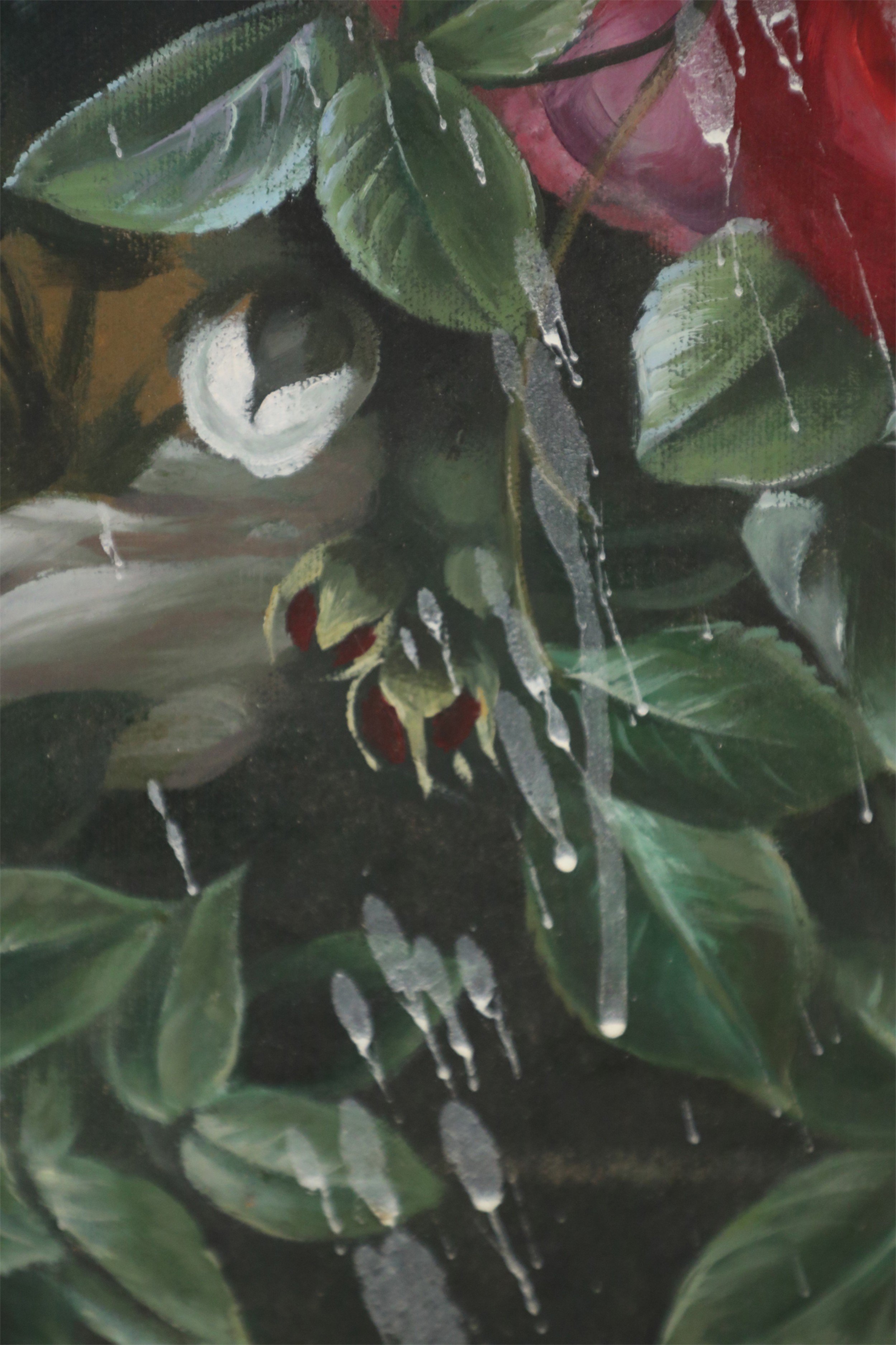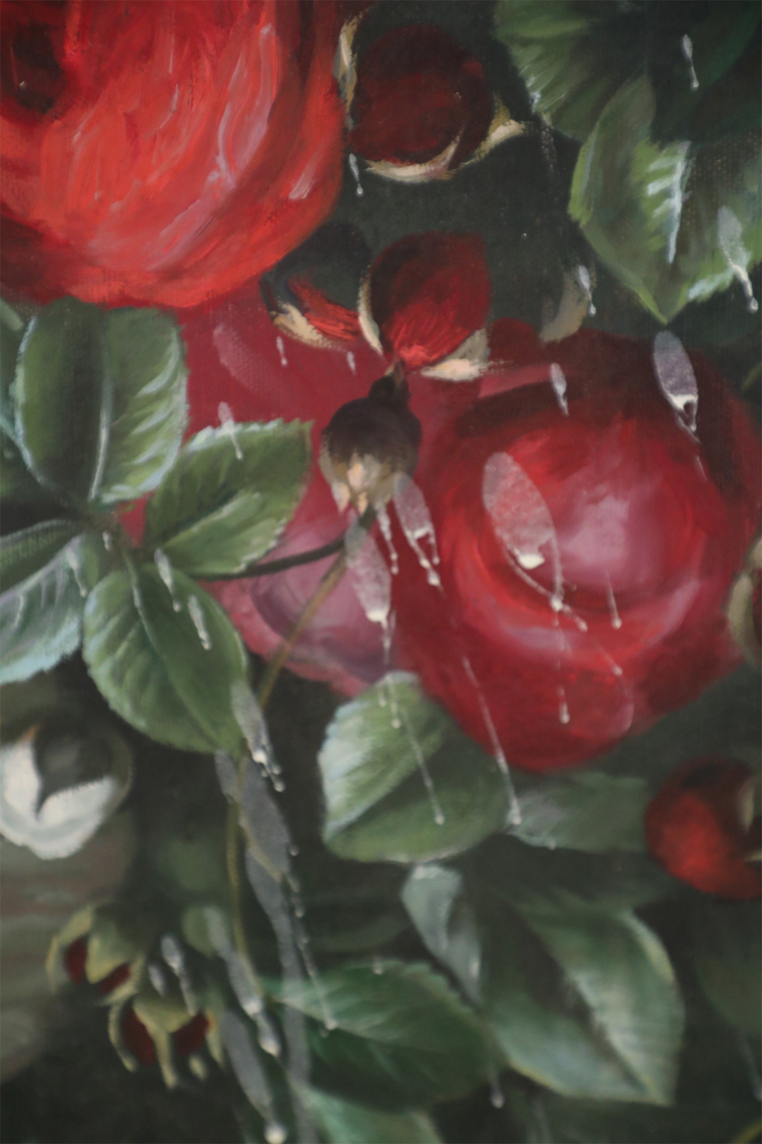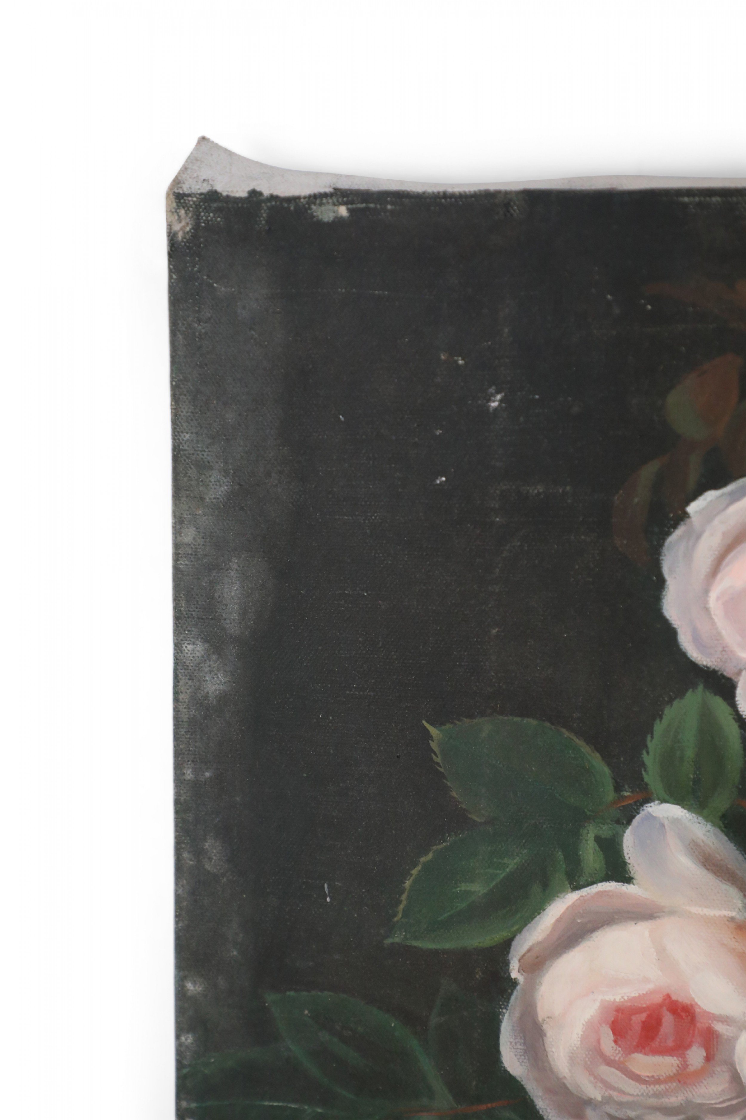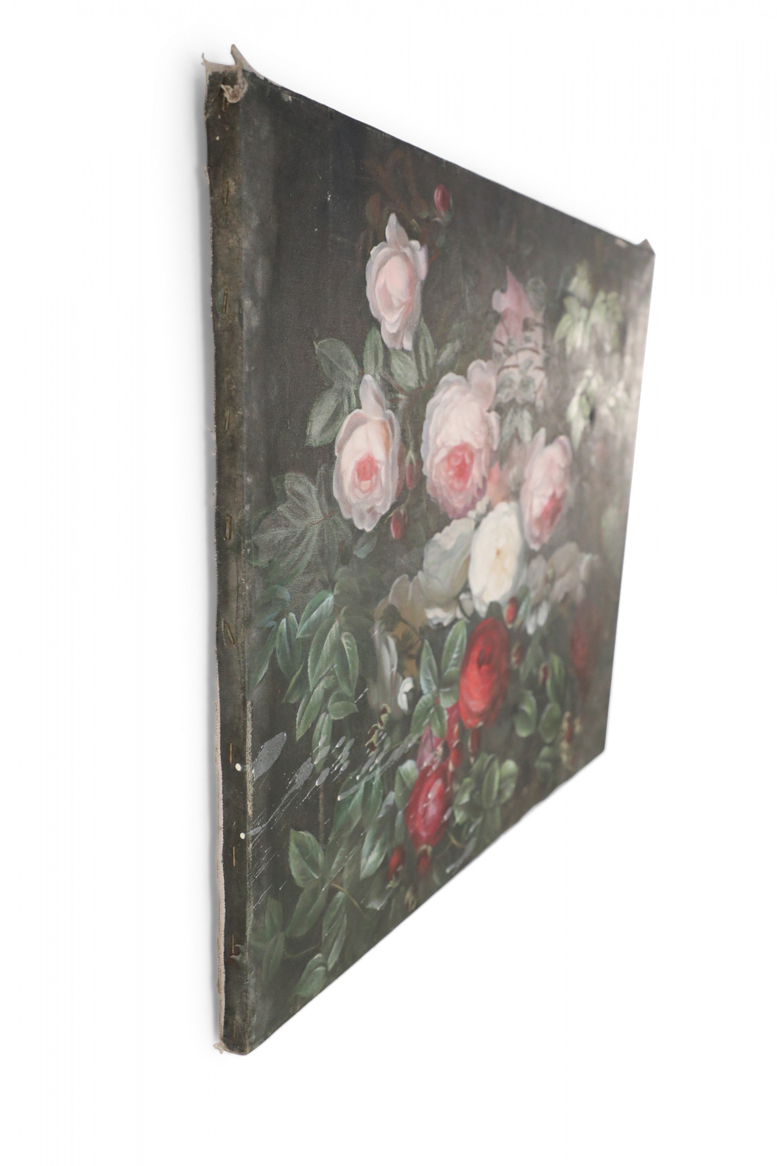 Italian Neo-classic style (20th Century) oil painting capturing the romance of opened and blooming garden roses amid a lush and verdant background, painted on rectangular, unframed canvas.