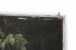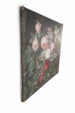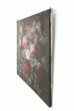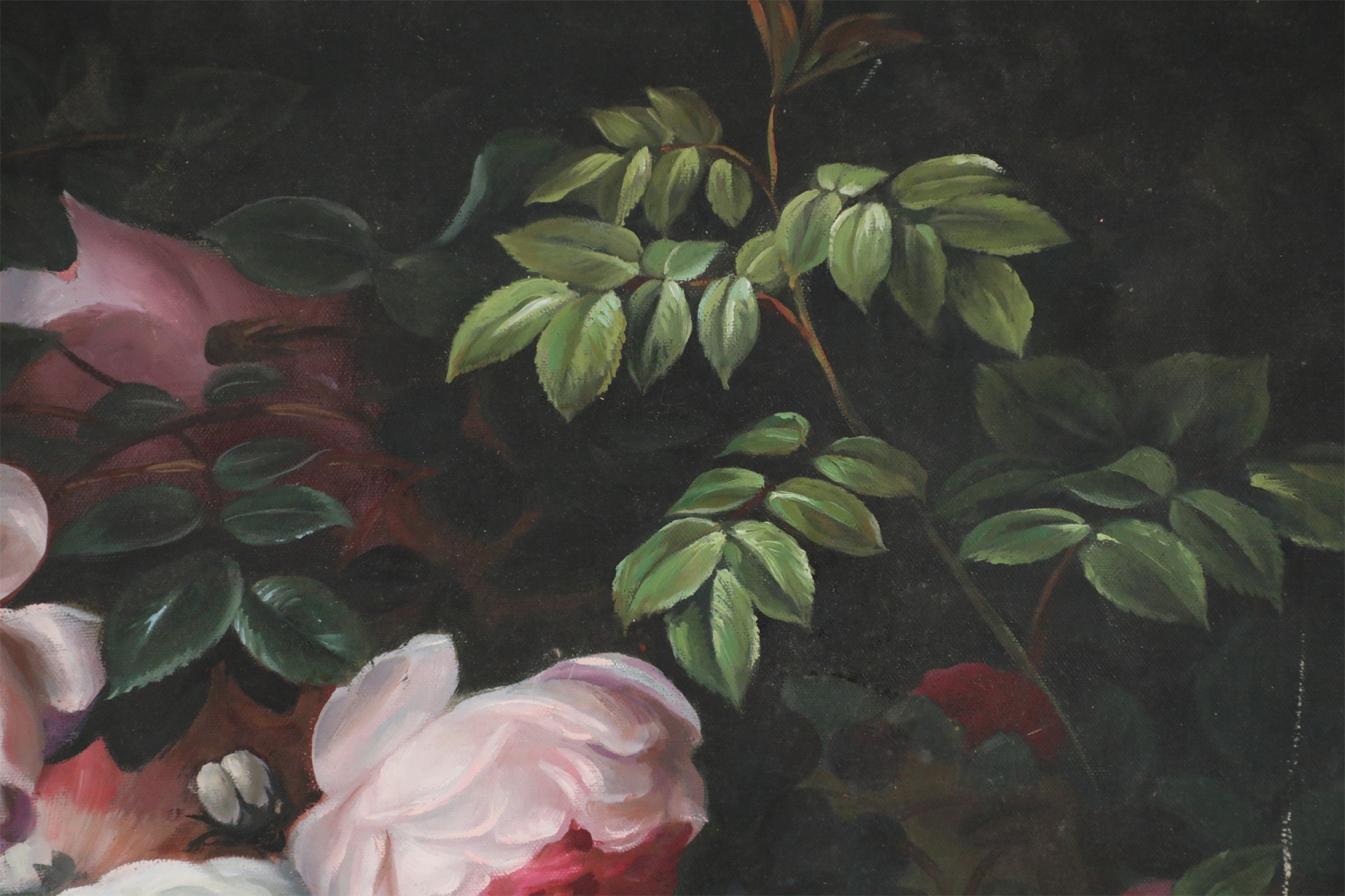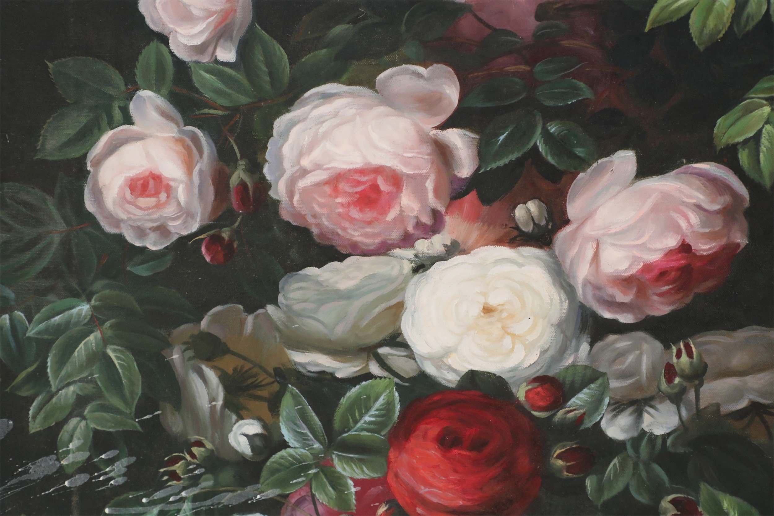 Italian Neo-classic style (20th Century) oil painting capturing the romance of opened and blooming garden roses amid a lush and verdant background, painted on rectangular, unframed canvas..