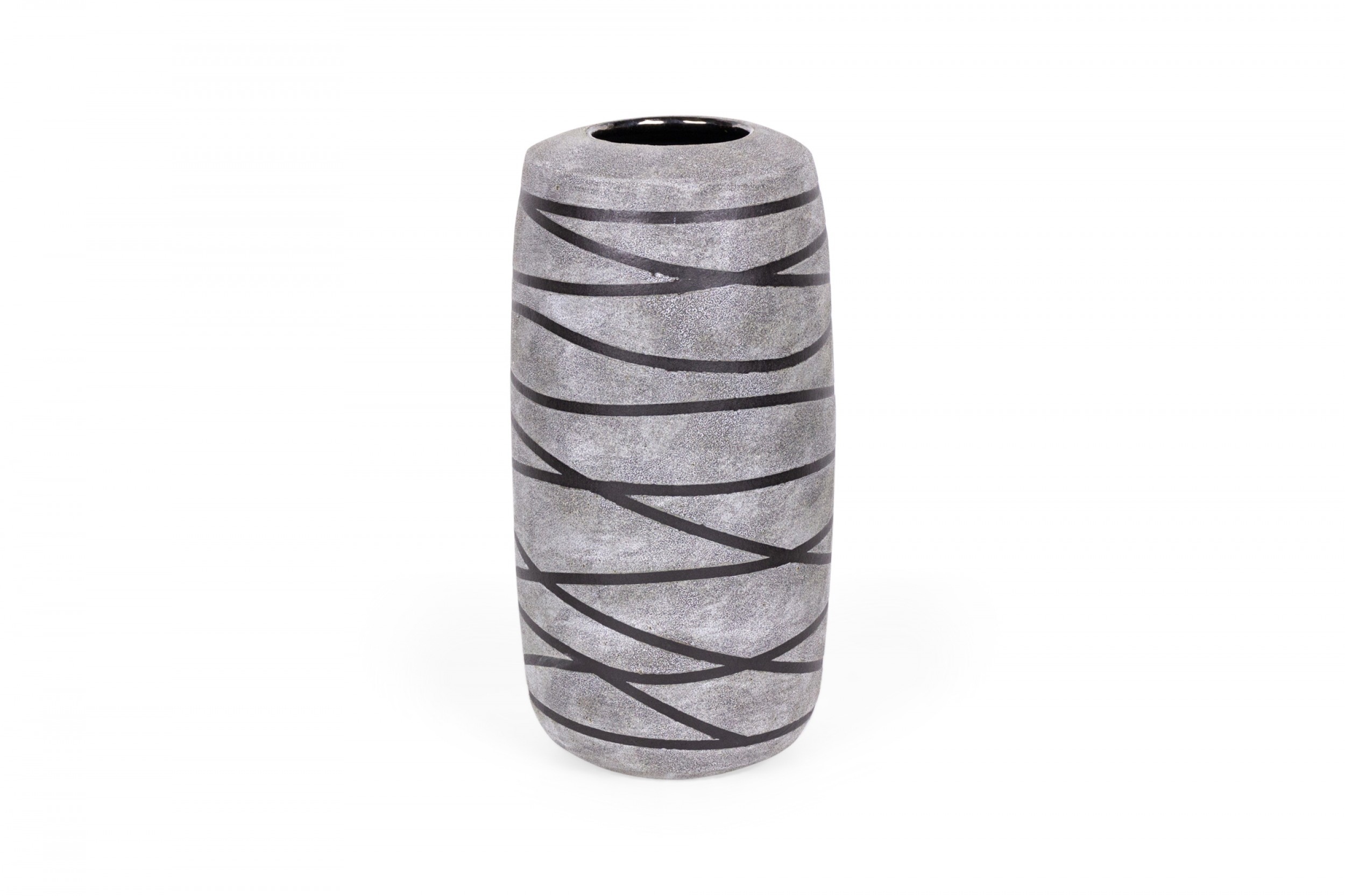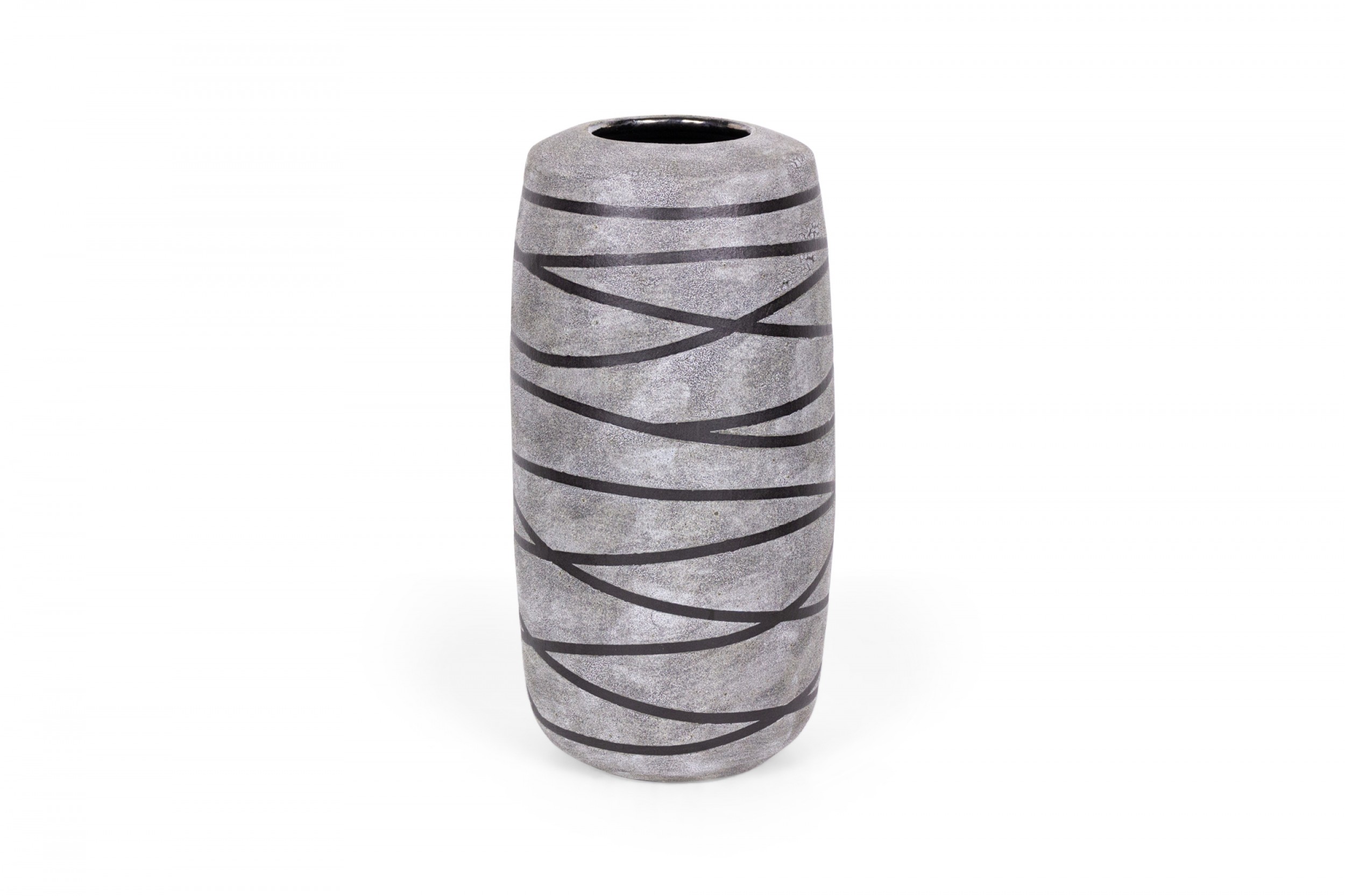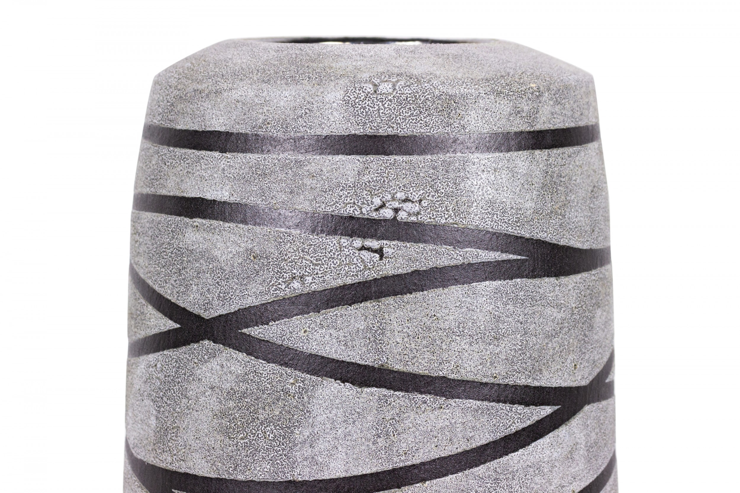Contemporary thrown tall ceramic vase with a gray and black striped pattern and textured finish. (GARY DIPASQUALE)